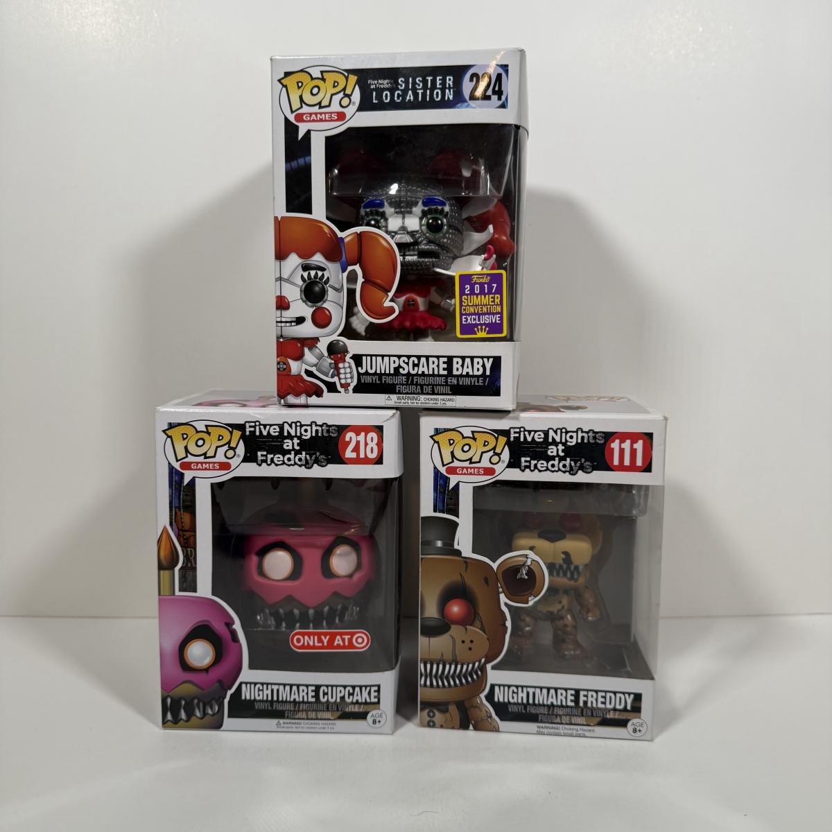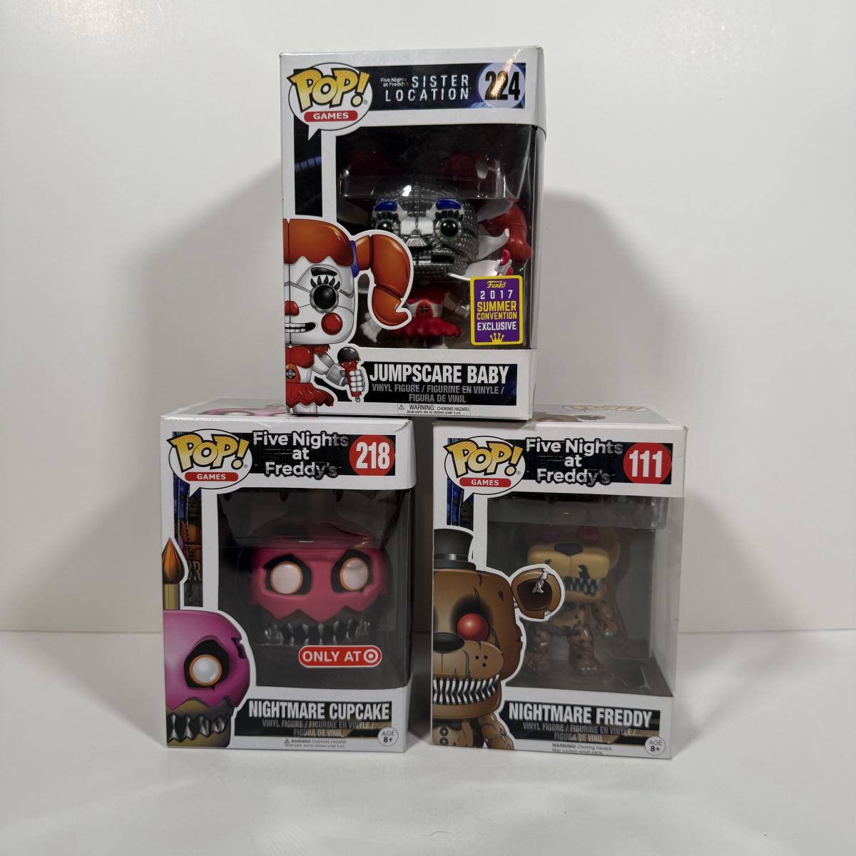 LOT 176: Three Five Nights at Freddy's Funko Pops: Nightmare Cupcake (218), Nightmare Freddy (111), & Jumpscare Baby (224)