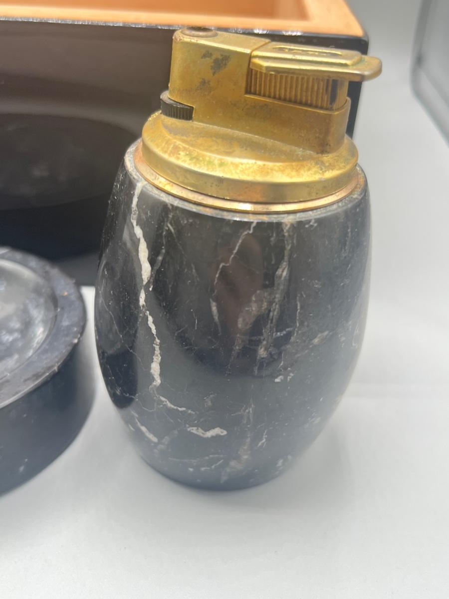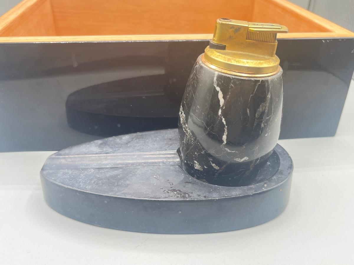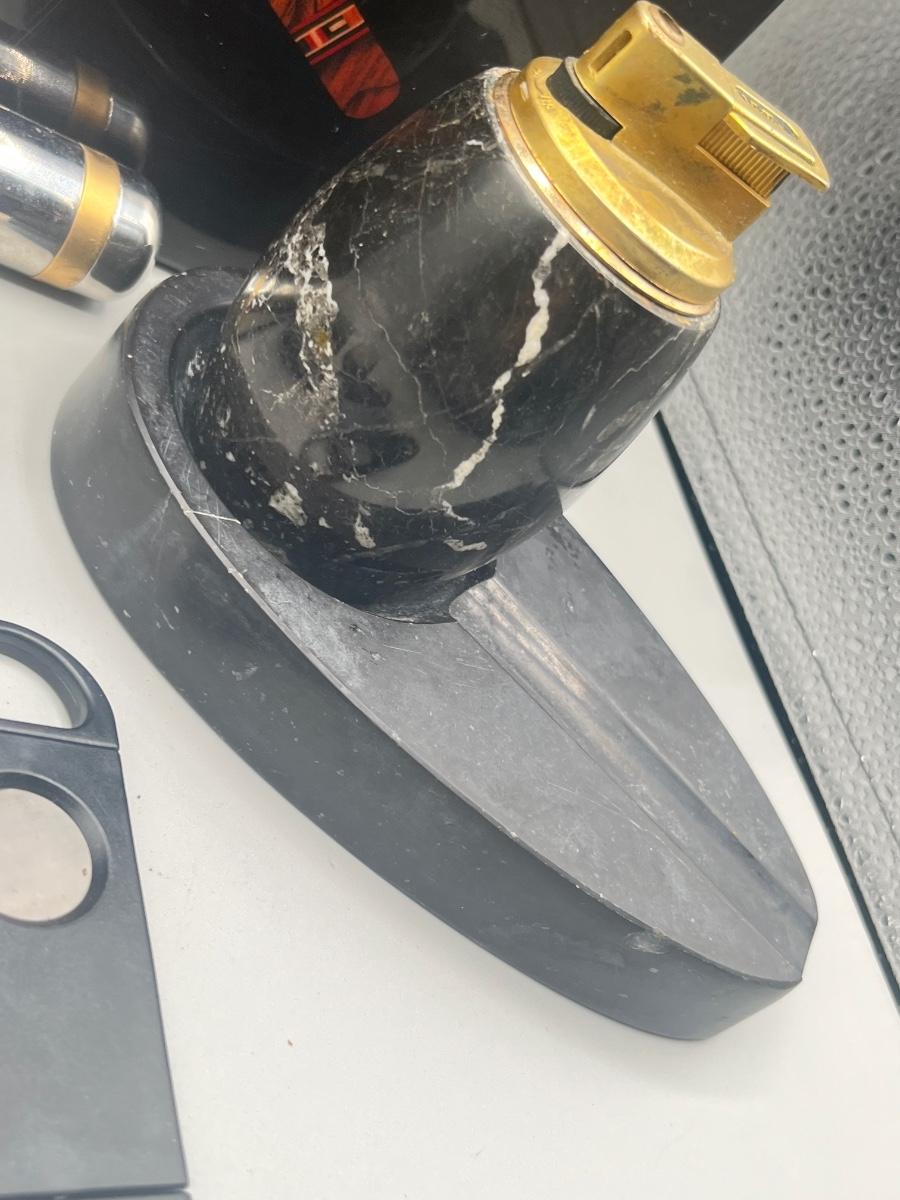 LOT 189: Cigar Afficianado Collection - Humidor, Zippo and Proetheus Lighters, Faux Mable Cigar Lighter With Ashtray and More