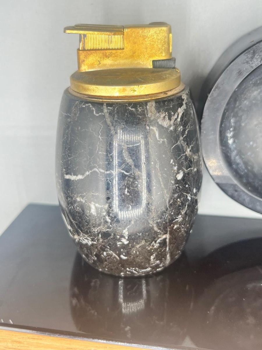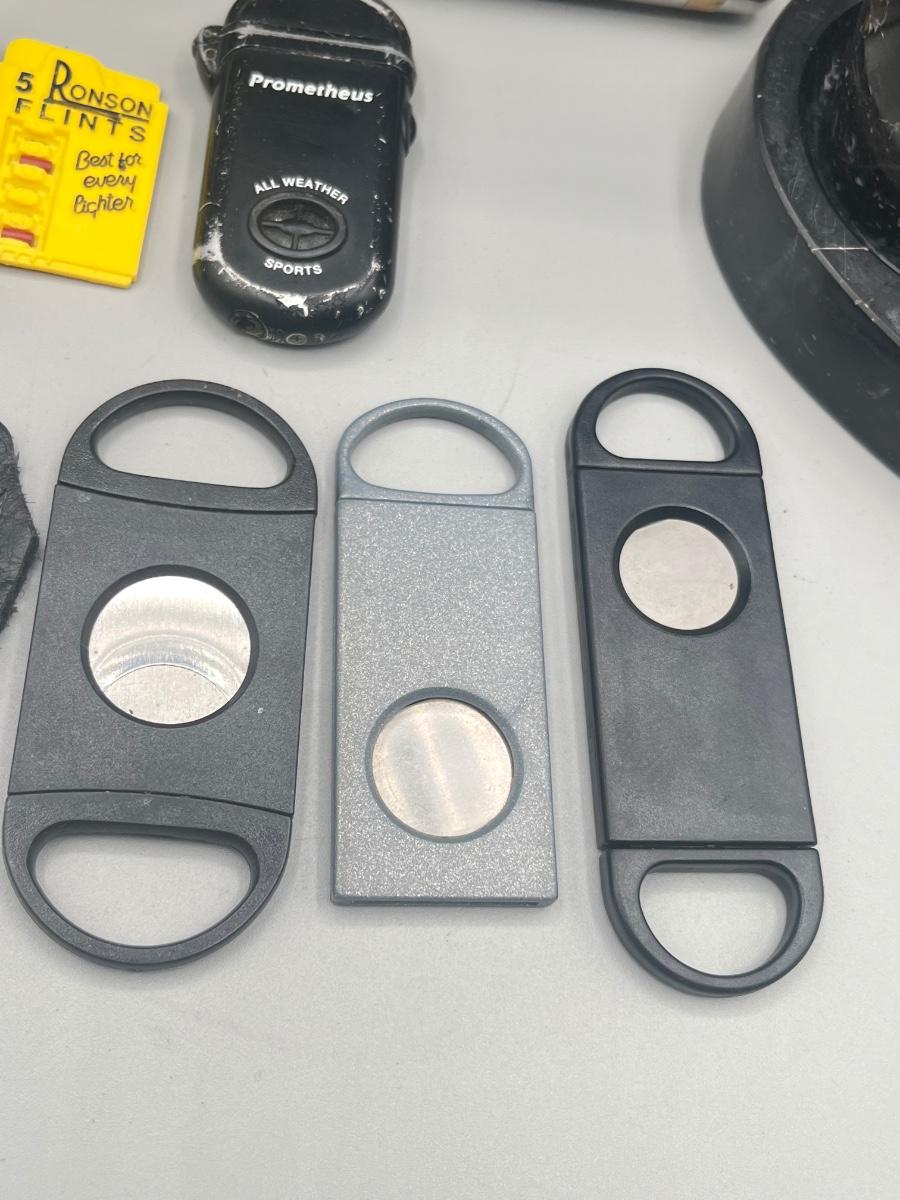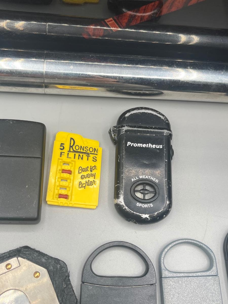 LOT 189: Cigar Afficianado Collection - Humidor, Zippo and Proetheus Lighters, Faux Mable Cigar Lighter With Ashtray and More