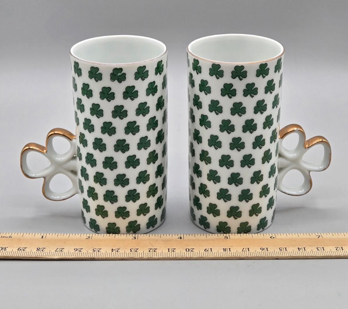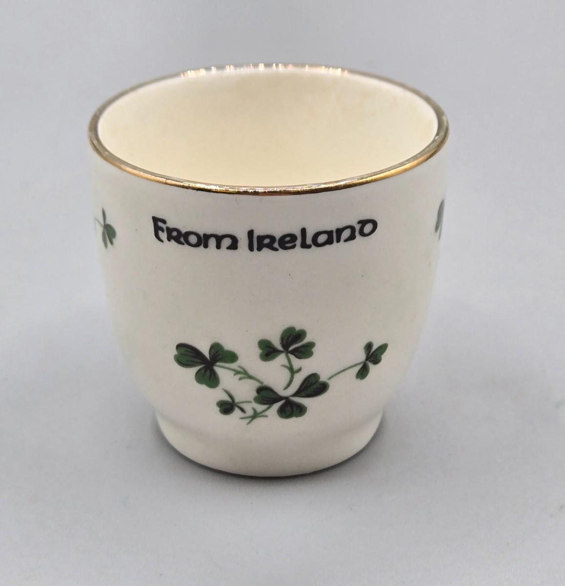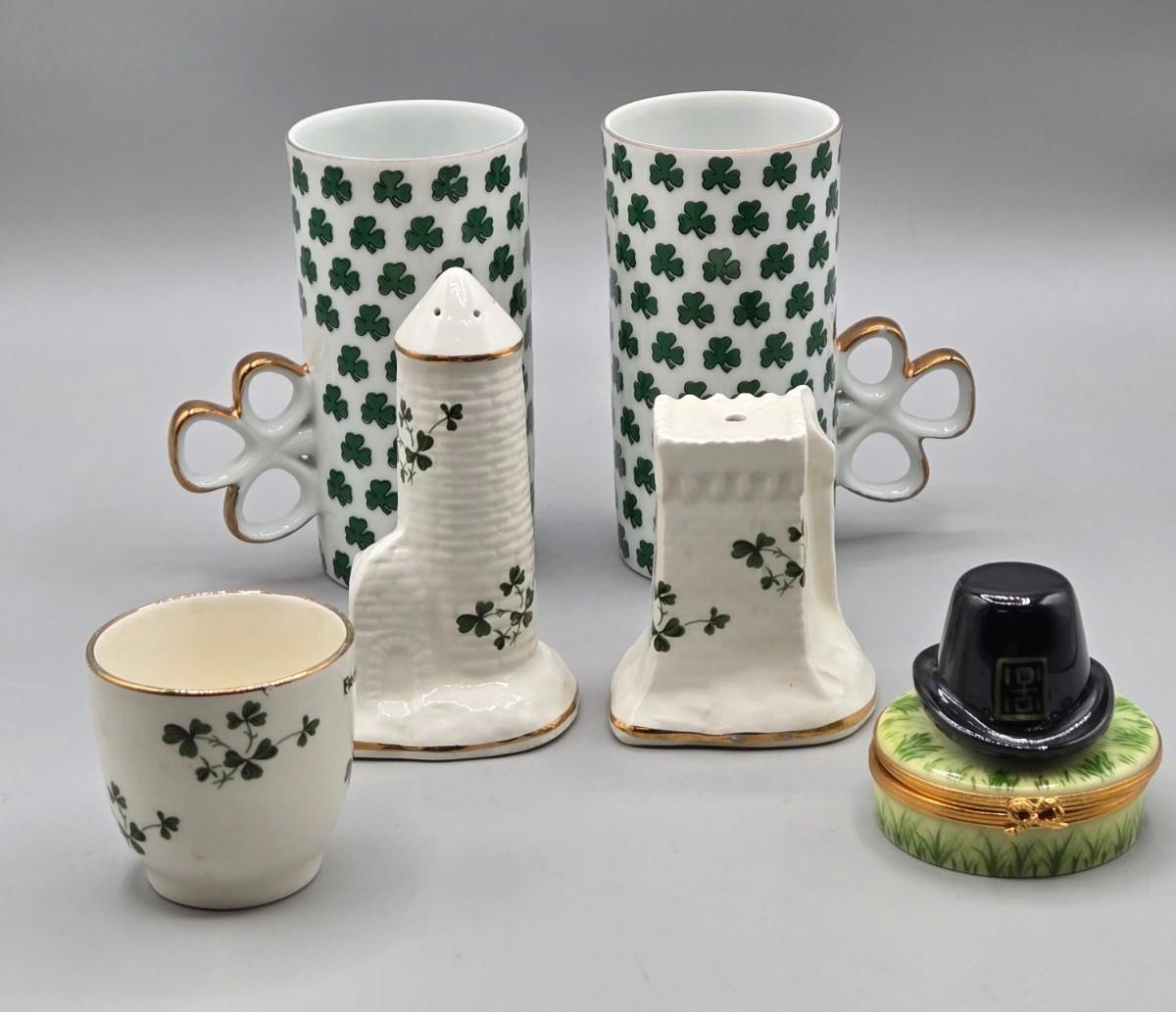 LOT 44: Vintage Carrigaline Pottery Irleand Shamrock Castle Salt & Pepper Shaker Set and Egg Holder, 2 Shamrock Green Clover Cafe Espresso Cups, and Pilgrim Hat Thanksgiving Limoges France Trinket Box