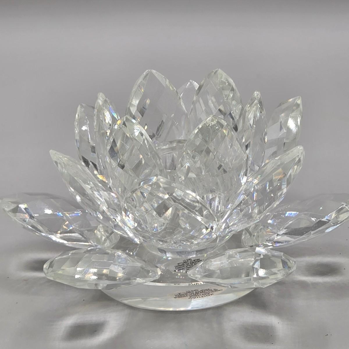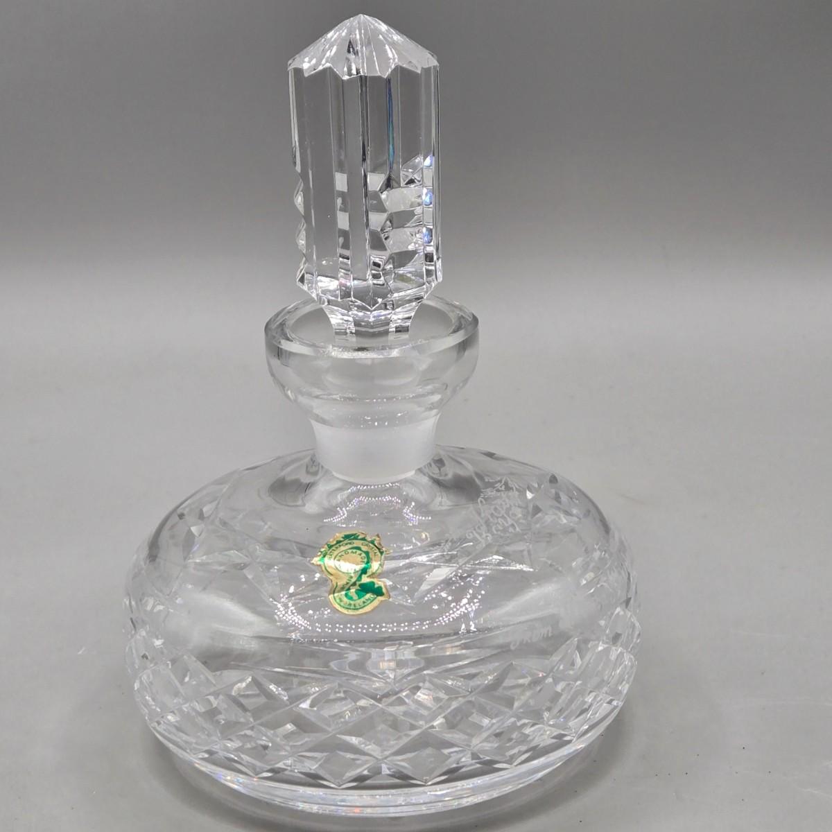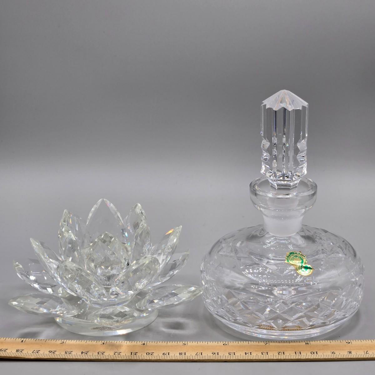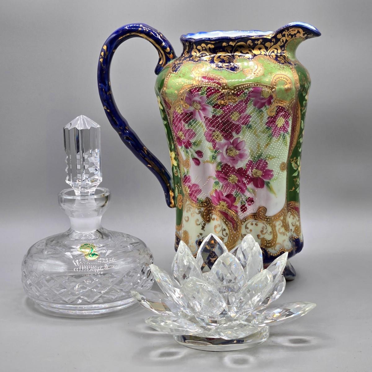 LOT 49: Vintage Porcelain Pitcher, Pair of Shannon Crystal Lotus Flower Candle Holders, and Waterford Crystal Perfume Bottle with Personalized Engraving