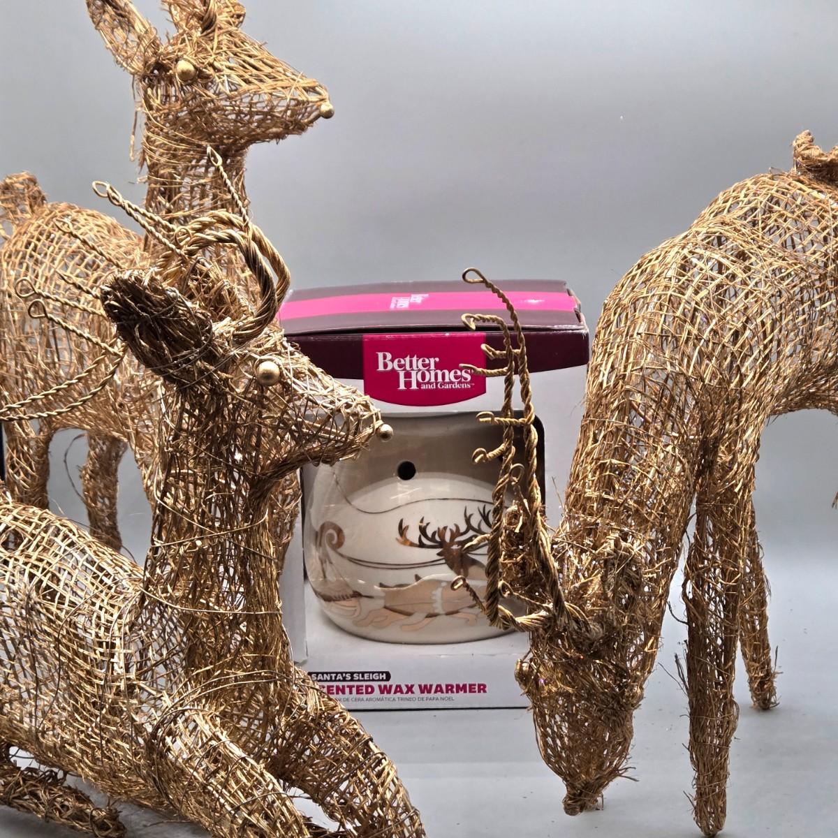 LOT 50: Better Homes & Gardens Santa Sleigh Reindeer Christmas Wax Warmer and Set of 3 Reindeer