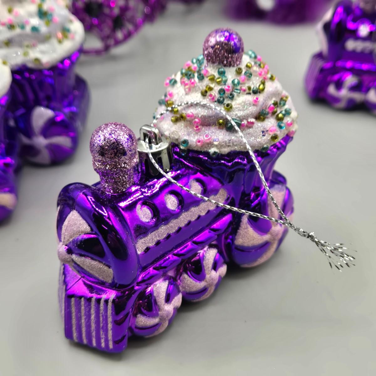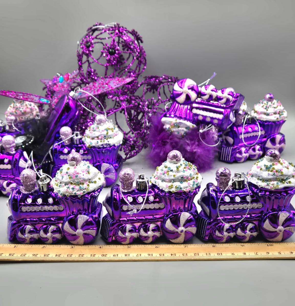 LOT 52: New Ornaments- Purple Cupcake Trains, Wire Balls, High Heel Shoe, Spirals with Bell, and More