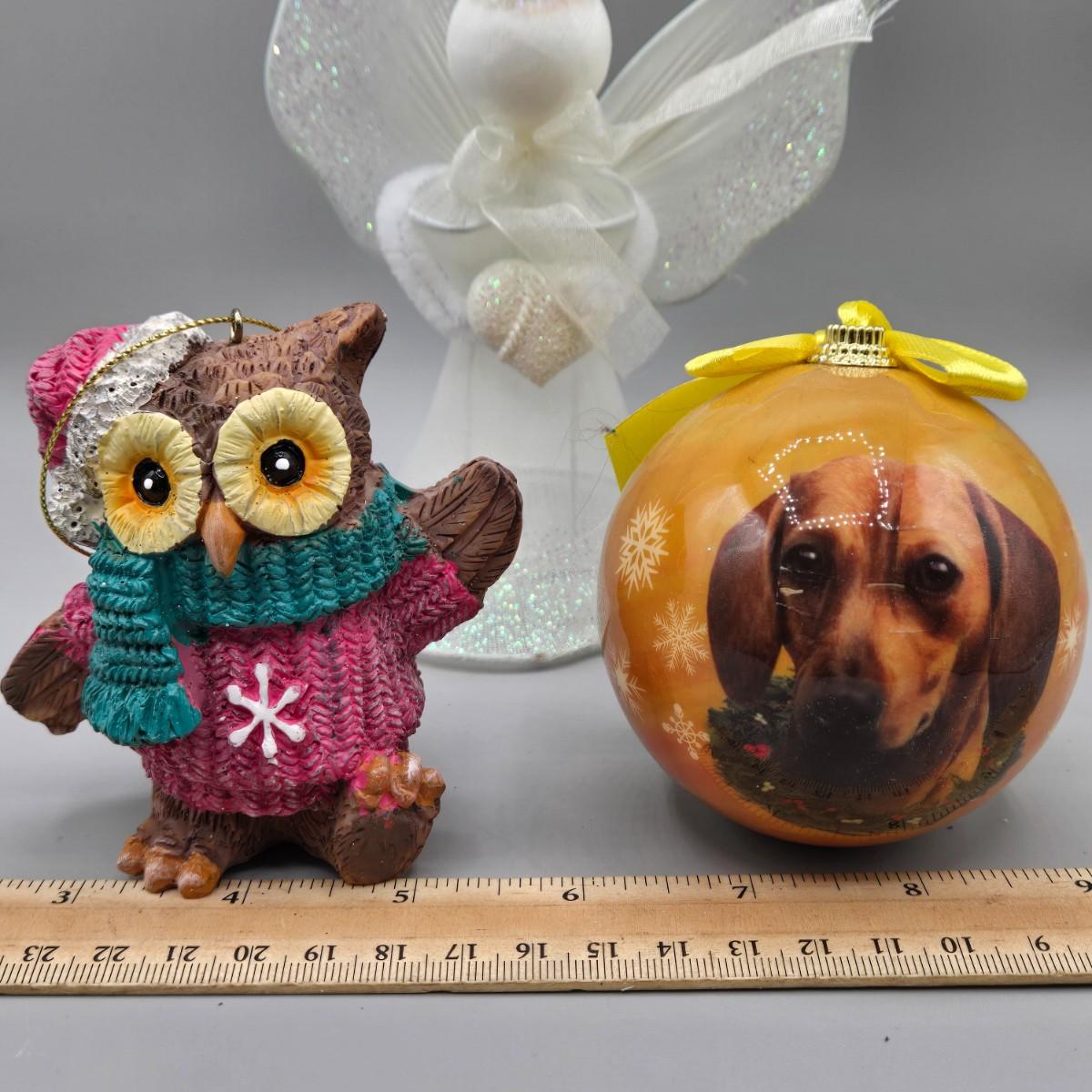 LOT 56: Various Ornaments Including Wooden Santa, Resin Owl, Silver-tone Angels, Dachshund, and More