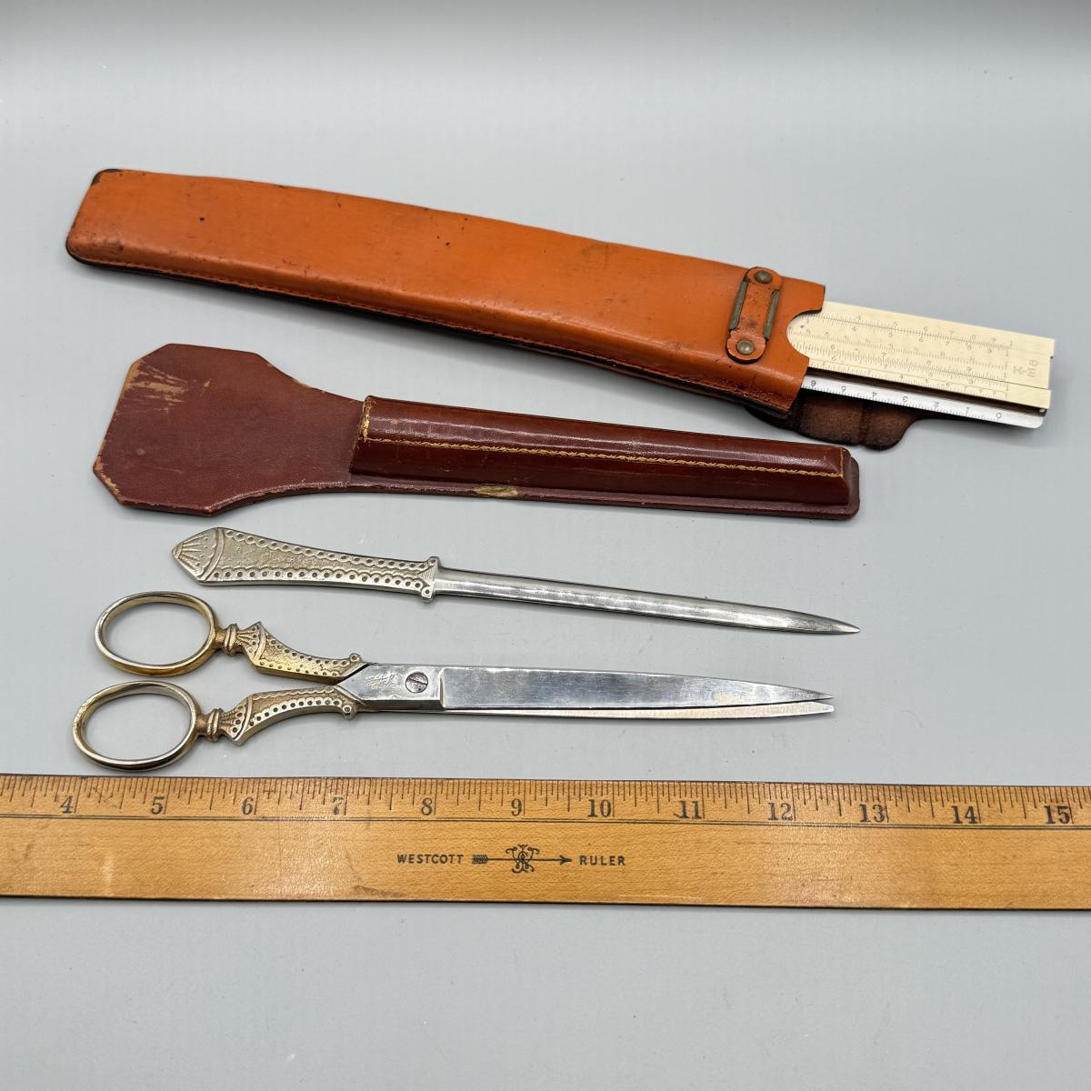 LOT 112: Vintage Griffon Scissors / Letter Opener Set in Lether case & Drafting Slide Ruler in Leather Case