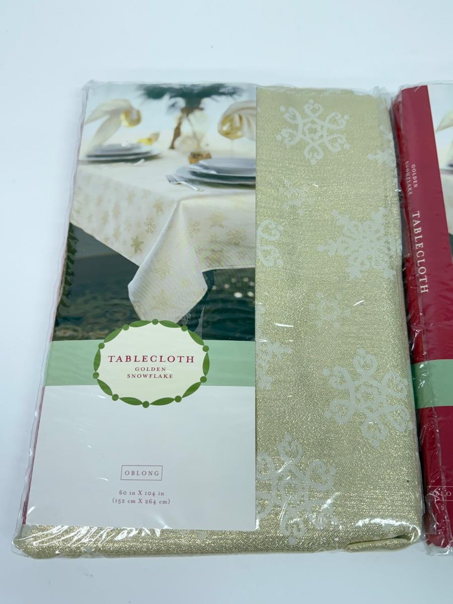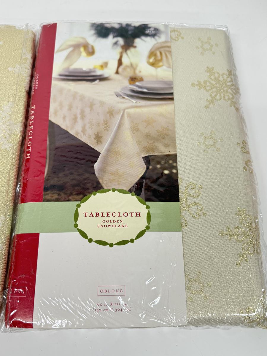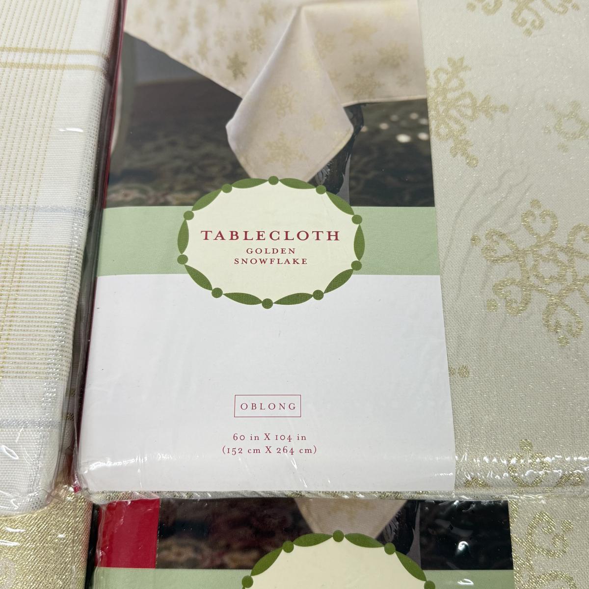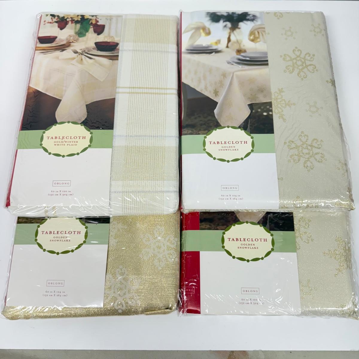 LOT 121: 4 NIP Oblong Golden Plaid and Snowflake Table Cloths