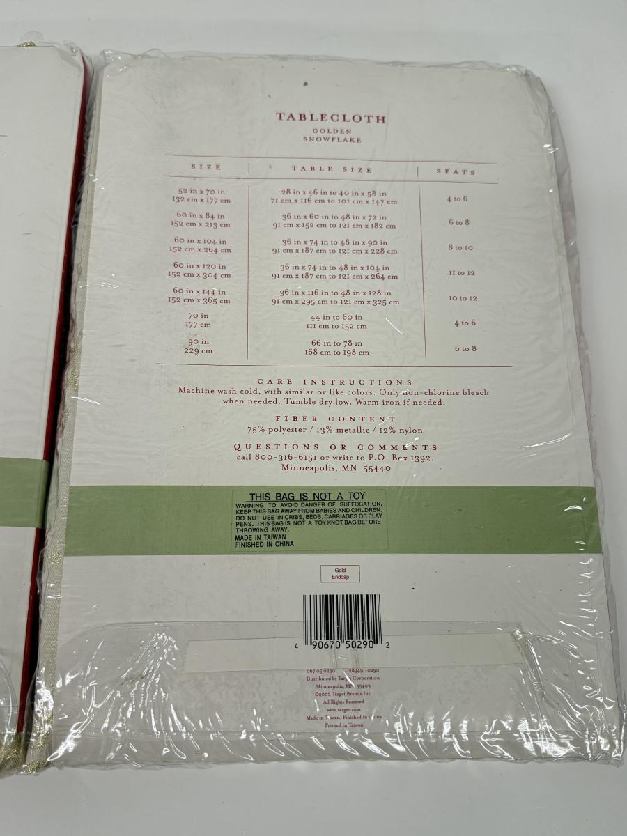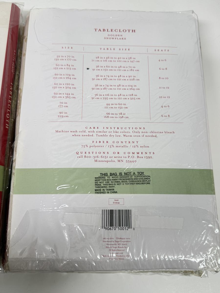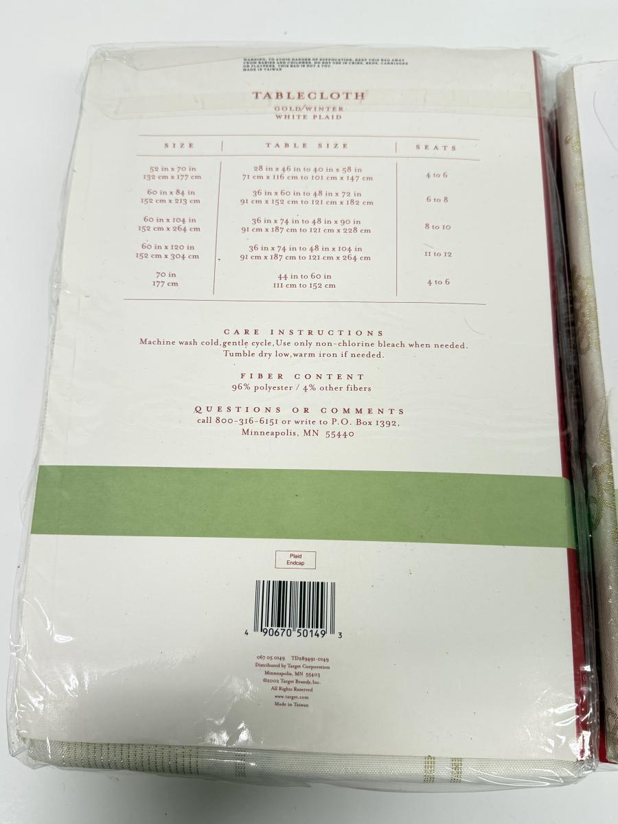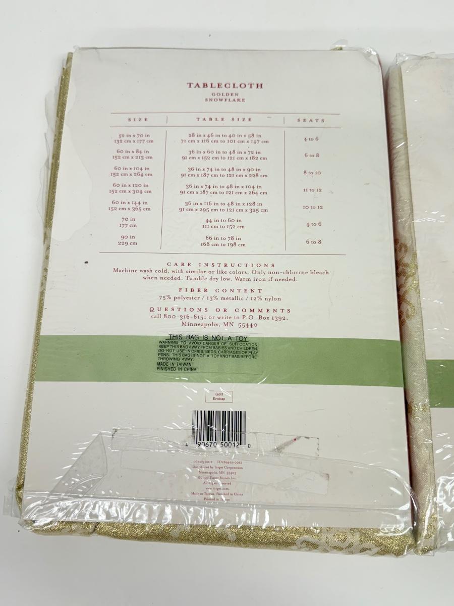 LOT 121: 4 NIP Oblong Golden Plaid and Snowflake Table Cloths