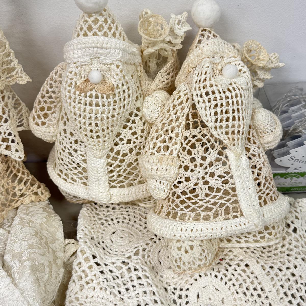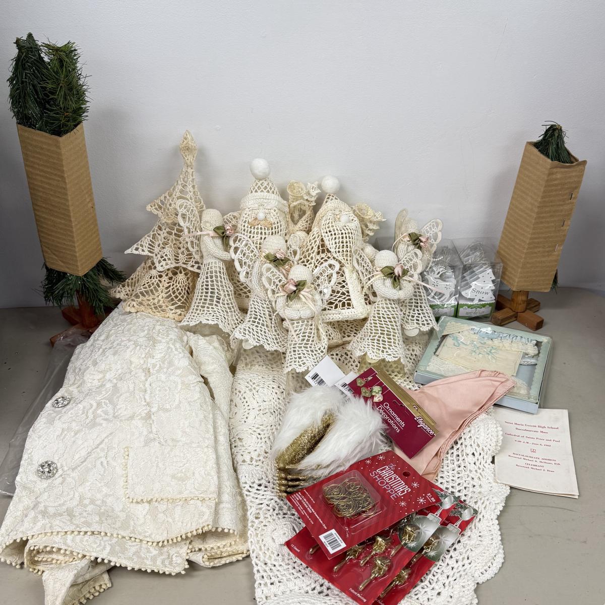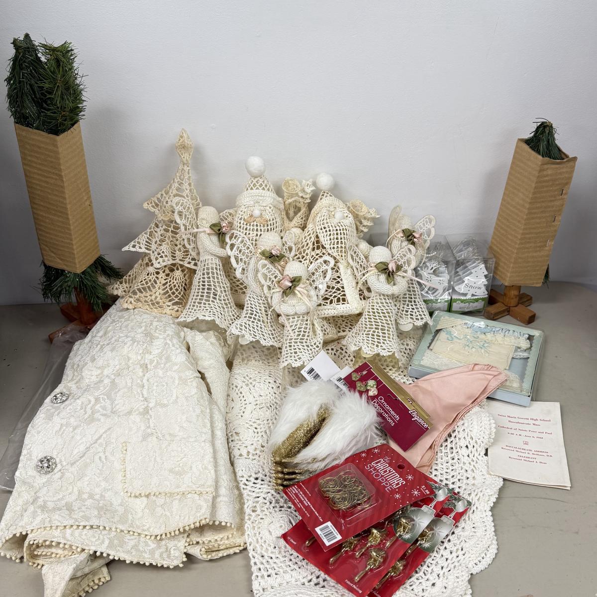 LOT 177: Vintage Lace Wedding Outfit, Crocheted Angels & Santa’s & More
