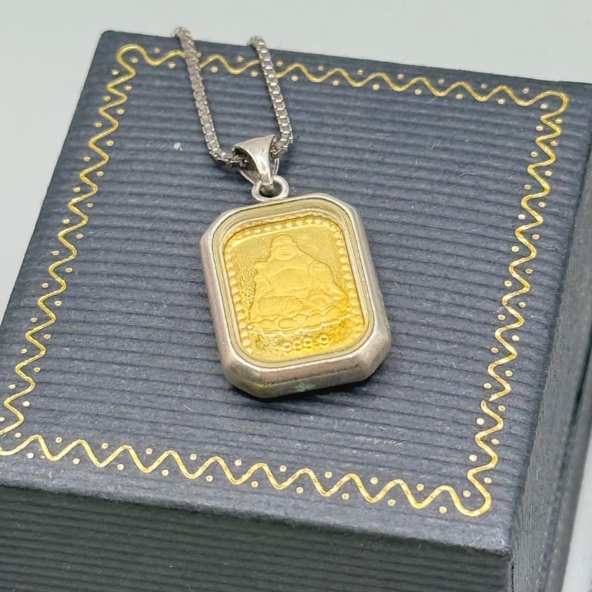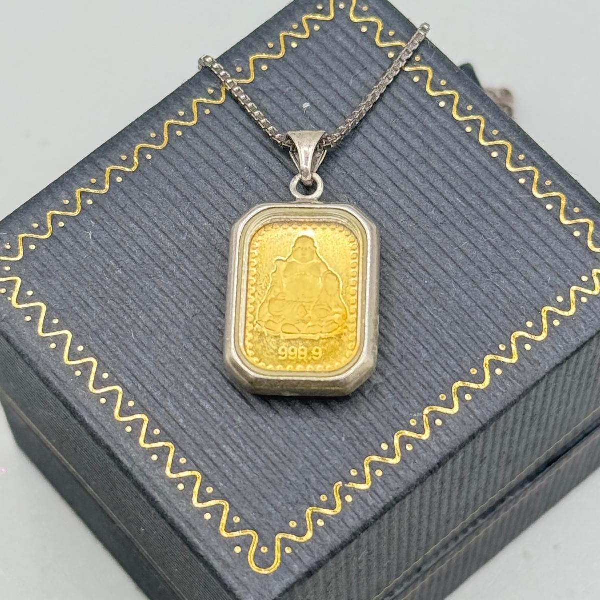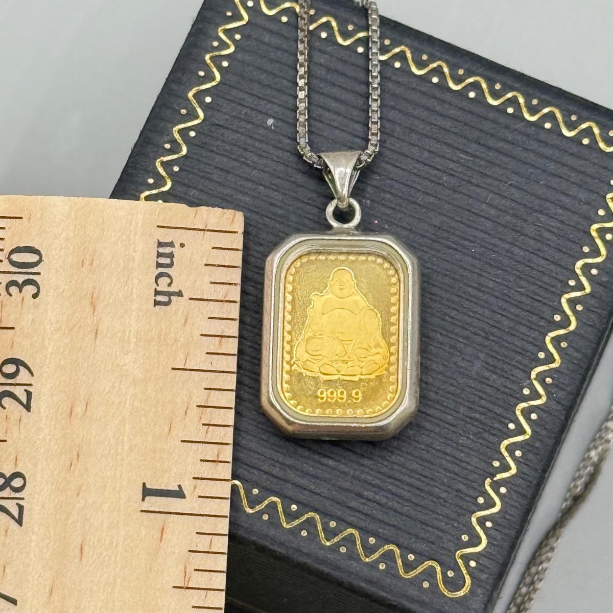 LOT 185: Sterling & Glass Encased Laughing Buddha .999 Gold Bar (4.9g) on 17” Sterling Chain (2.7g)