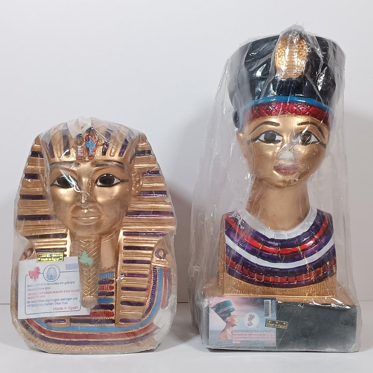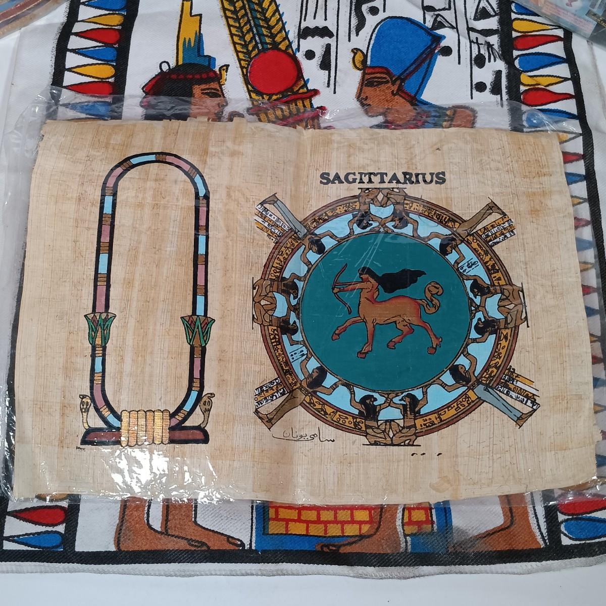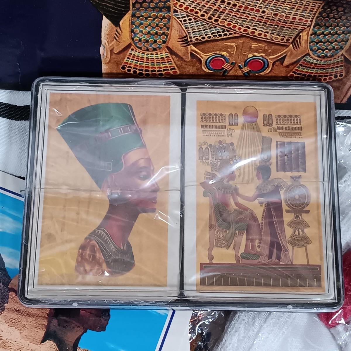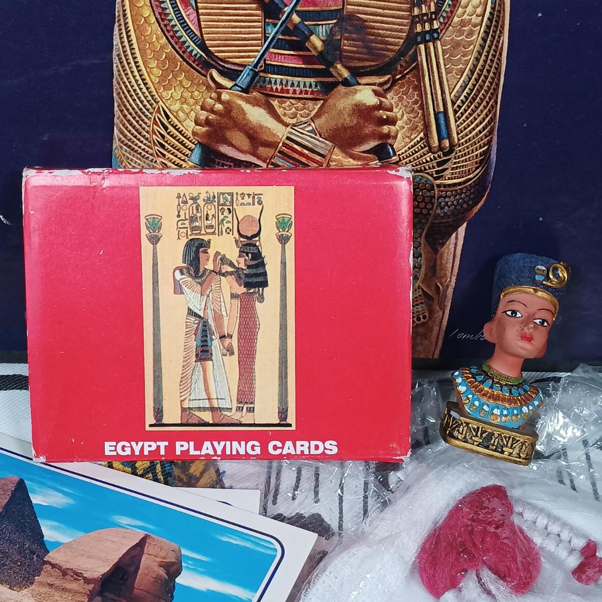 LOT 32: Chalkware Egyptian Statuary, Papyrus Sagittarius Painting, ITC Egypt Playing Cards & More