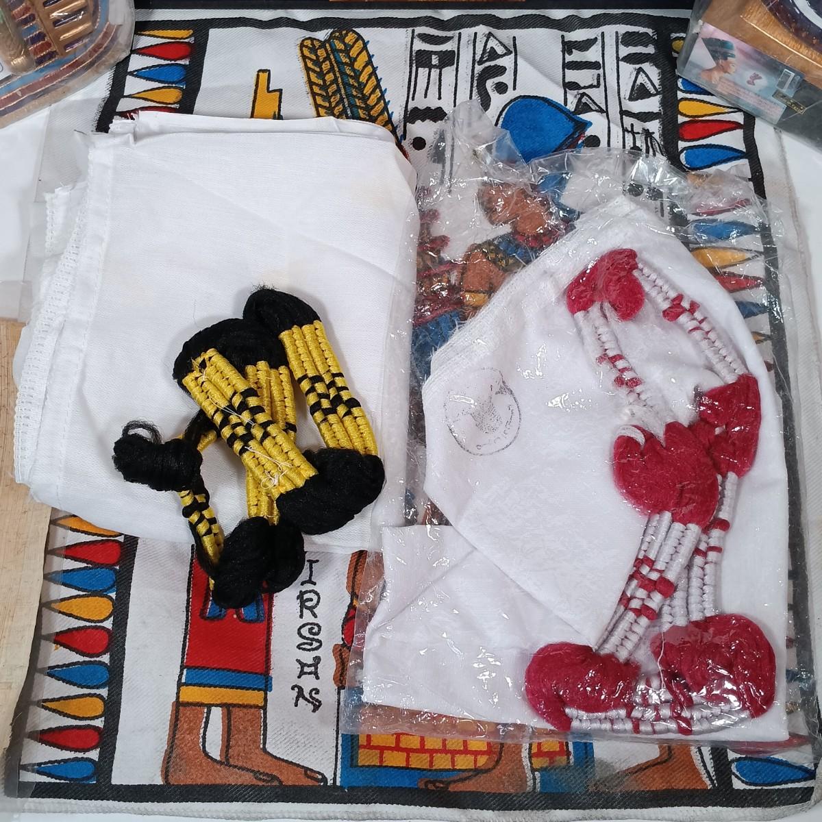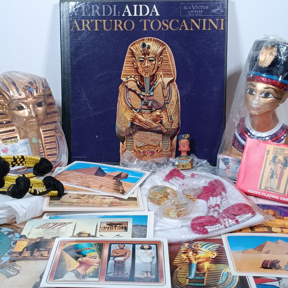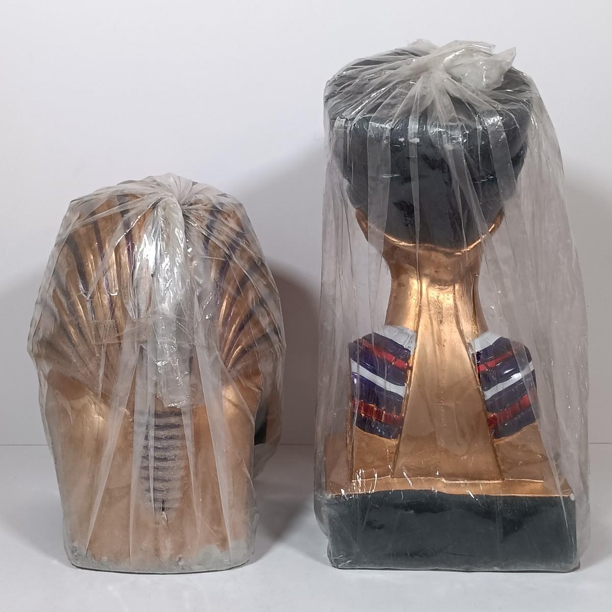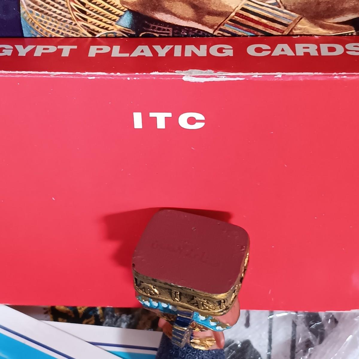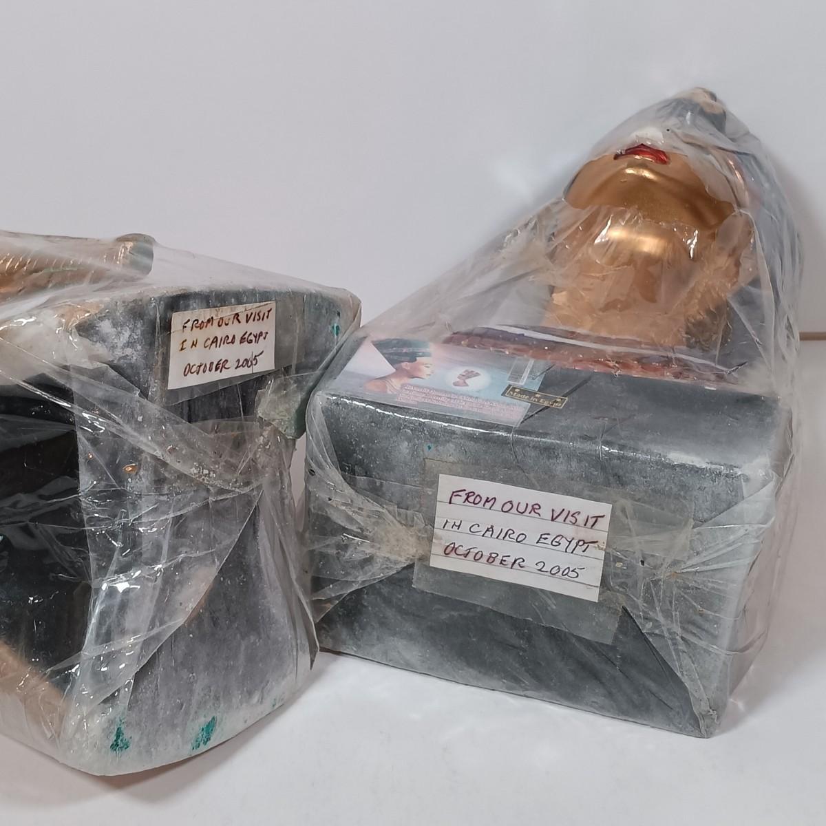 LOT 32: Chalkware Egyptian Statuary, Papyrus Sagittarius Painting, ITC Egypt Playing Cards & More