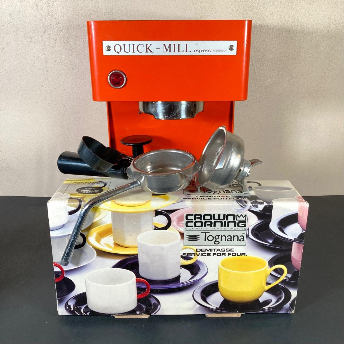 LOT 63: Vintage Quick-Mill Made in Italy Espresso Machine with Crown Corning Tognana Demitasse Service for Four in Box