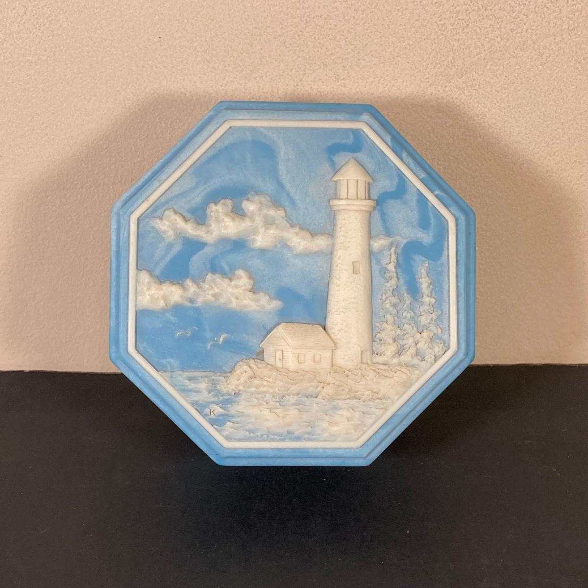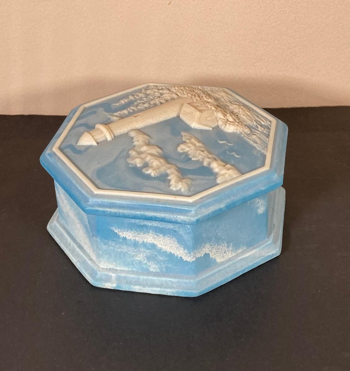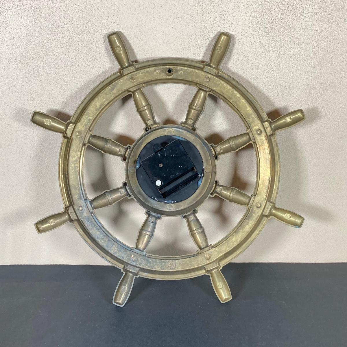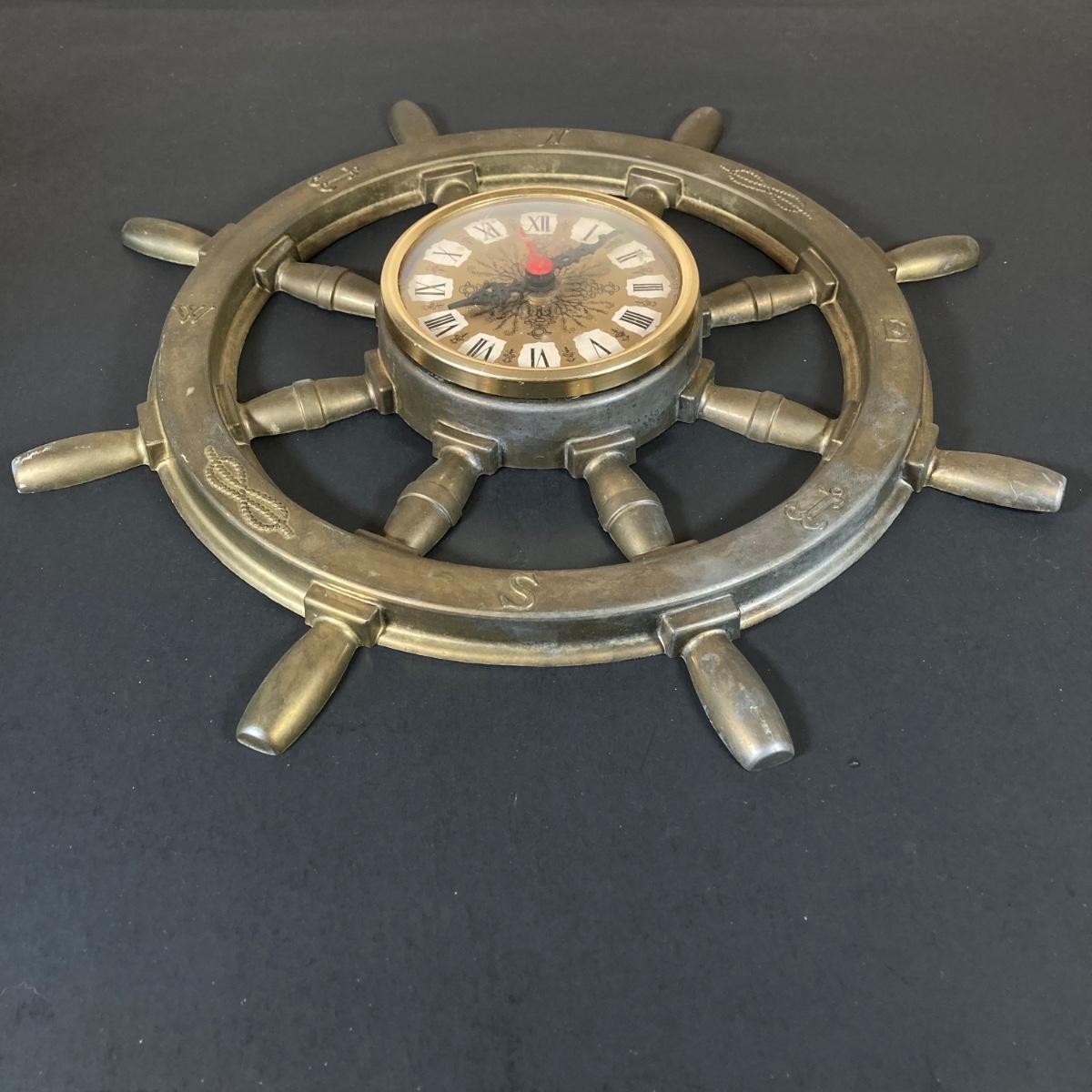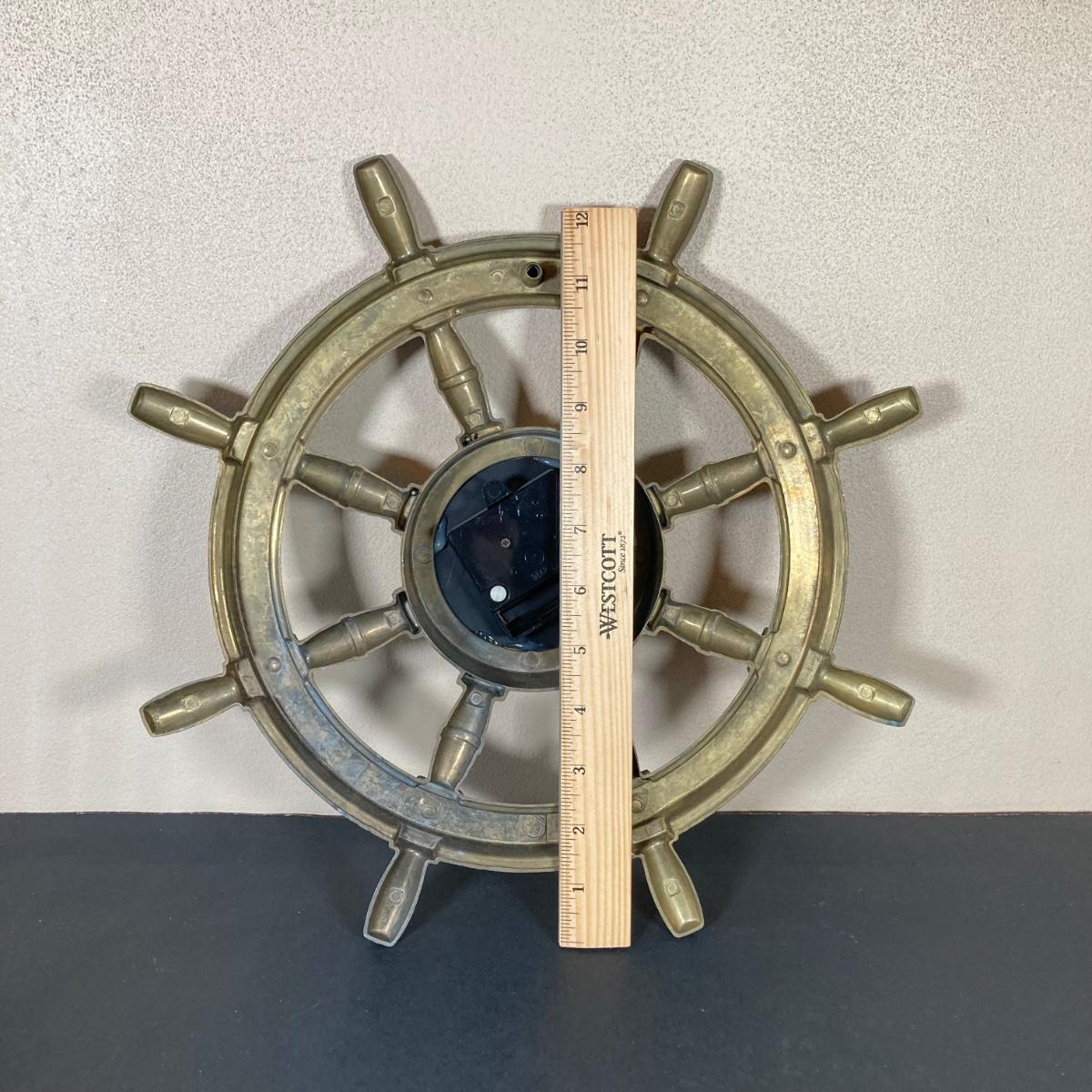 LOT 64: Vintage Brass Ships Wheel Wall Clock with Octagon Blue and White Nautical Box