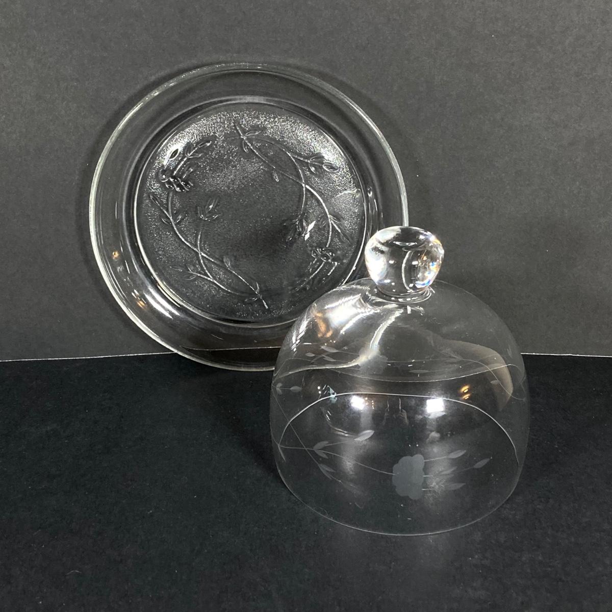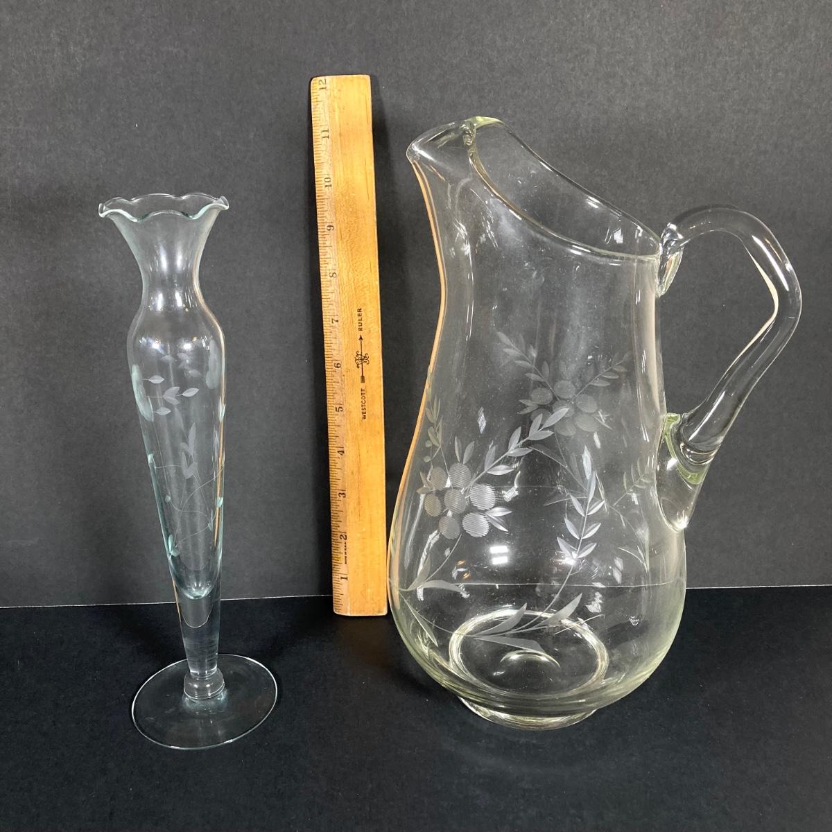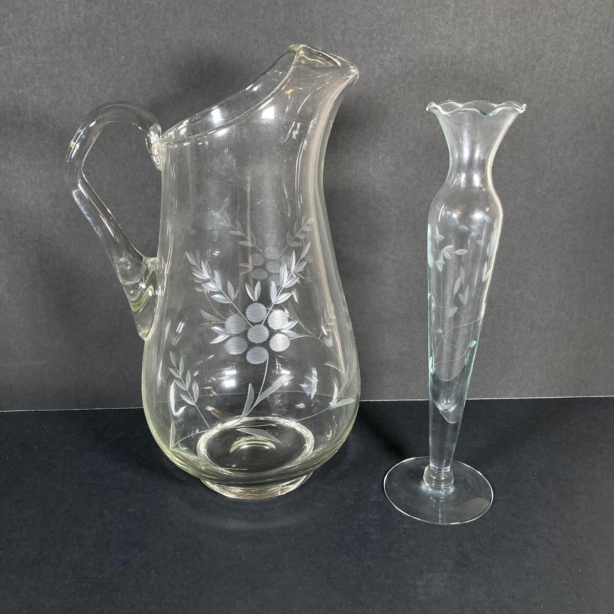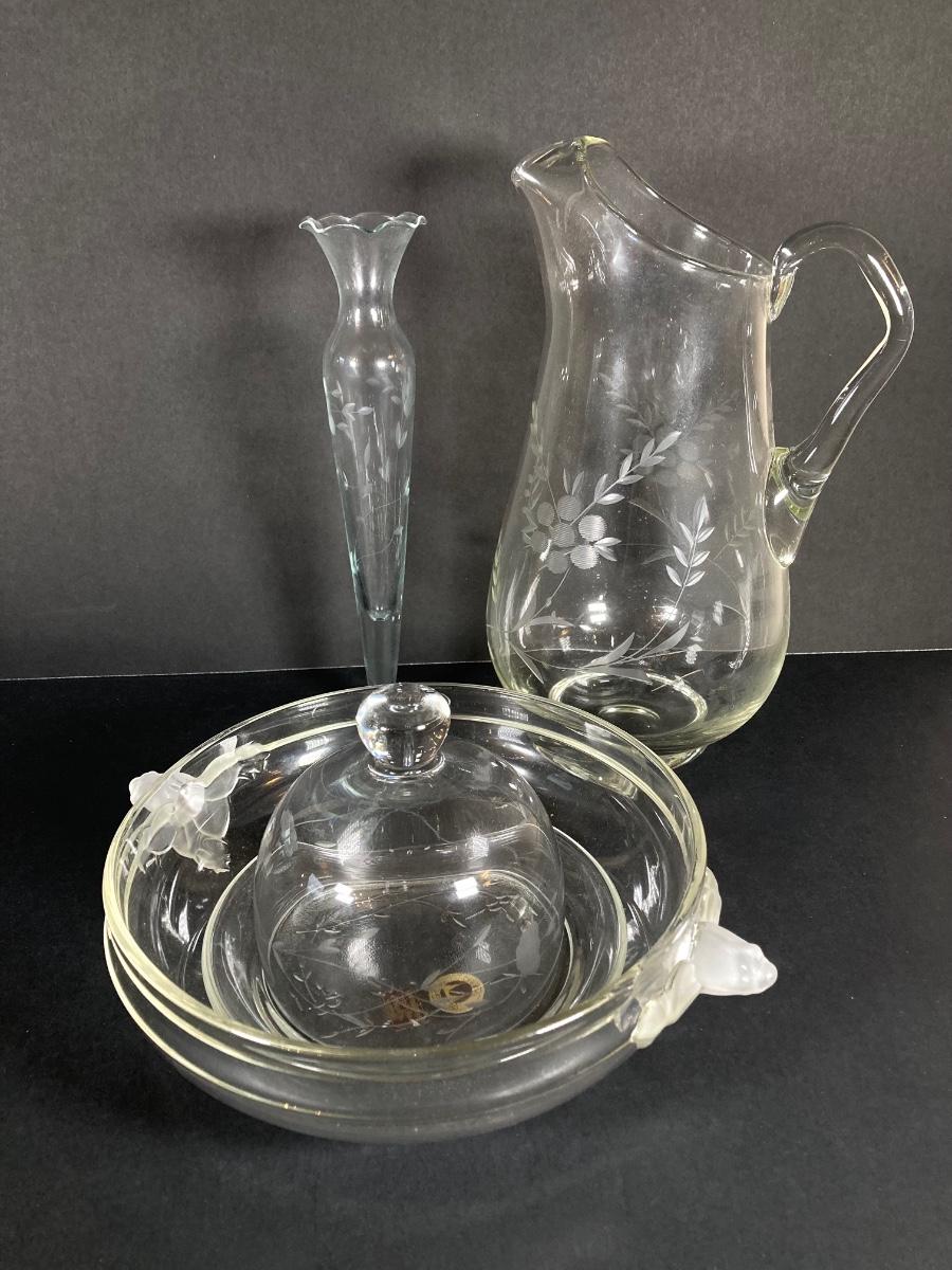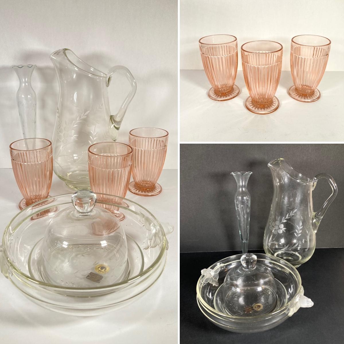 LOT 76: Vintage Glass Collection - Pink Ribbed Goblets, Frosted Walther Crystal Glas Bowl, Pitcher, Bud Vase and Butter Dish with Cloche