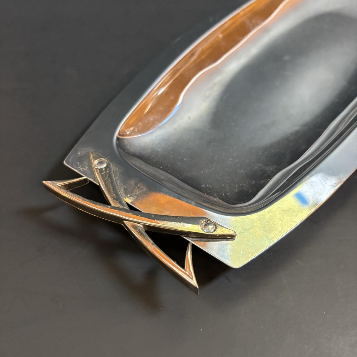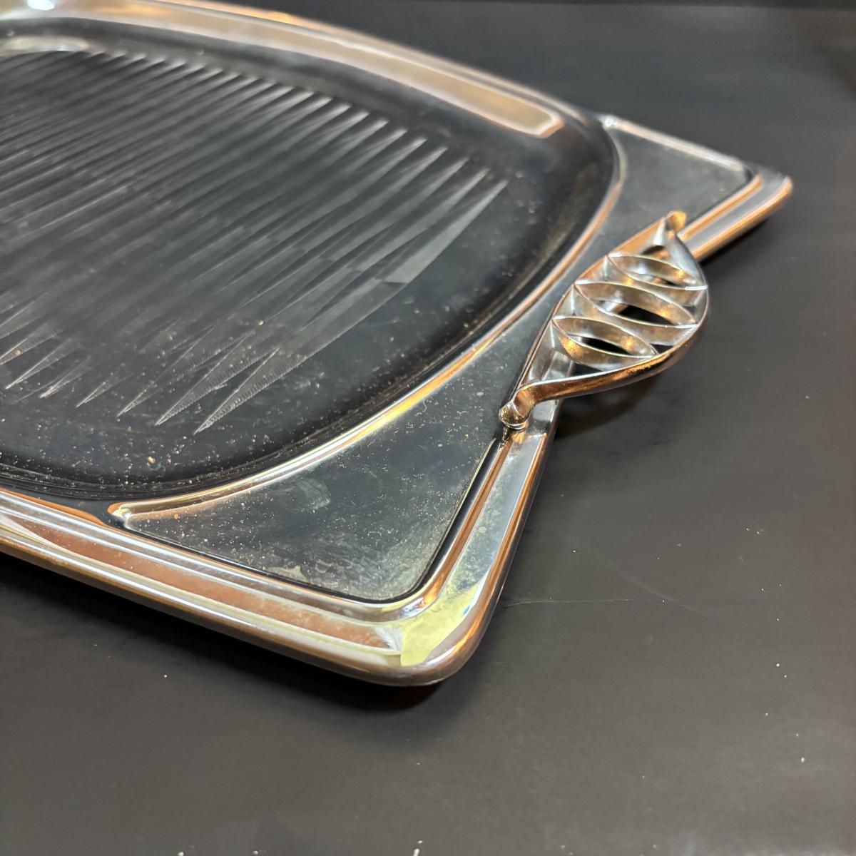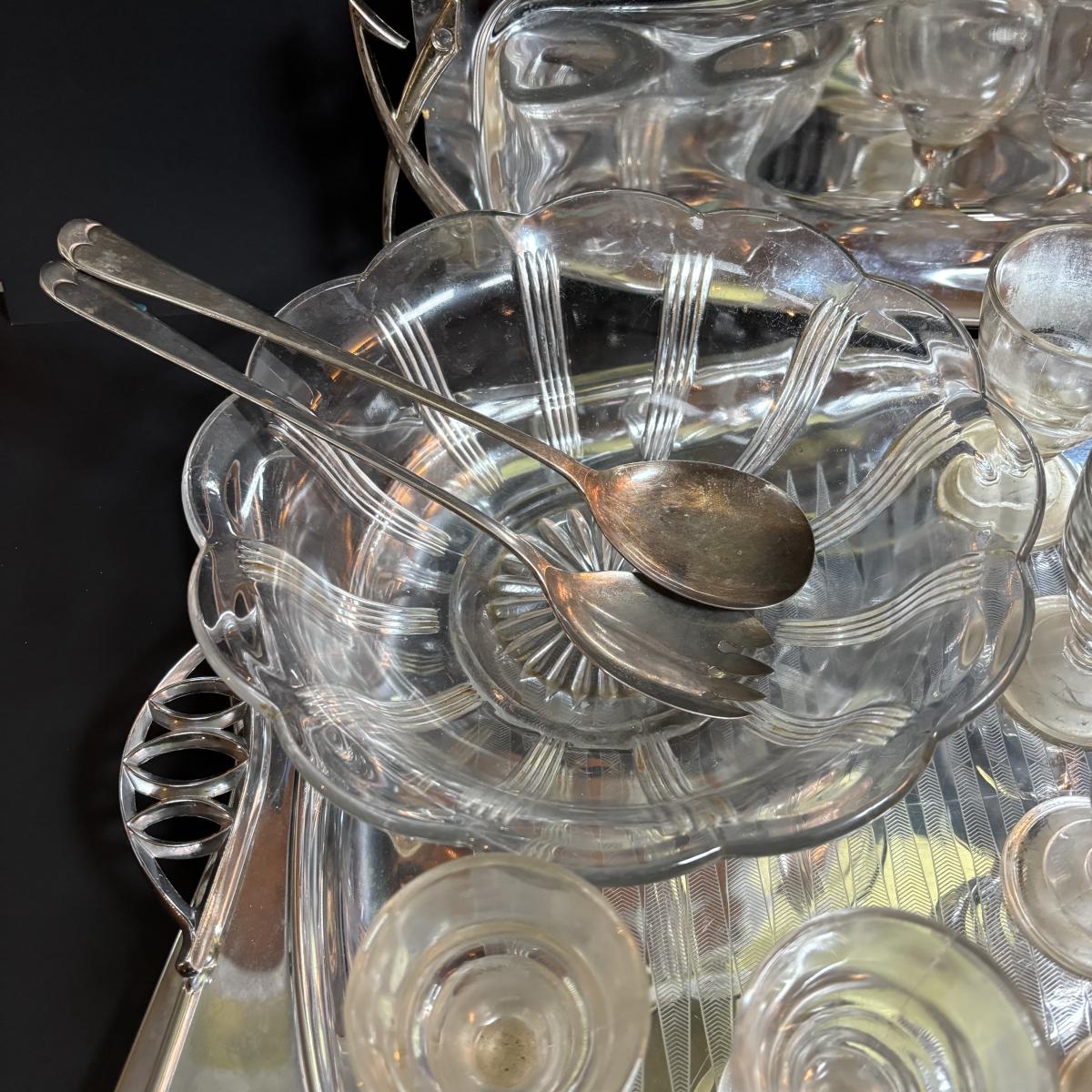 LOT 90: MCM Kromex & Hellerware Serving Trays, Owens-Illinois Thumbprint Pitcher, Vintage Cordial/After Dinner Liqueur Glasses
