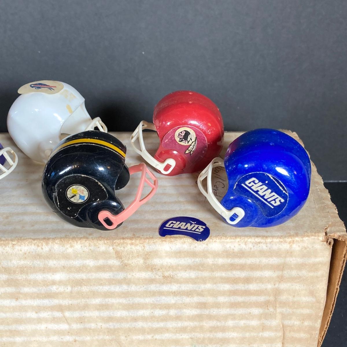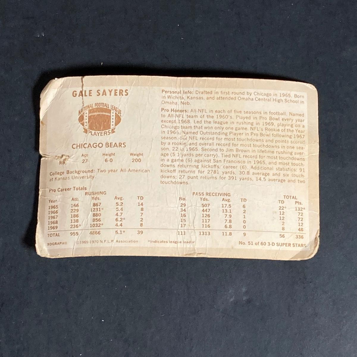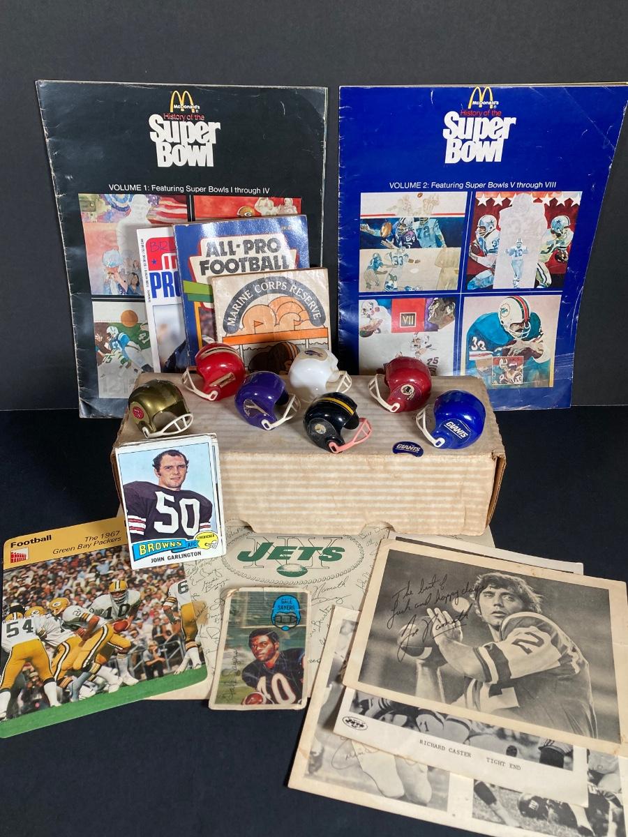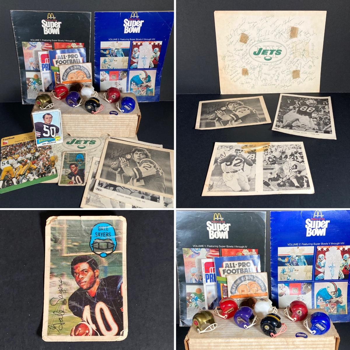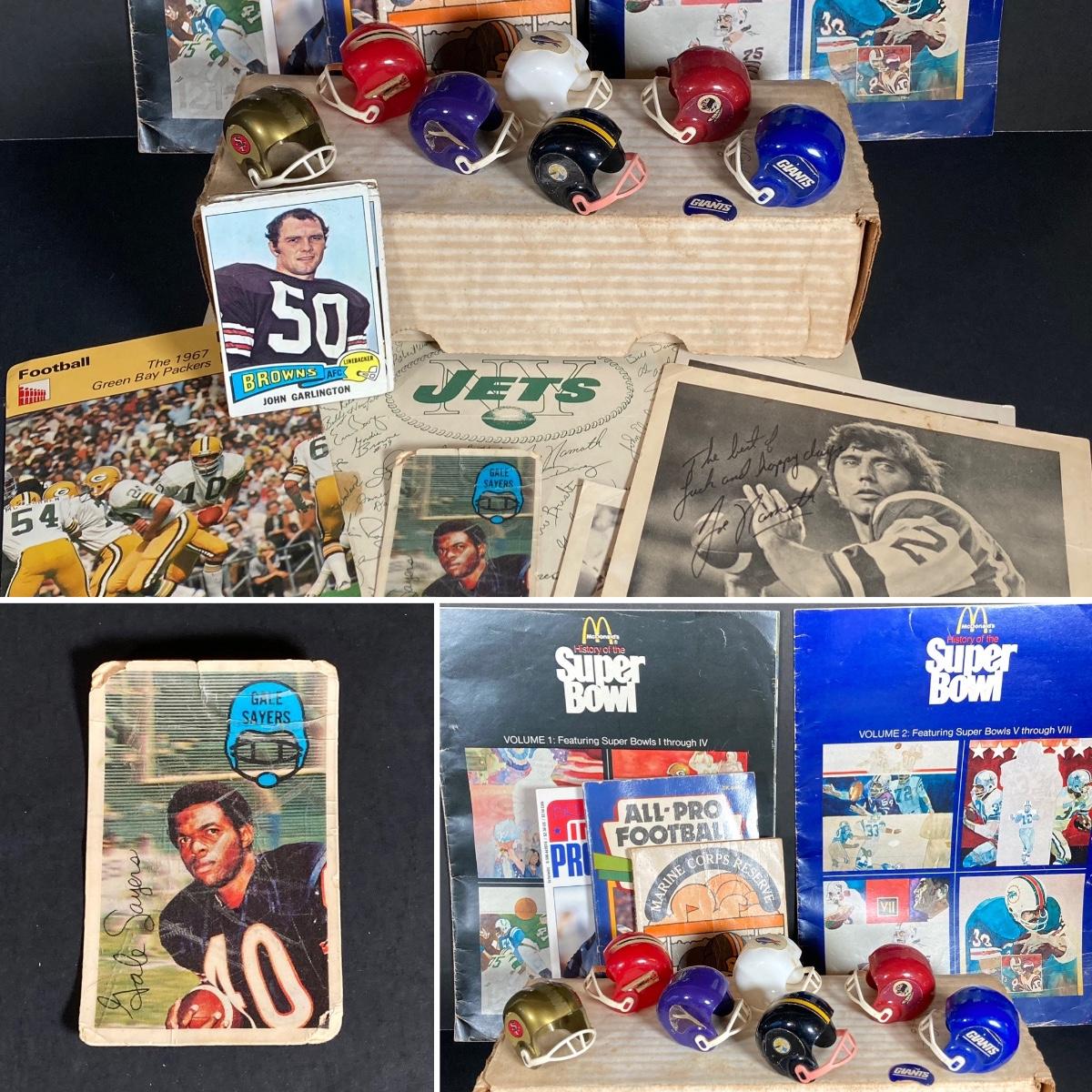 LOT 114: Vintage Collection of NFL Sports Memorabilia - Miniature Helmets, Gale Sayers 3D Card, Trading Cards, Super Bowl, Photos,