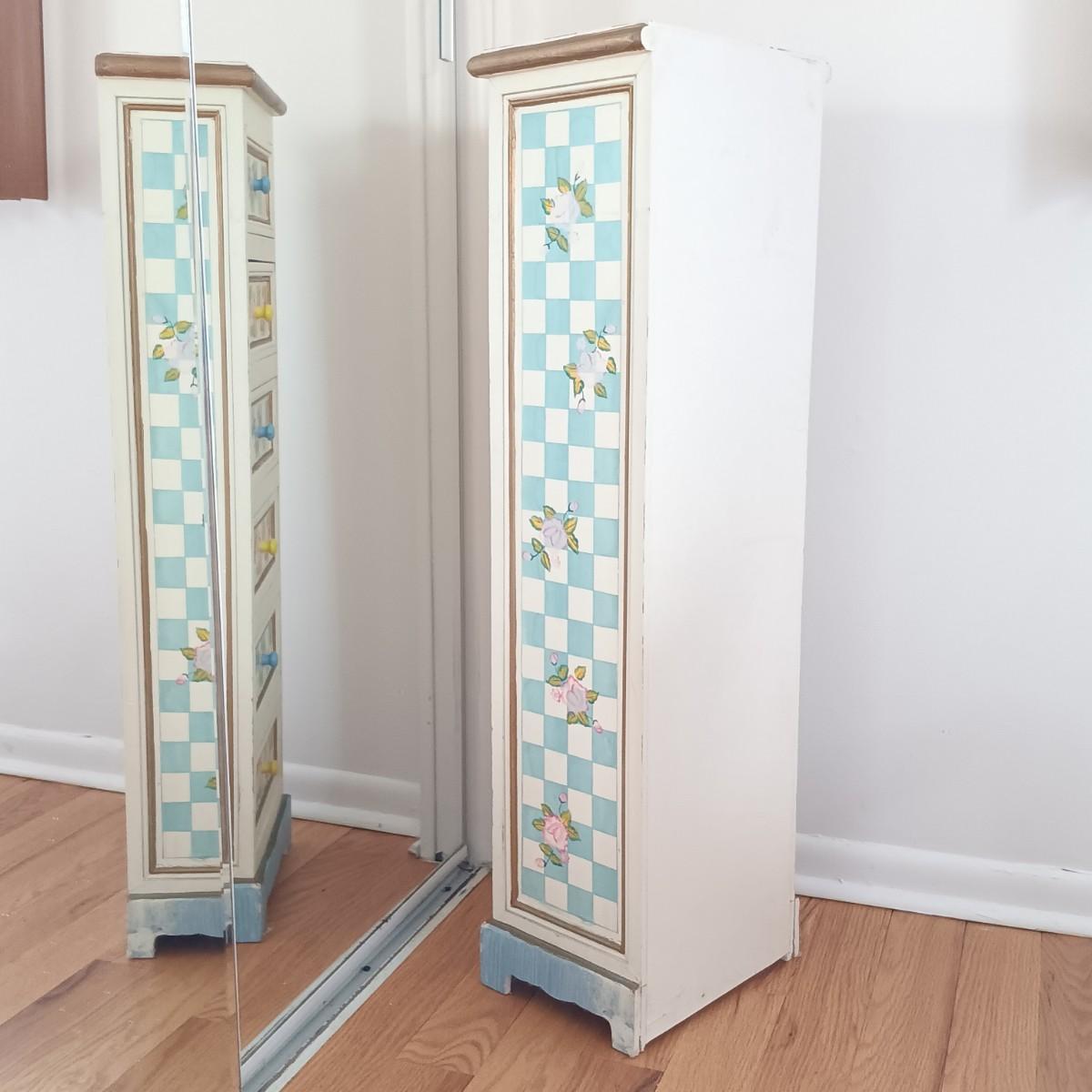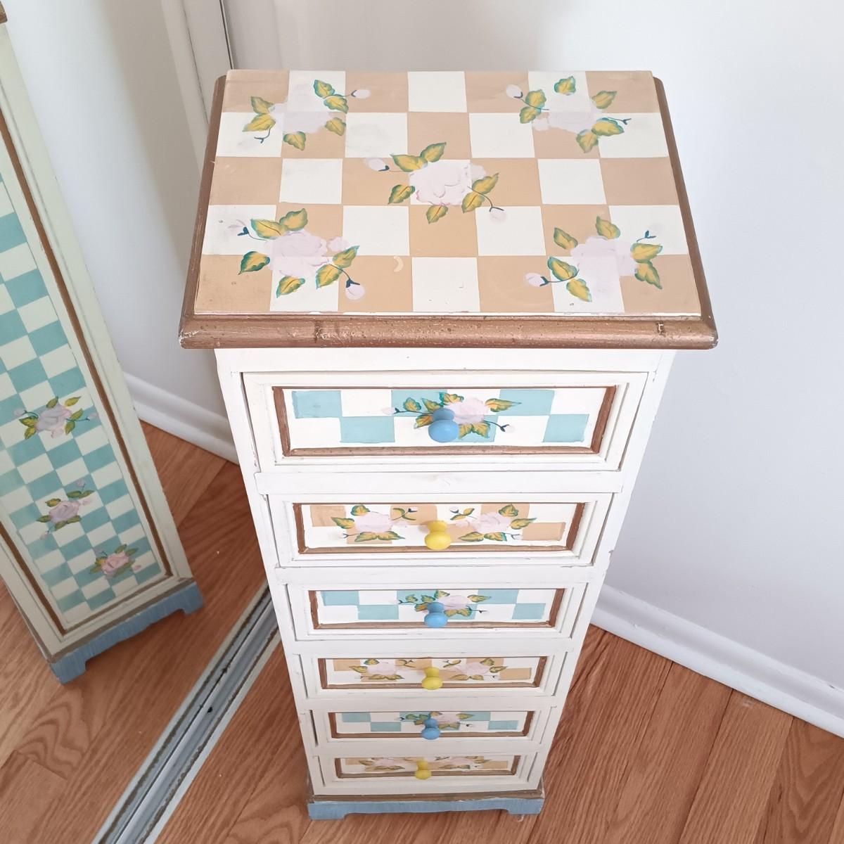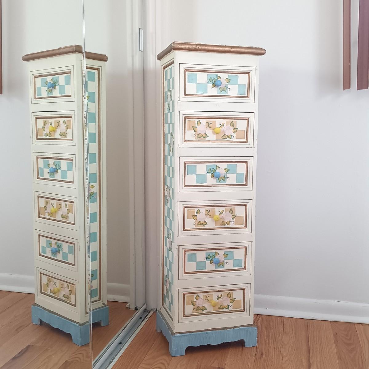 LOT 7: Small Chest of Drawers with Basket, Framed Art, Pottery Vase & More