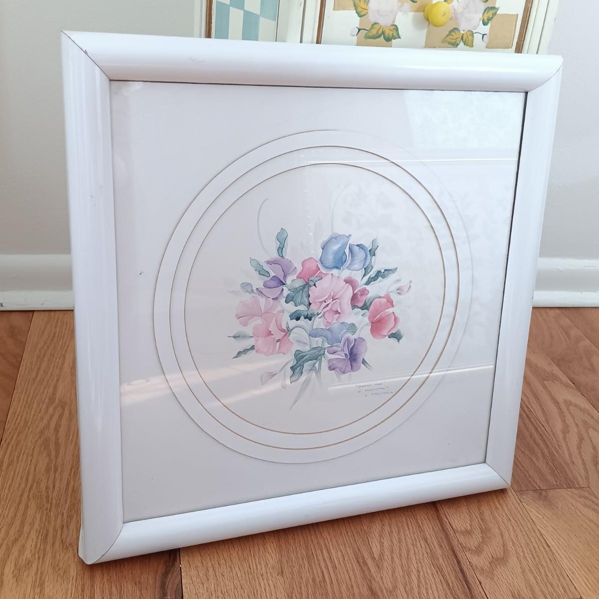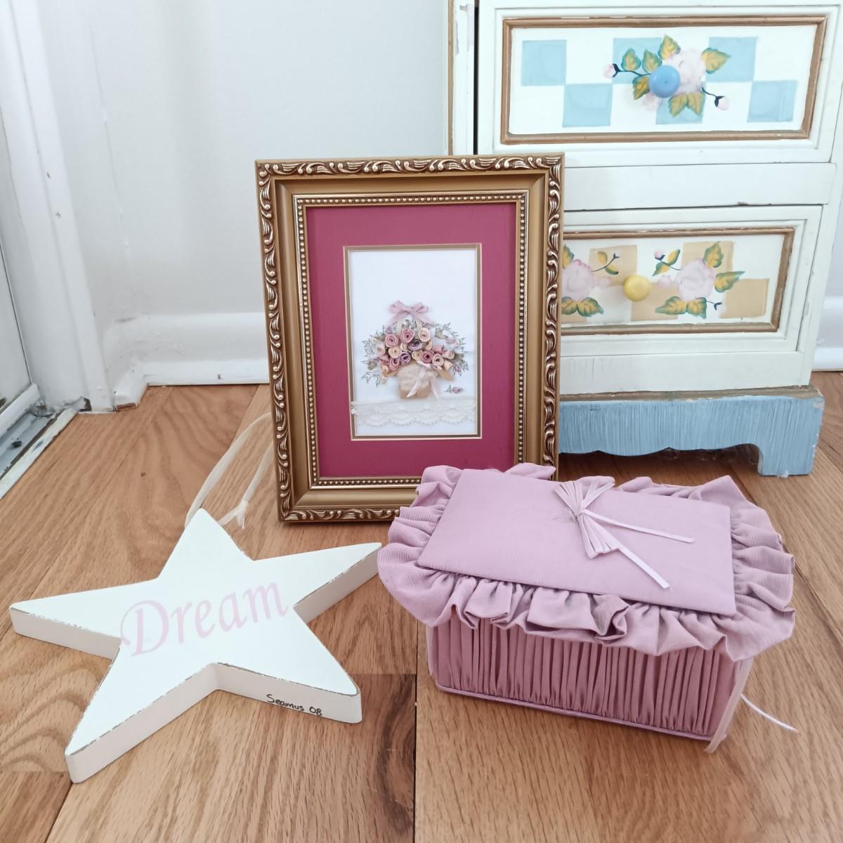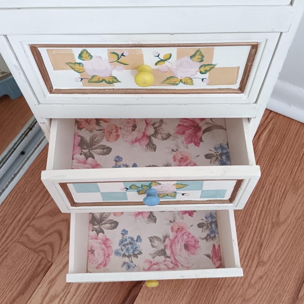 LOT 7: Small Chest of Drawers with Basket, Framed Art, Pottery Vase & More