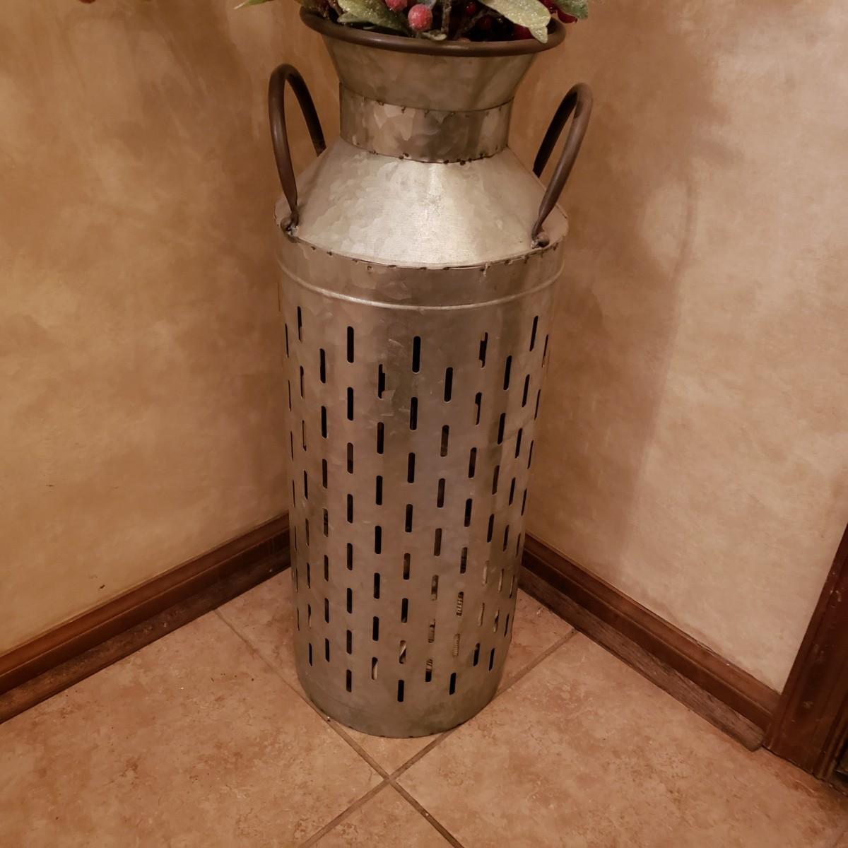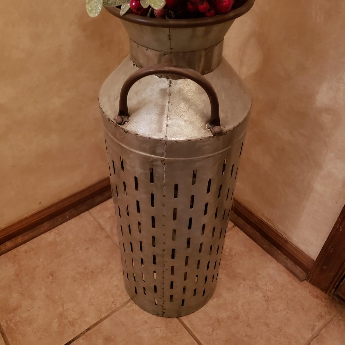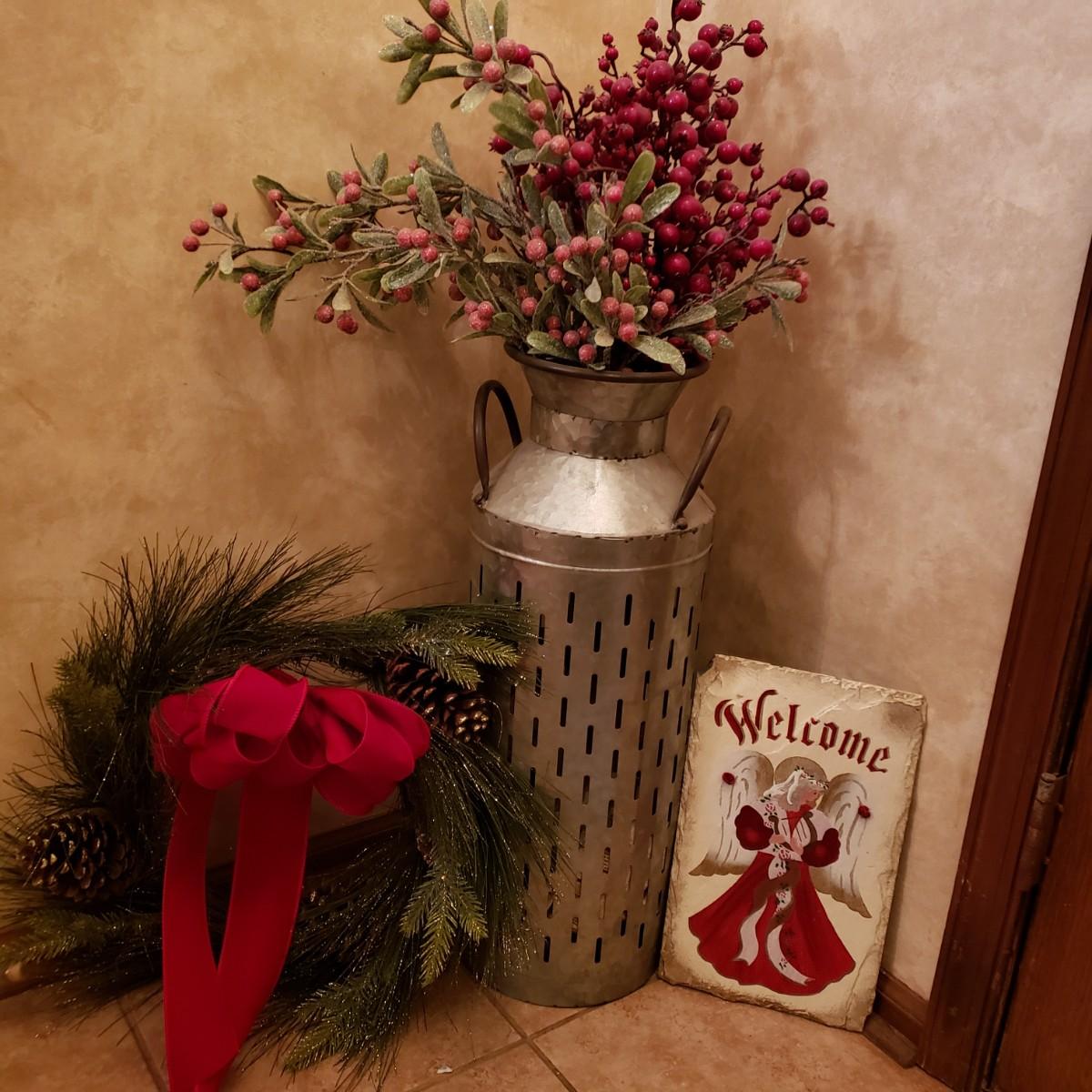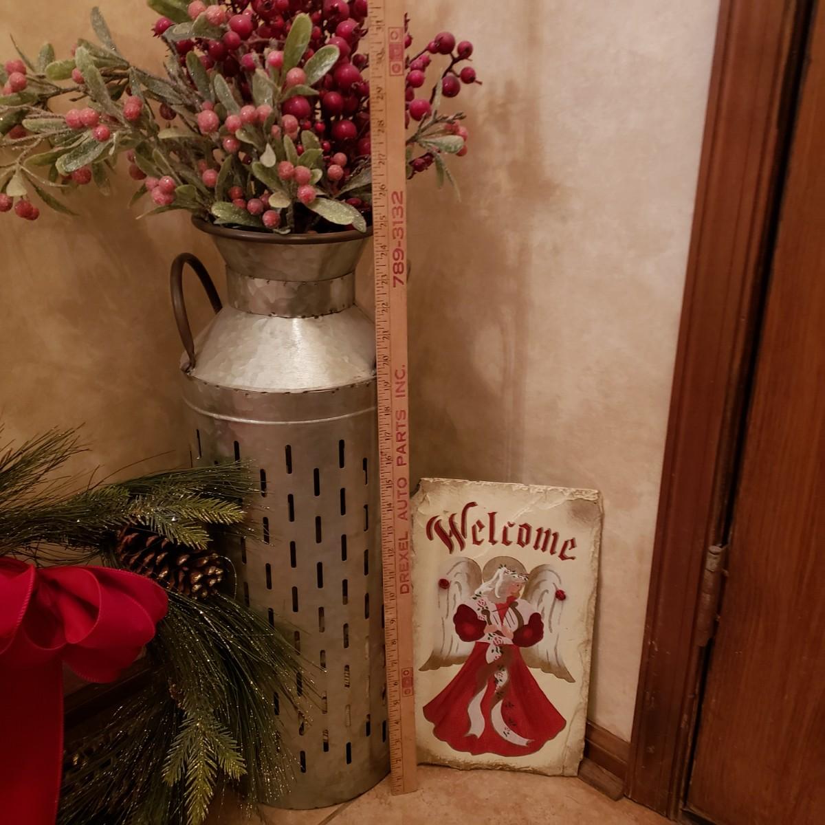 LOT 32: Winter Decor-Slate Angel Wall Hanging, Decorative Metal Milk Can & Wreath