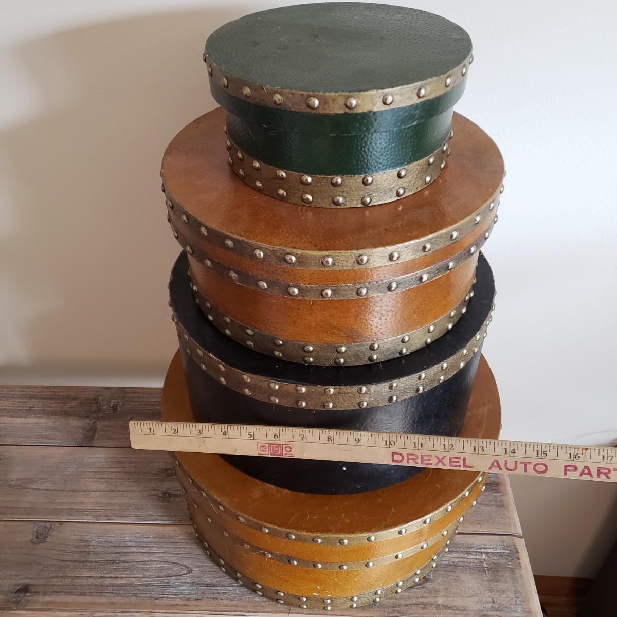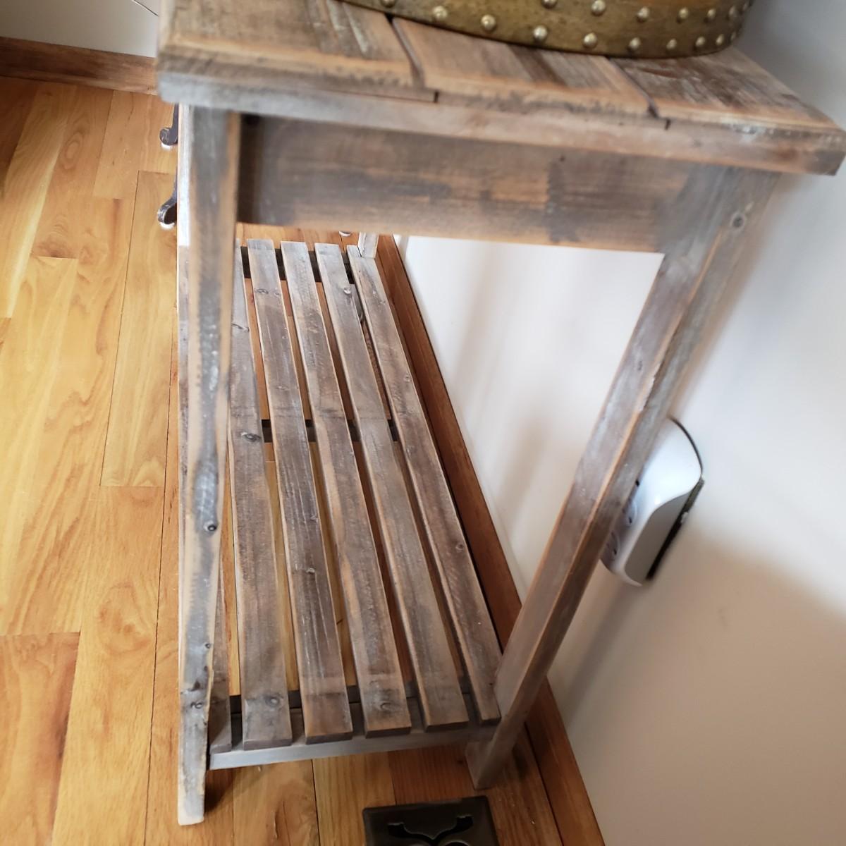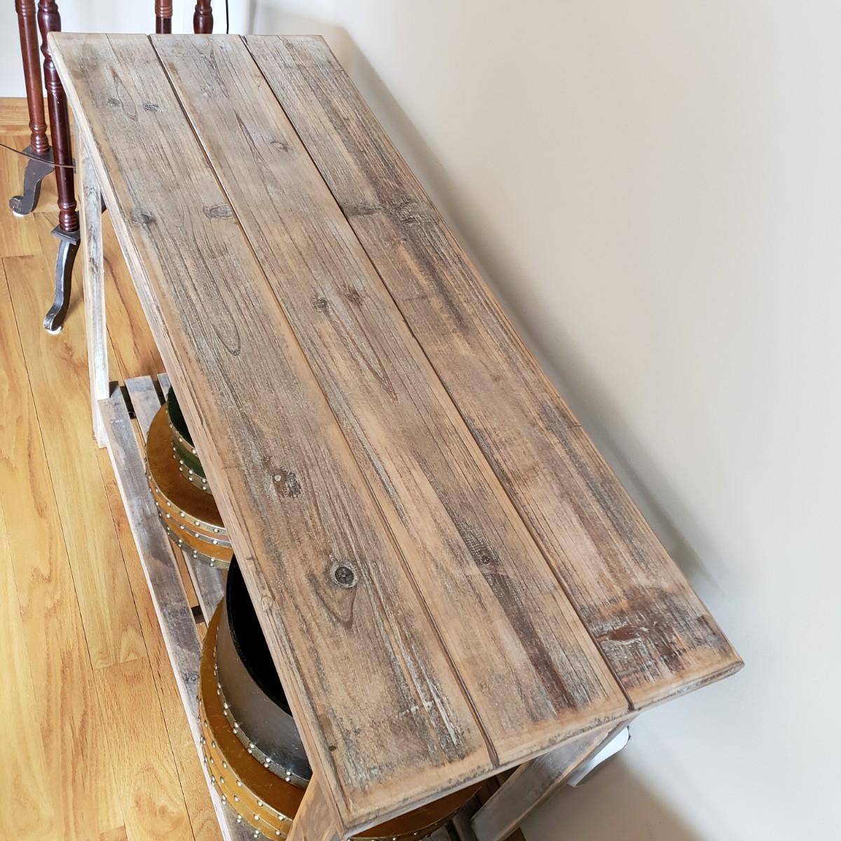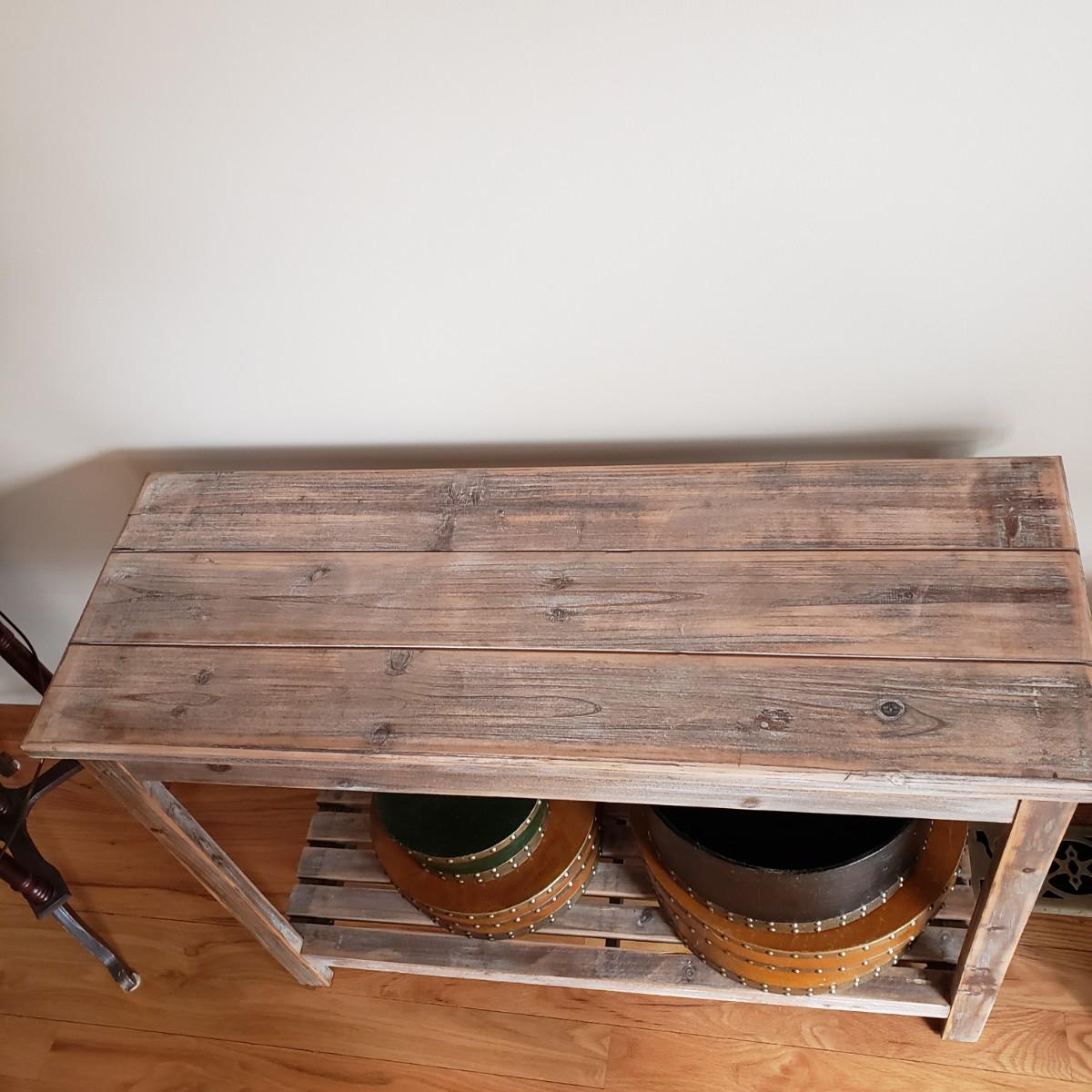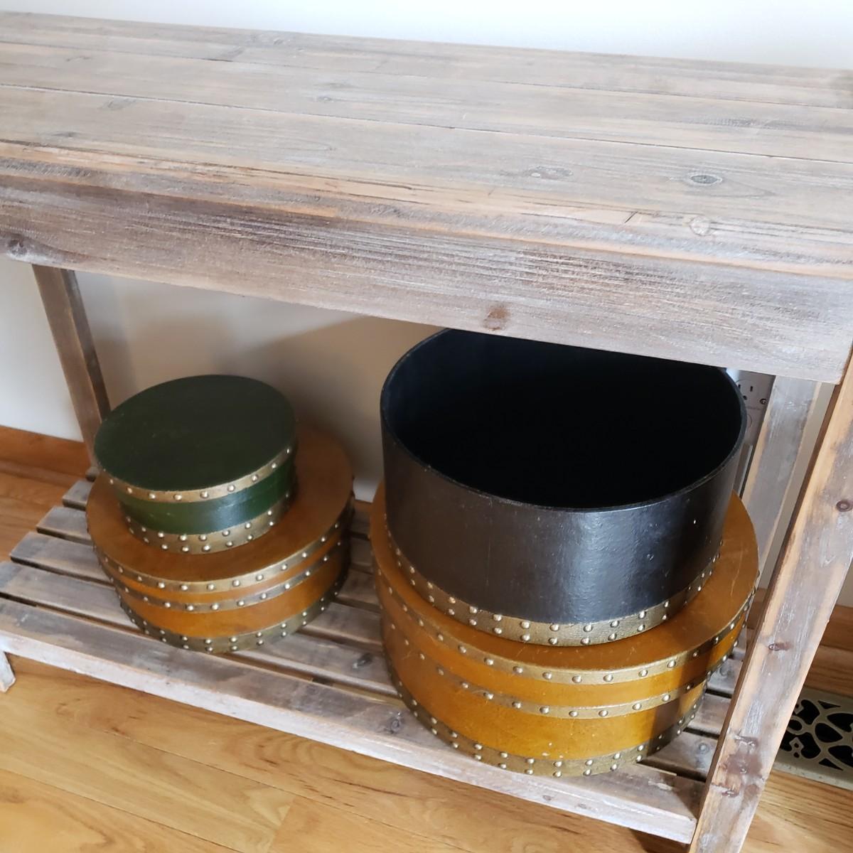 LOT 36: Rustic Wood Console Table with Stack of Decorative Round Boxes