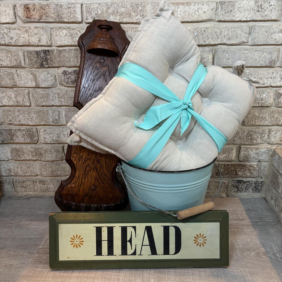 LOT 43: Home Decor: Enamel Pail, "Head" Sign, Wood & Metal Wall Sconce & NIP Martha Stewart Chair Pads