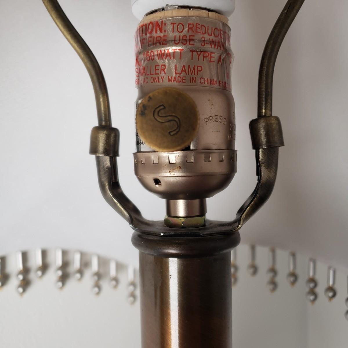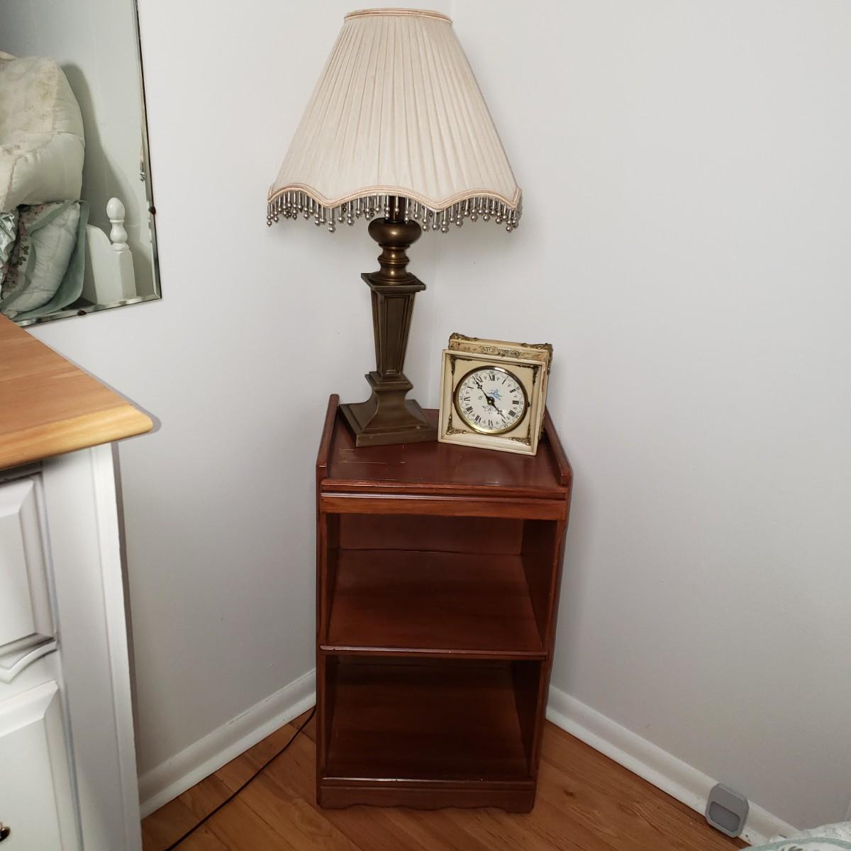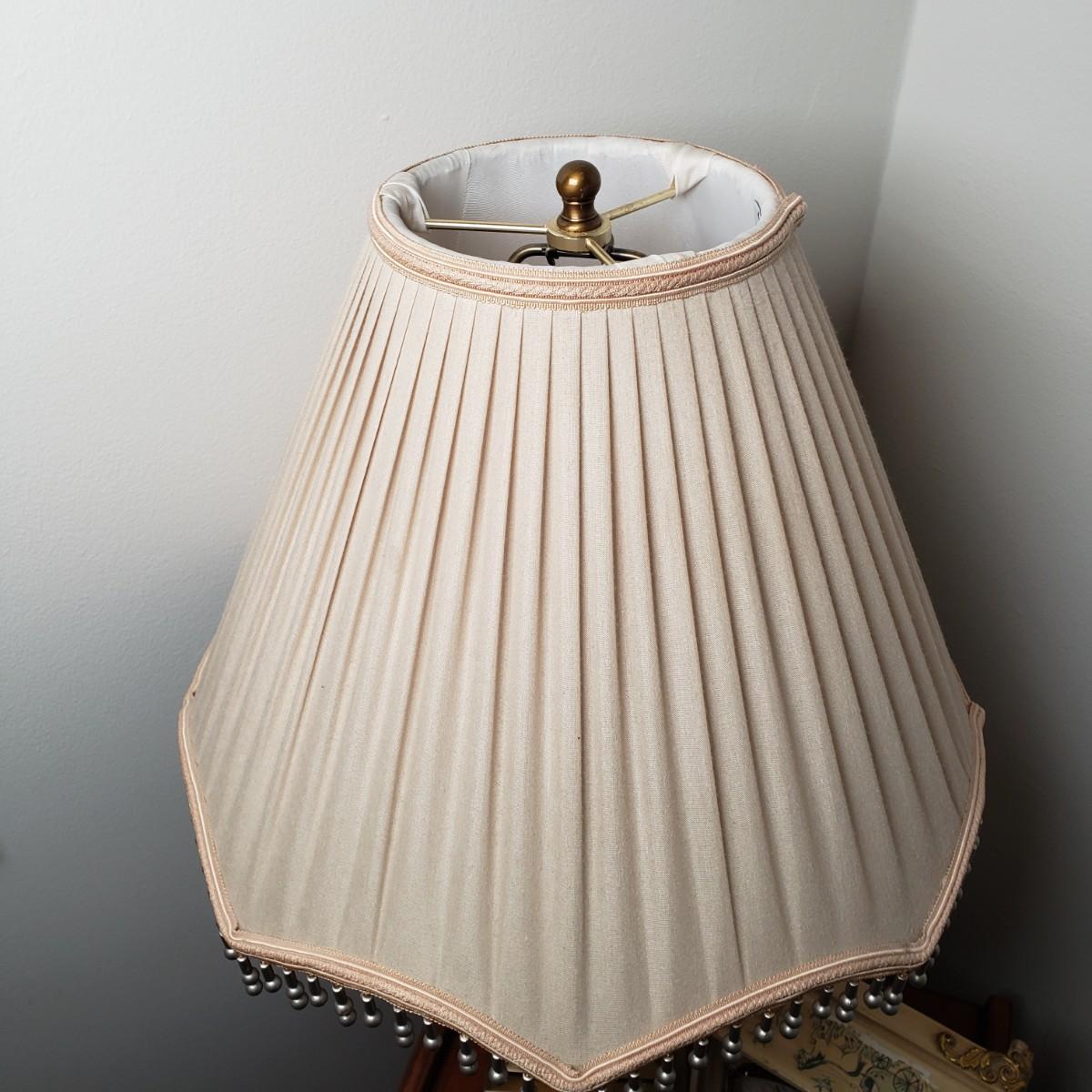 LOT 53: Brass Table Lamp with Beaded Shade, Custom Made Decoupage Clock & Side Table
