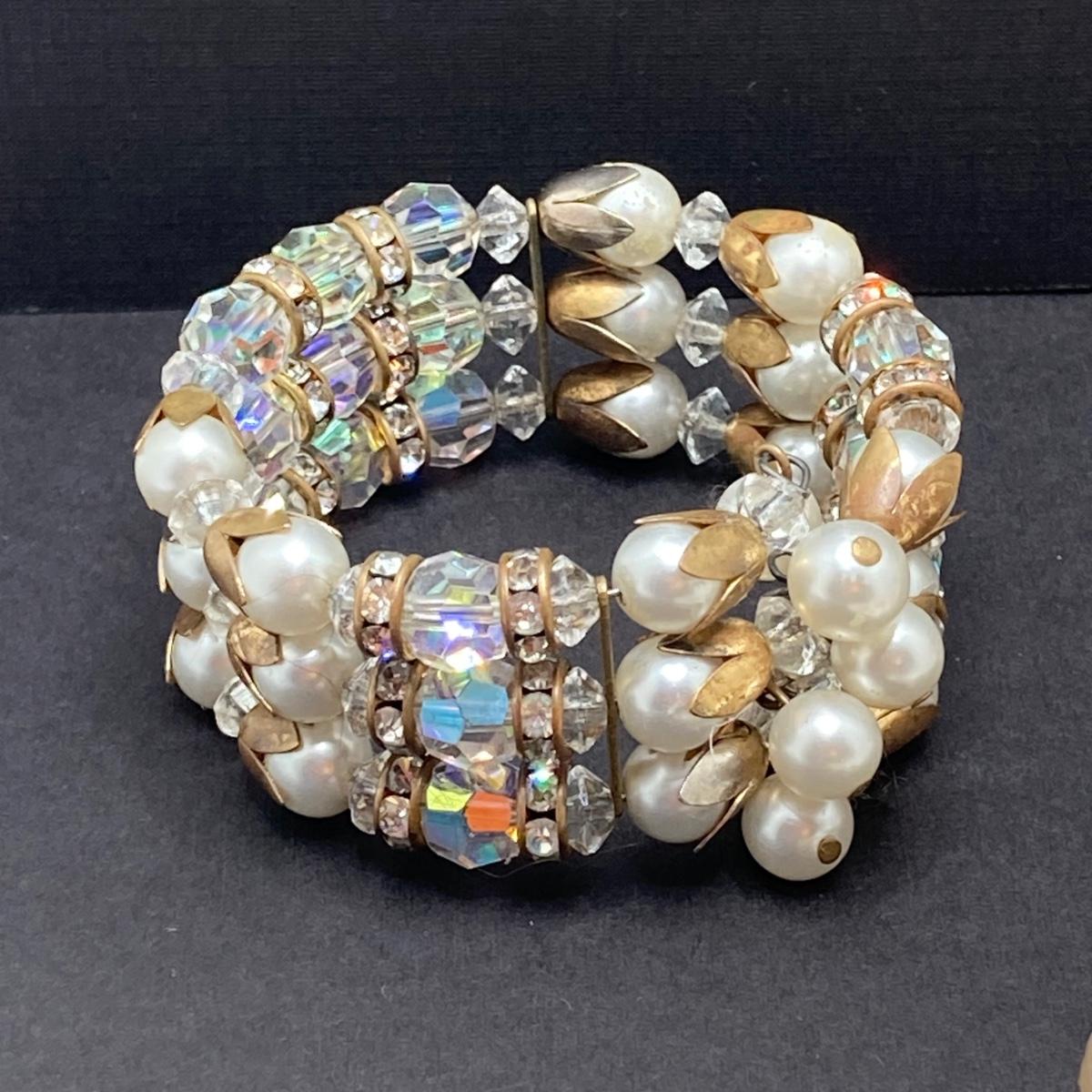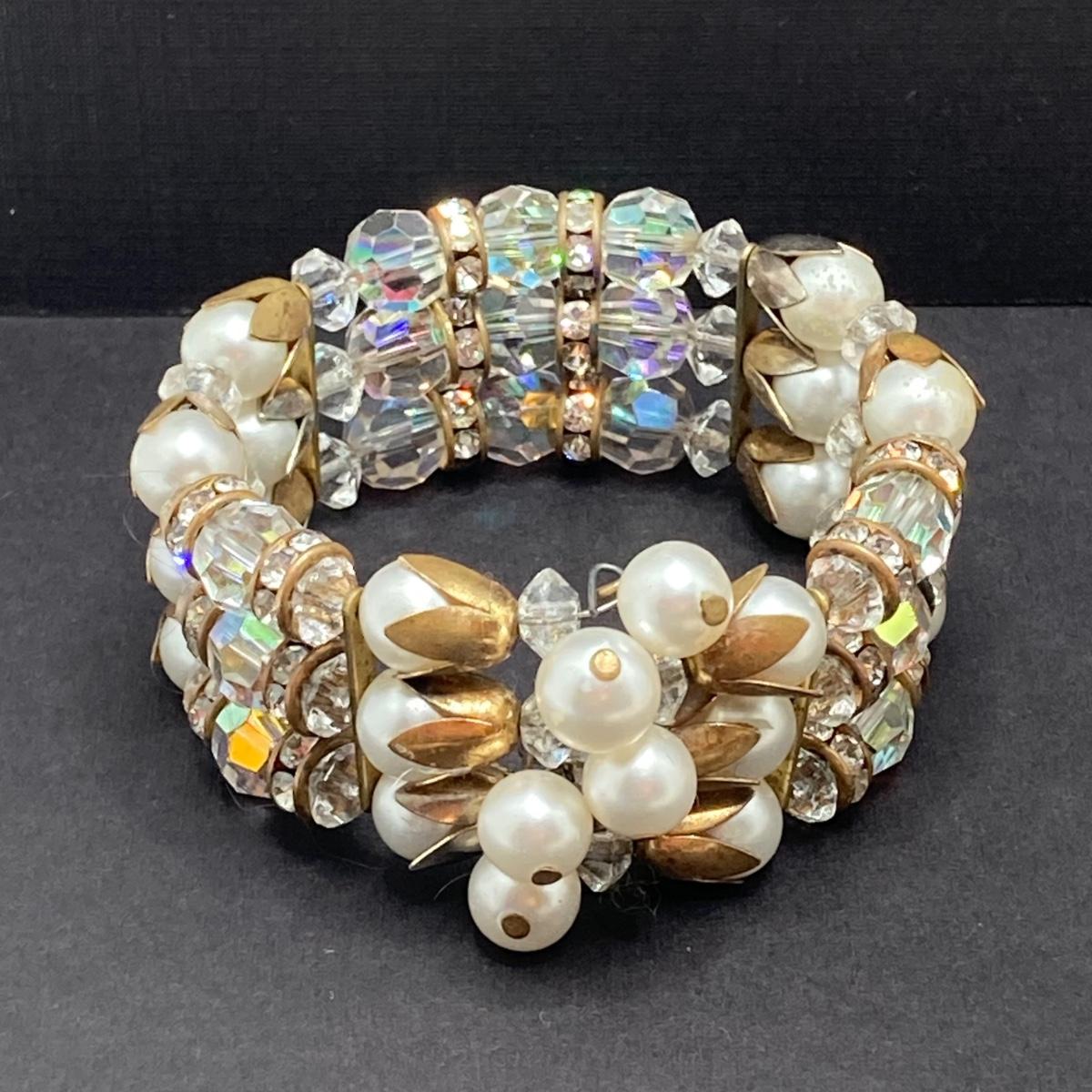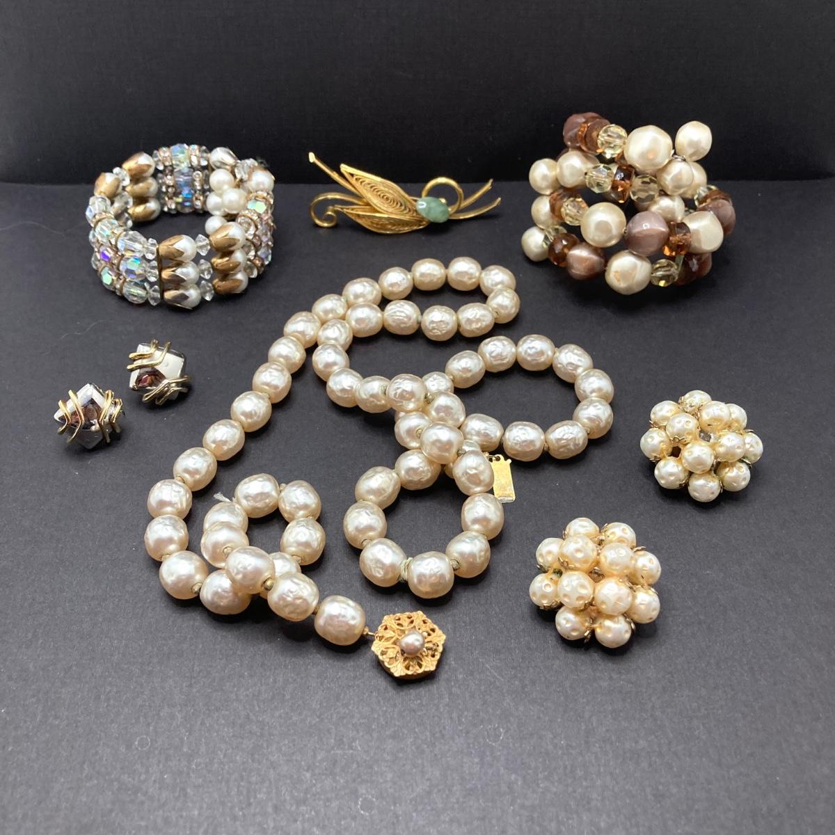 LOT 74: Vintage Jewelry Collection - Miriam Haskell Necklace, Brooch Pin, Stretch Bracelets and More
