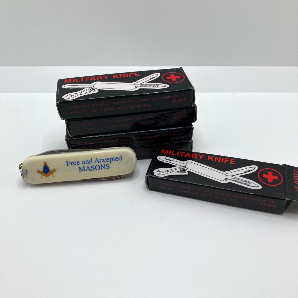 LOT 77: Free Mason Zippo Lighters and Five Military / Utility Folding Pocket Knives