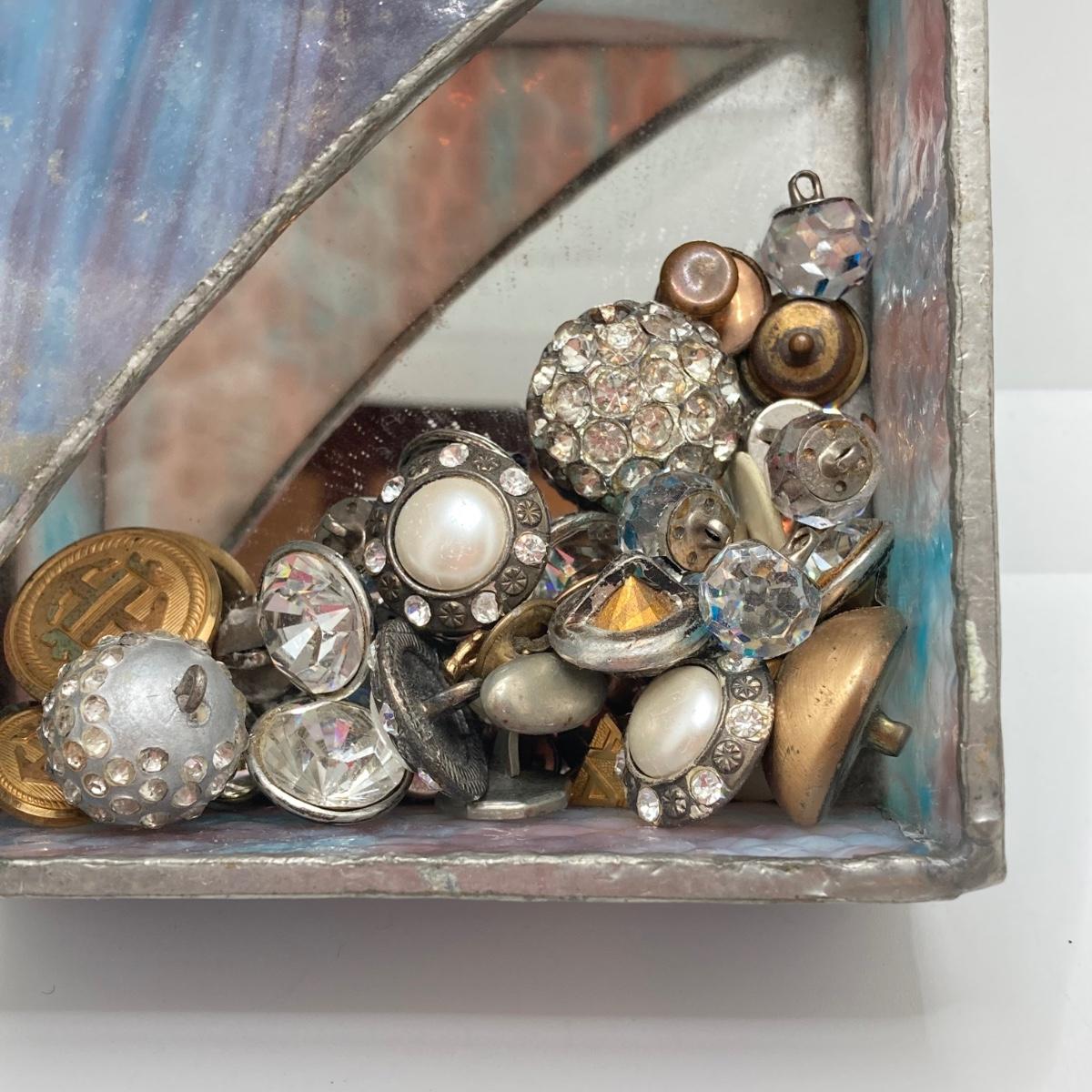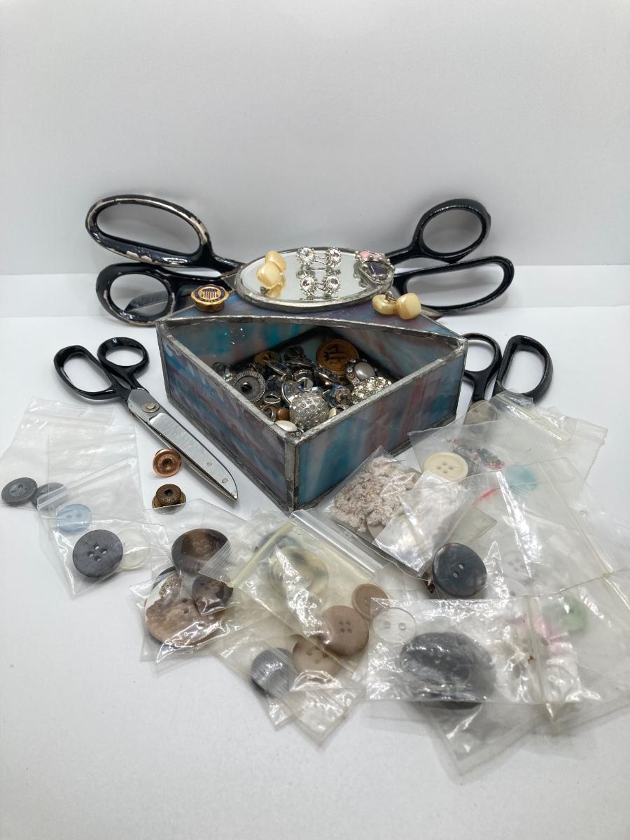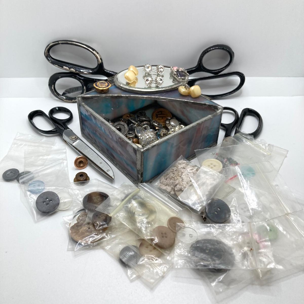 LOT 78: Vintage Sewing / Crafting Collection - Buttons, Scissors, Pins with Stained Glass Mirror and Trinket Holder