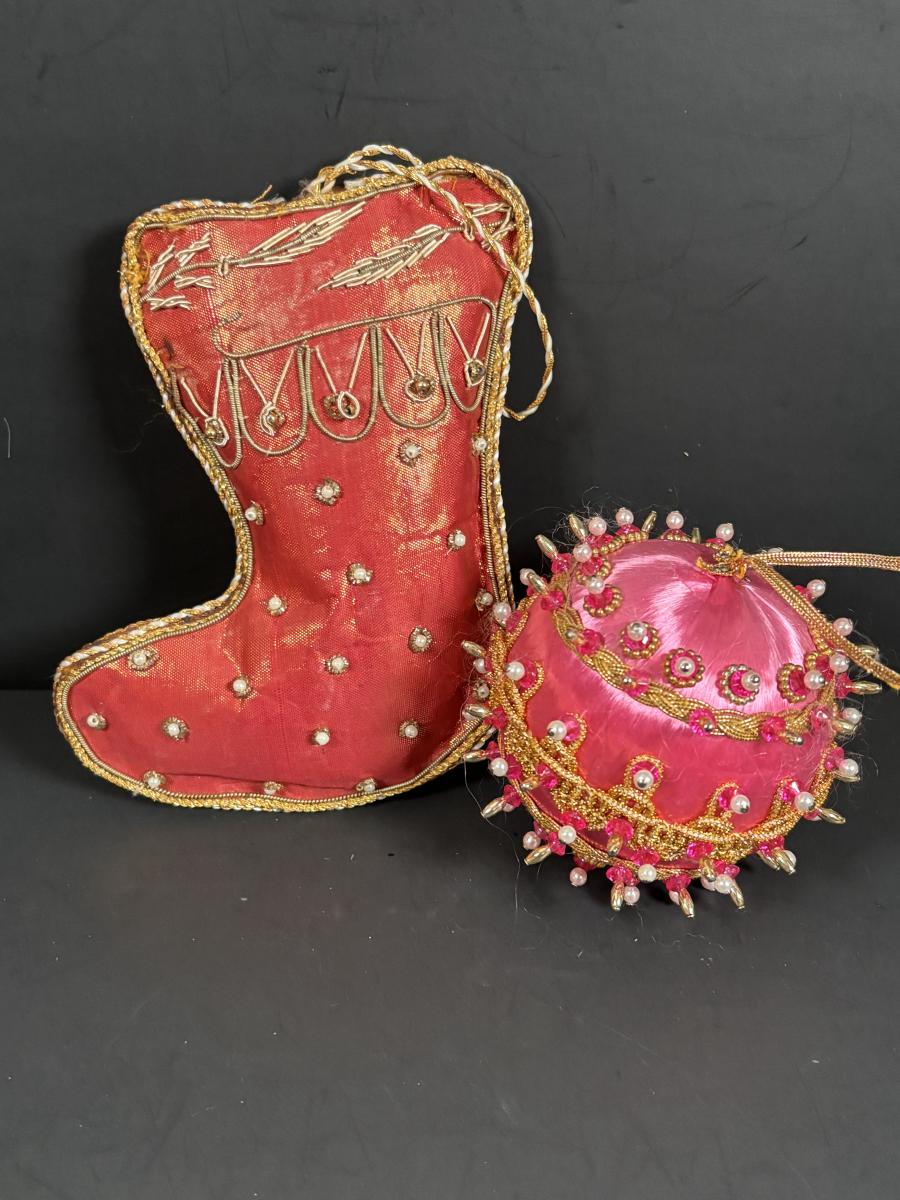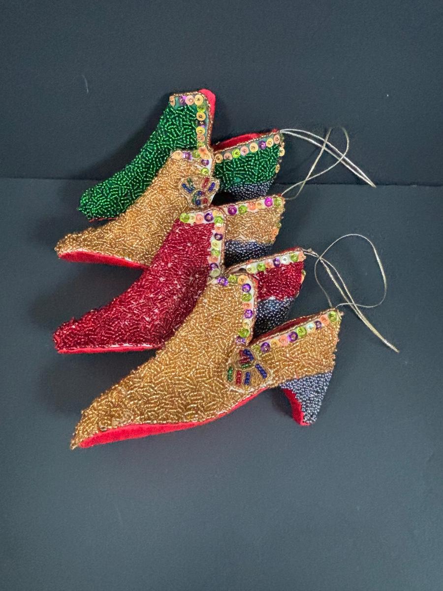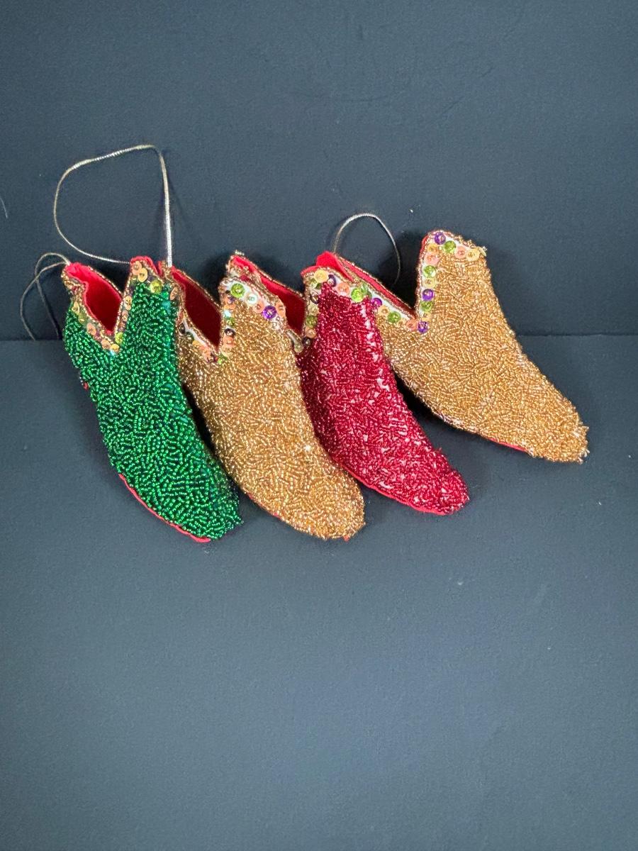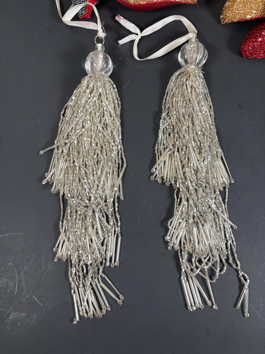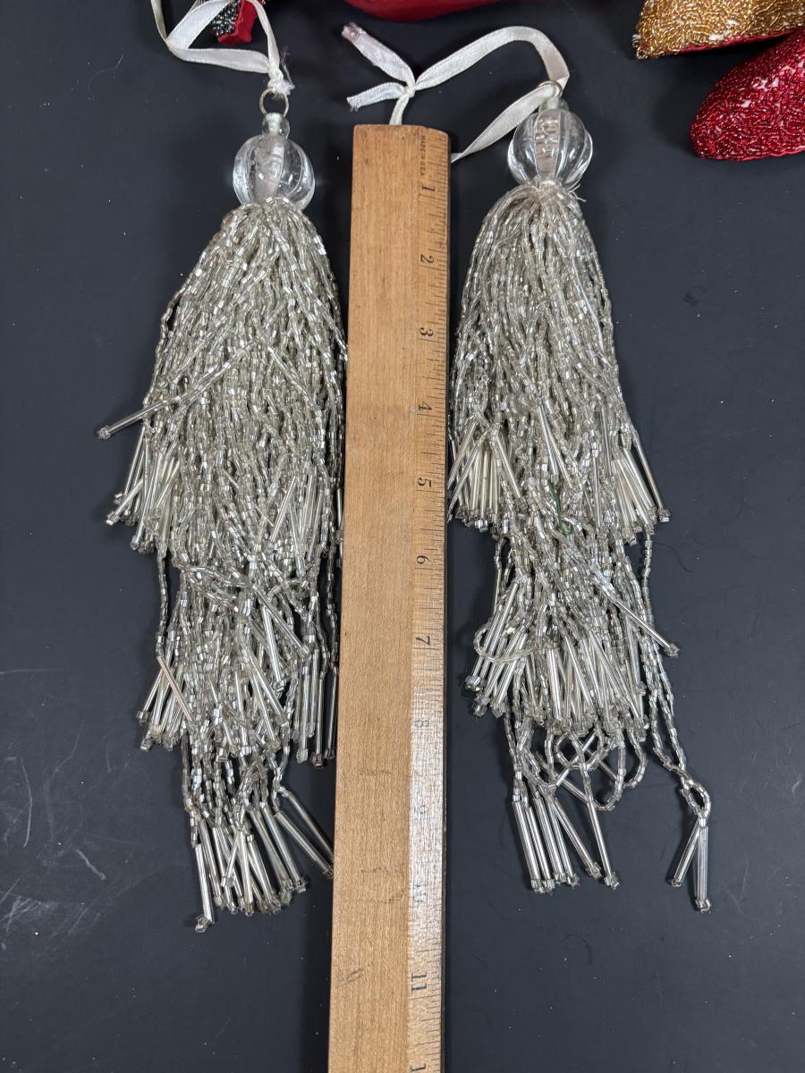 LOT 133: Holiday Ornament Collection: Vintage Pushpins, Beaded Slippers, Tassels