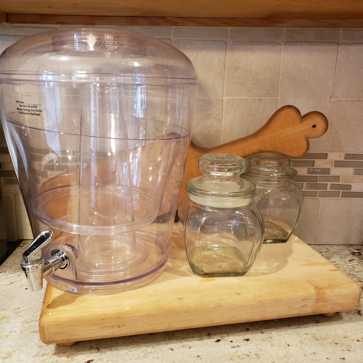 LOT 184: Wooden Cutting Boards, Large Plastic Beverage Dispenser & Glass Canisters