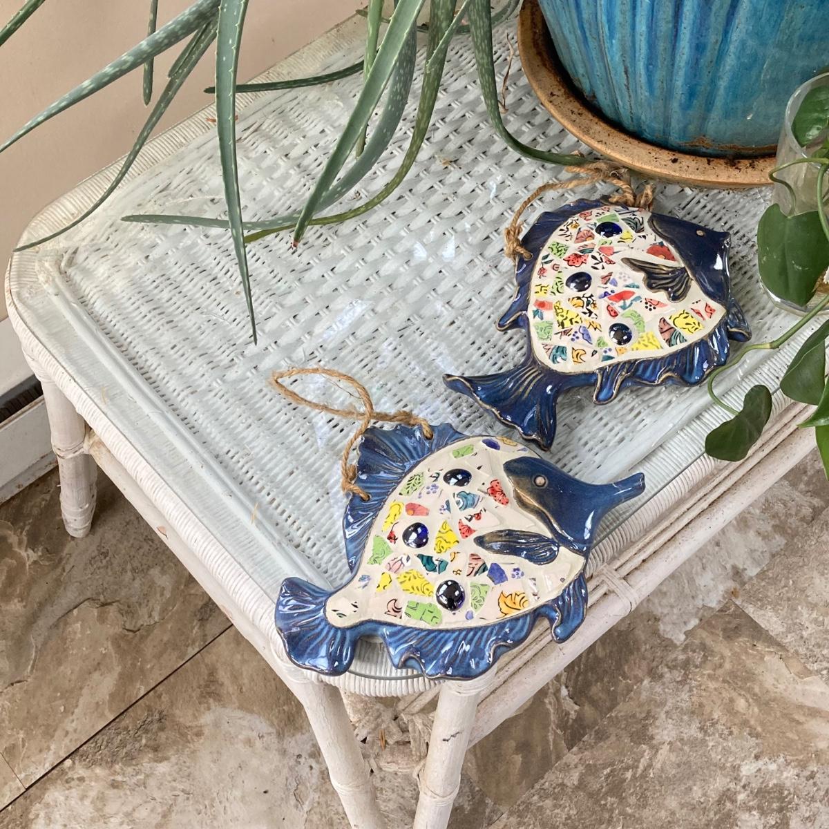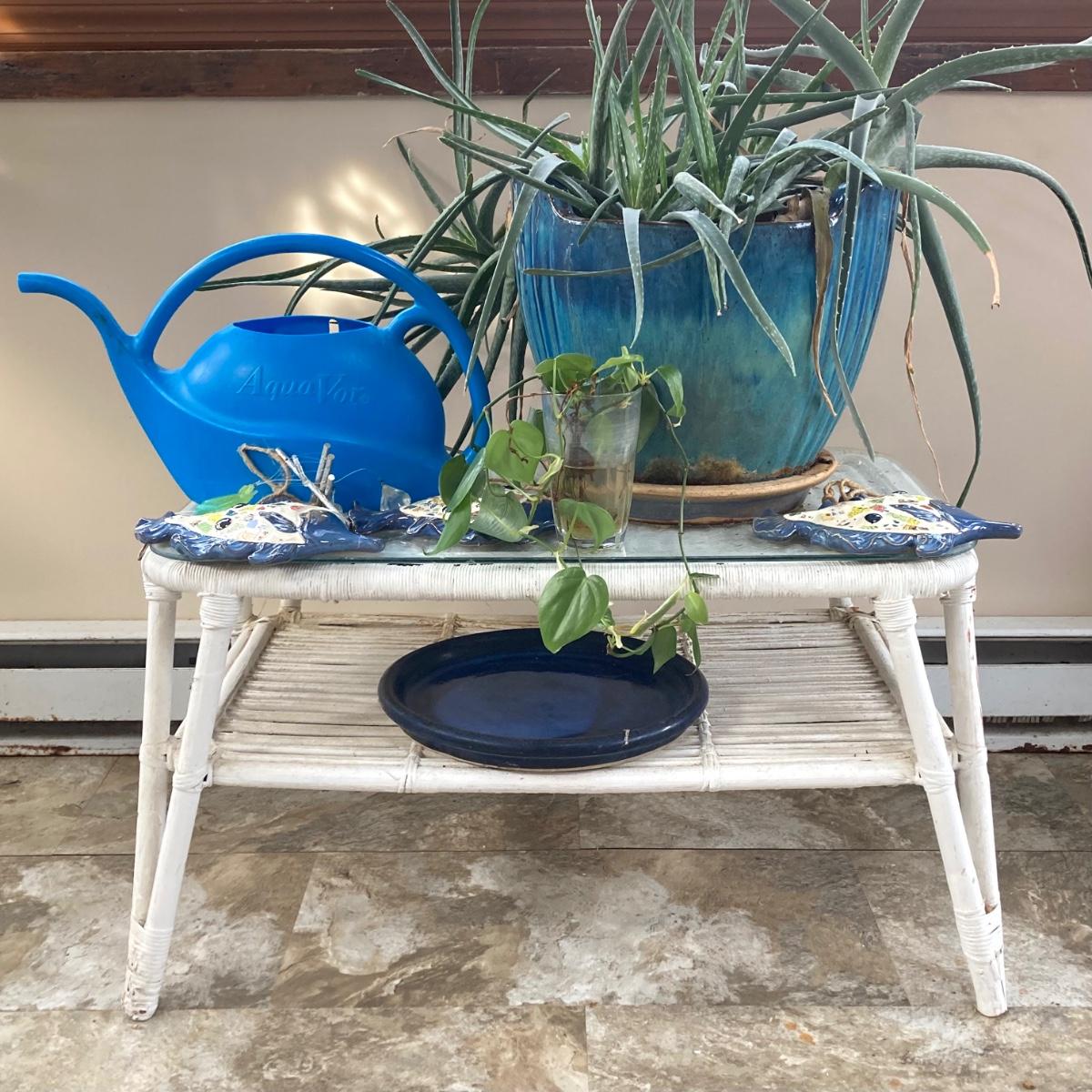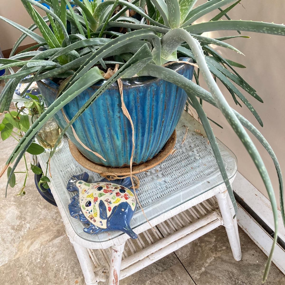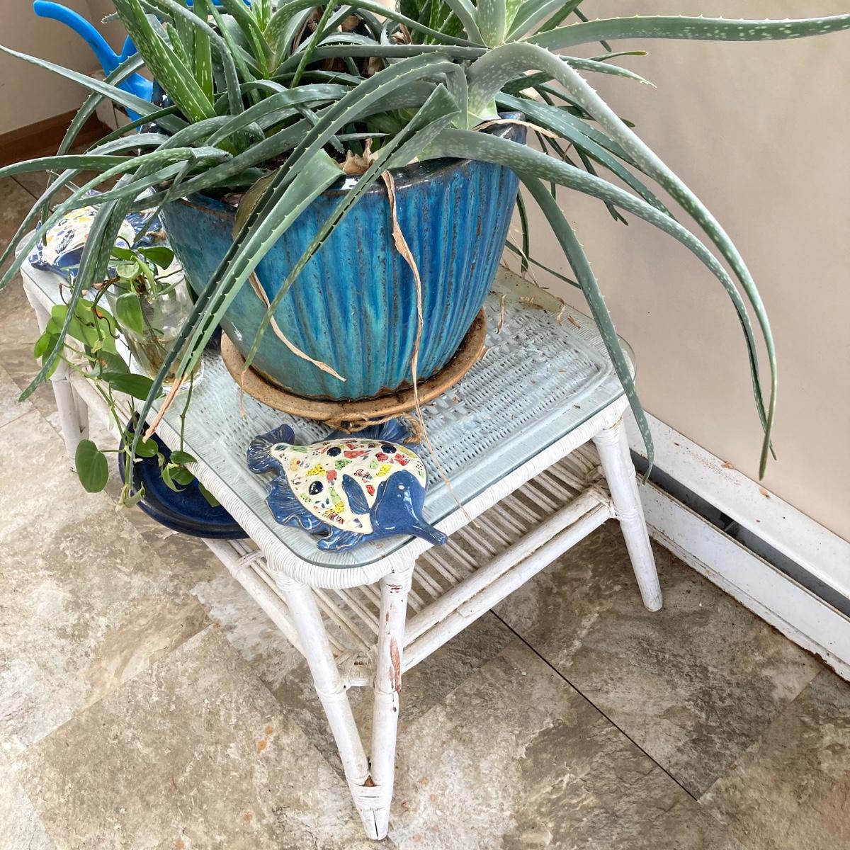 LOT 199: Wicker Accent / Patio Table with Live Aloe Plant, Pottery Fish and More