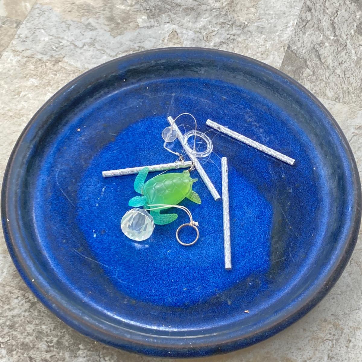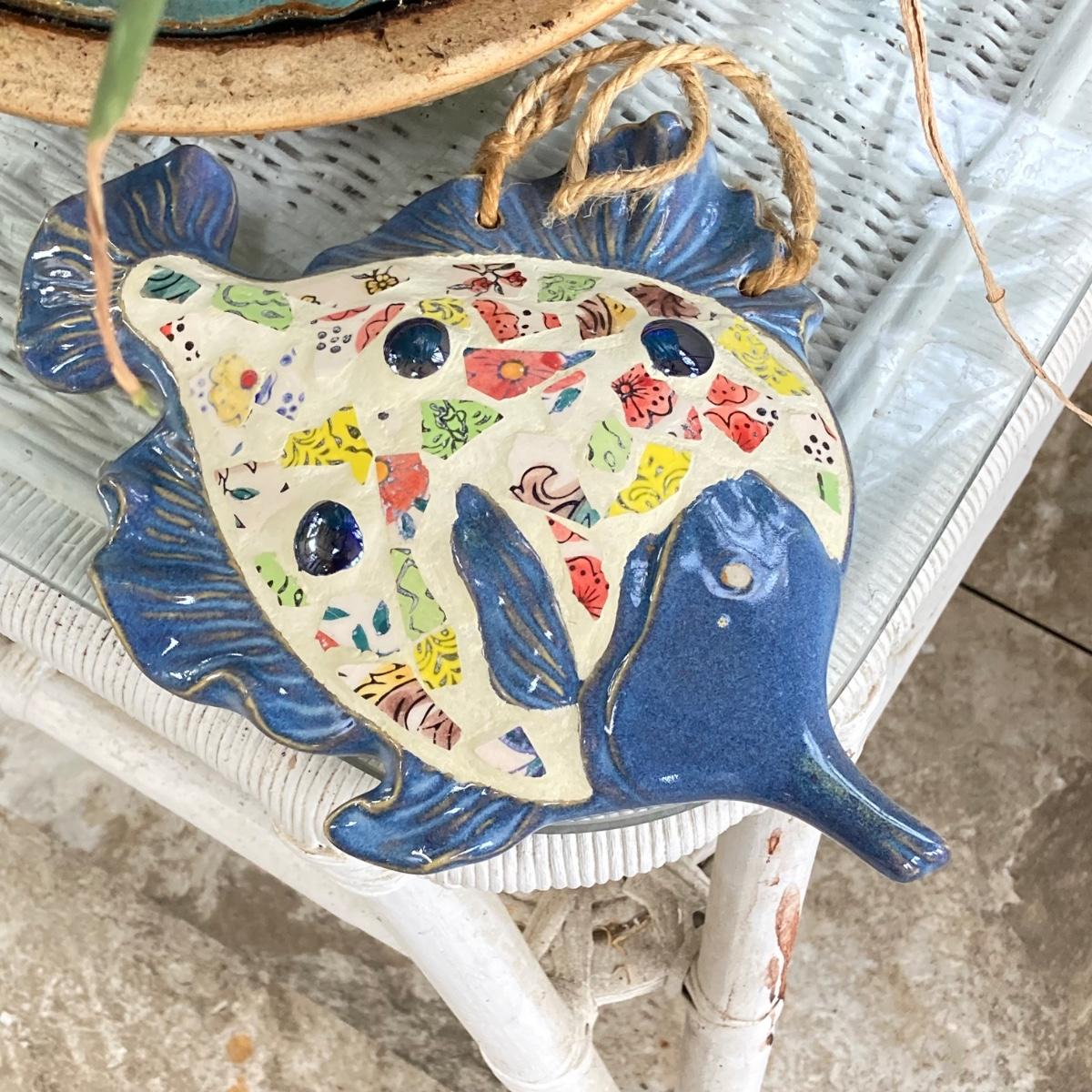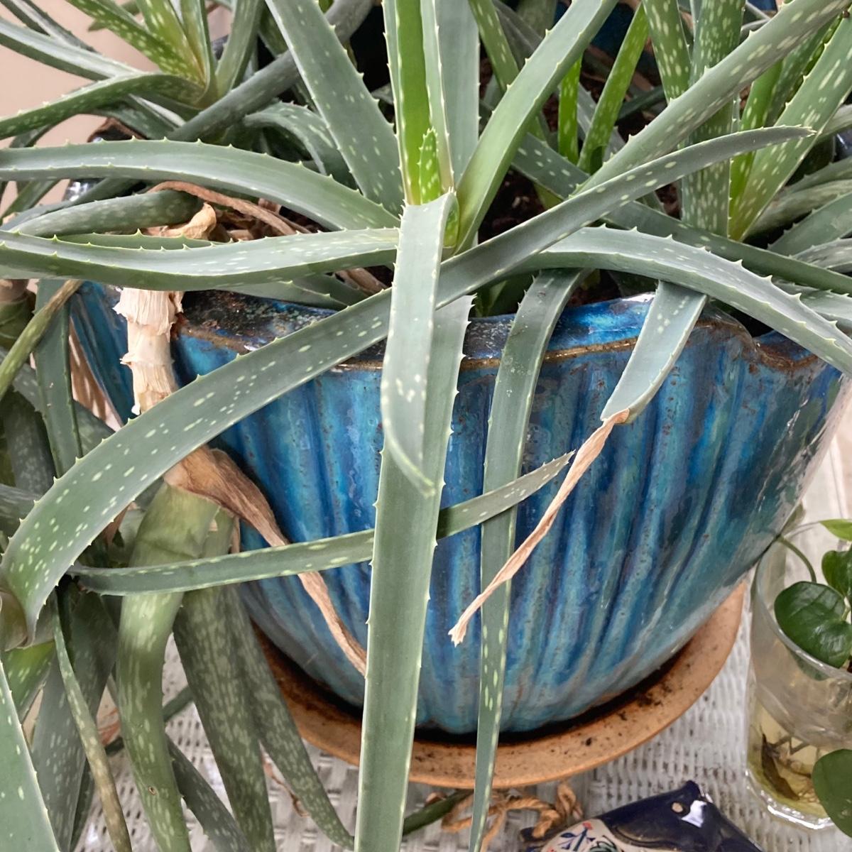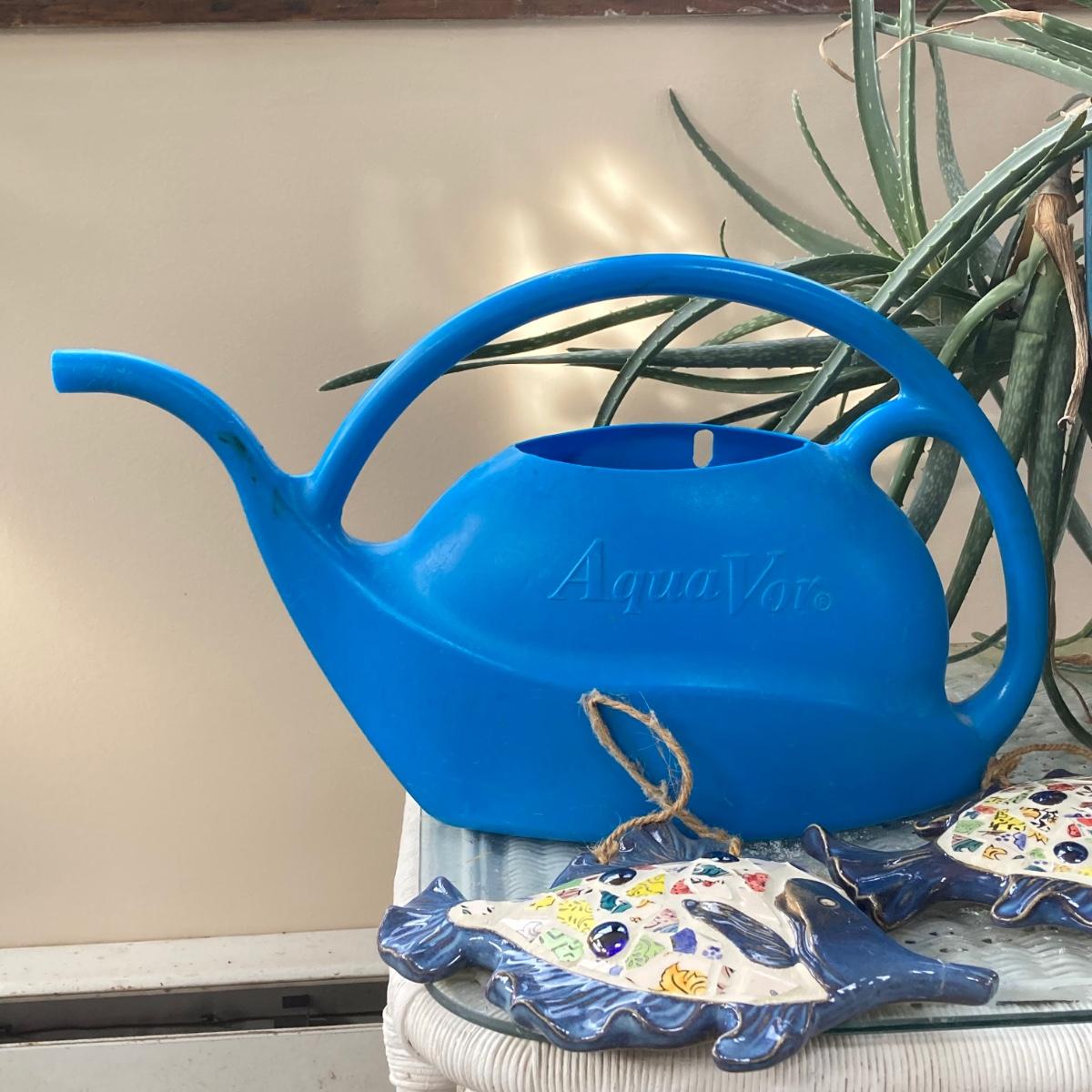 LOT 199: Wicker Accent / Patio Table with Live Aloe Plant, Pottery Fish and More