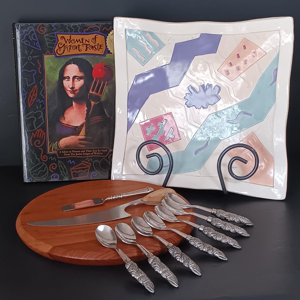 LOT 219: Vintage Barbara Demery Art Plate with Dansk Cheese Plate, 'Sharp' Cheese Knife & More