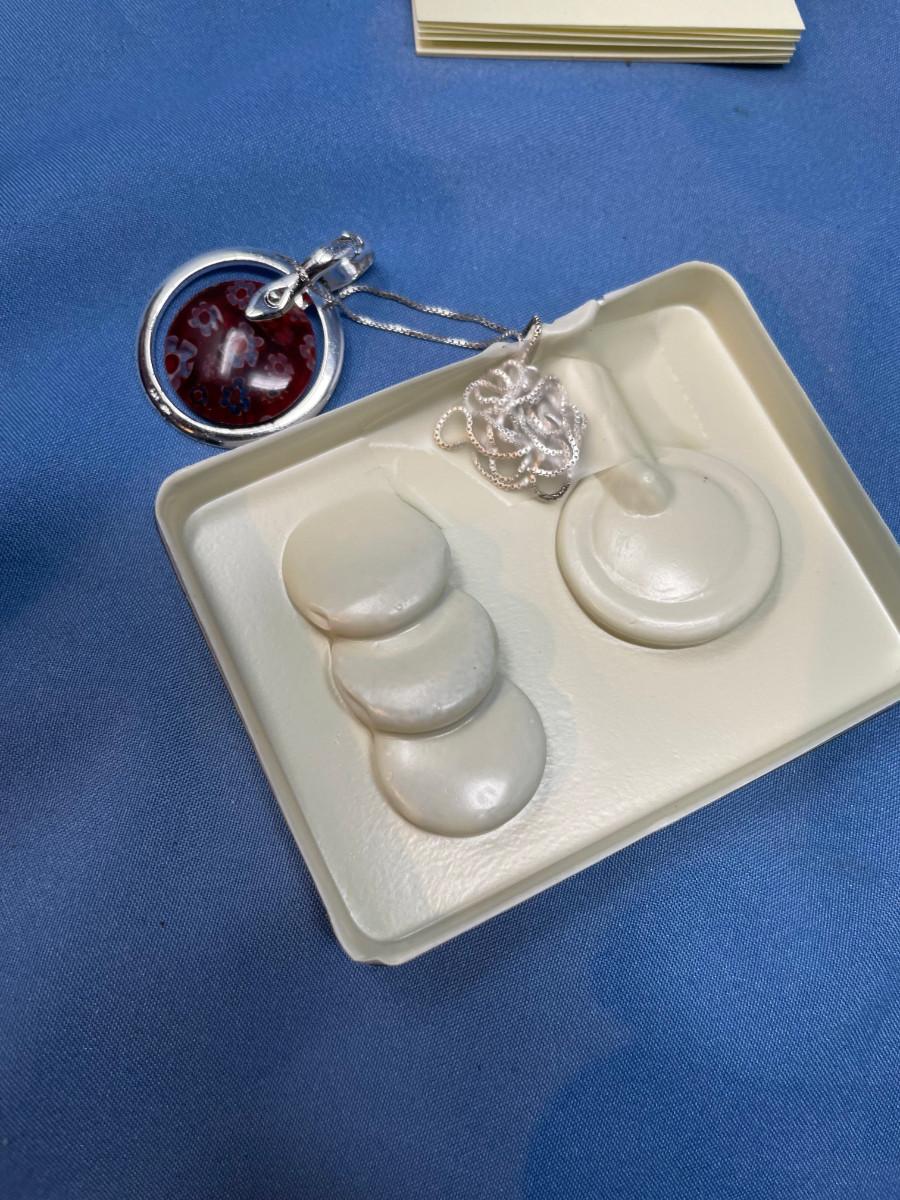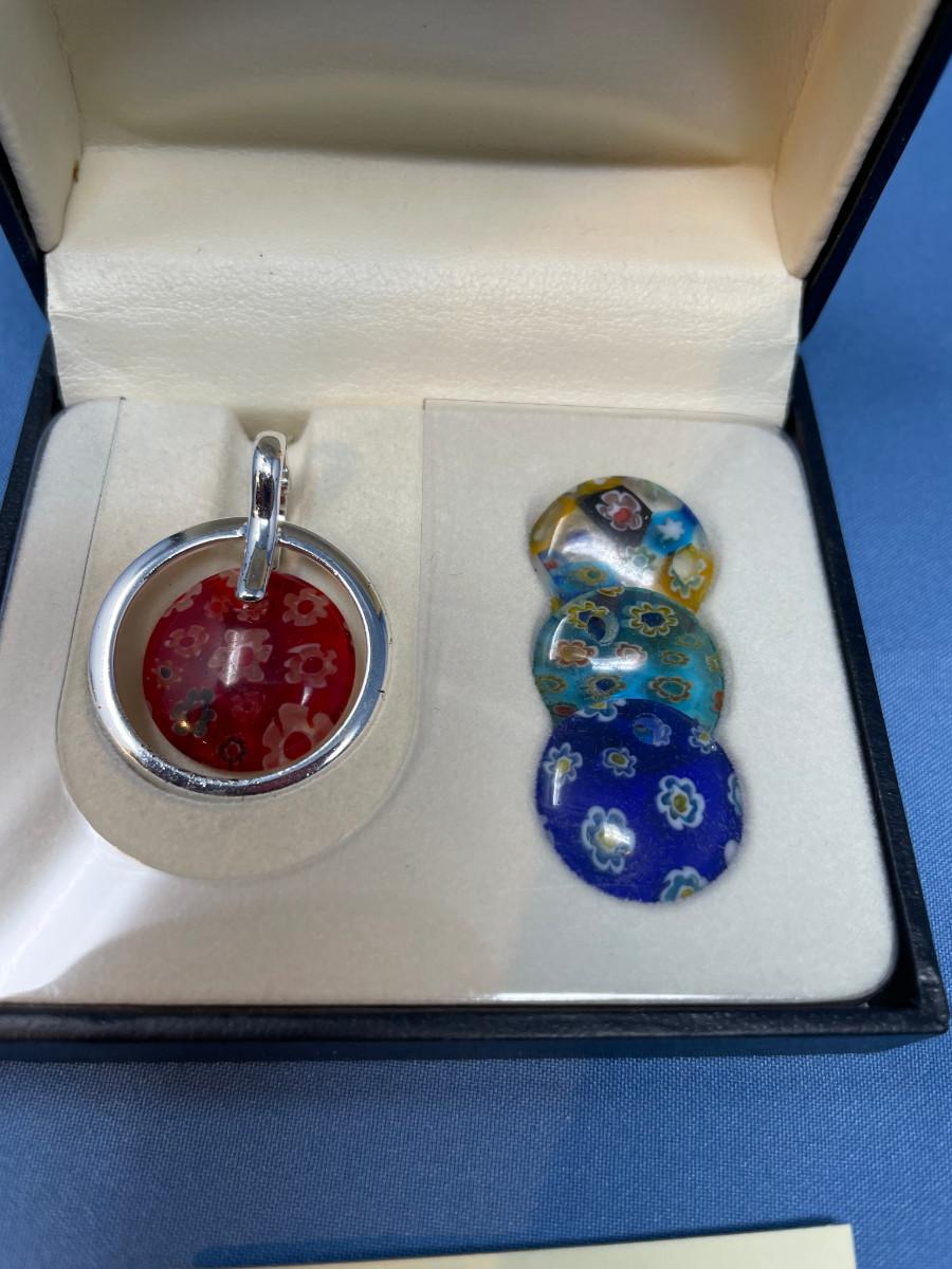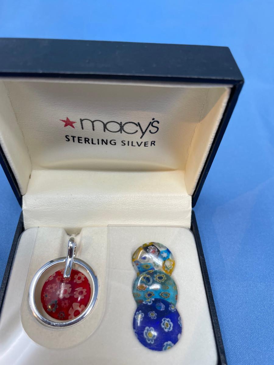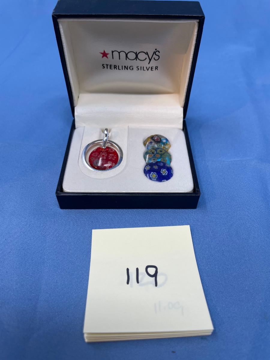 New in box! 4 interchangeable glass discs. Sterling silver frame and chain.