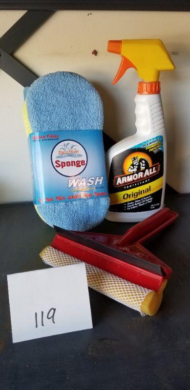 LOT #119: Car Wash Bundle - Sponge, Squeegie and Armor All (nearly full)