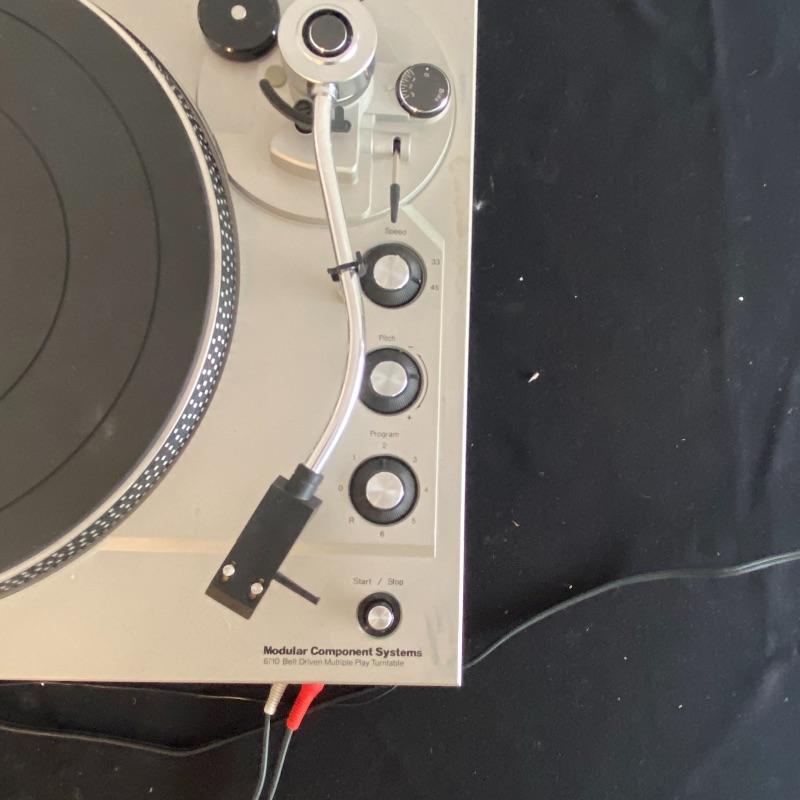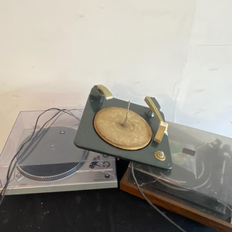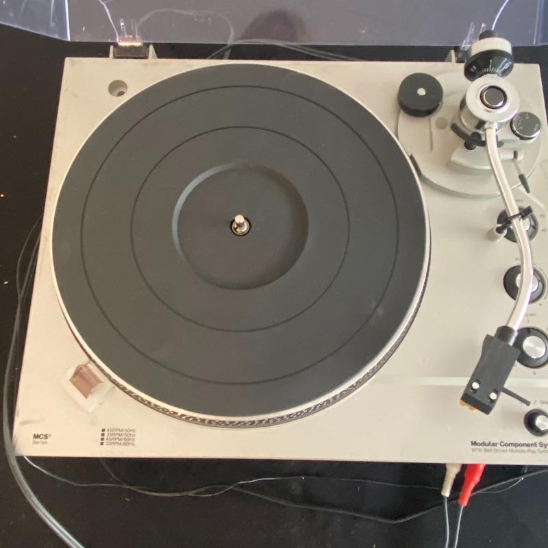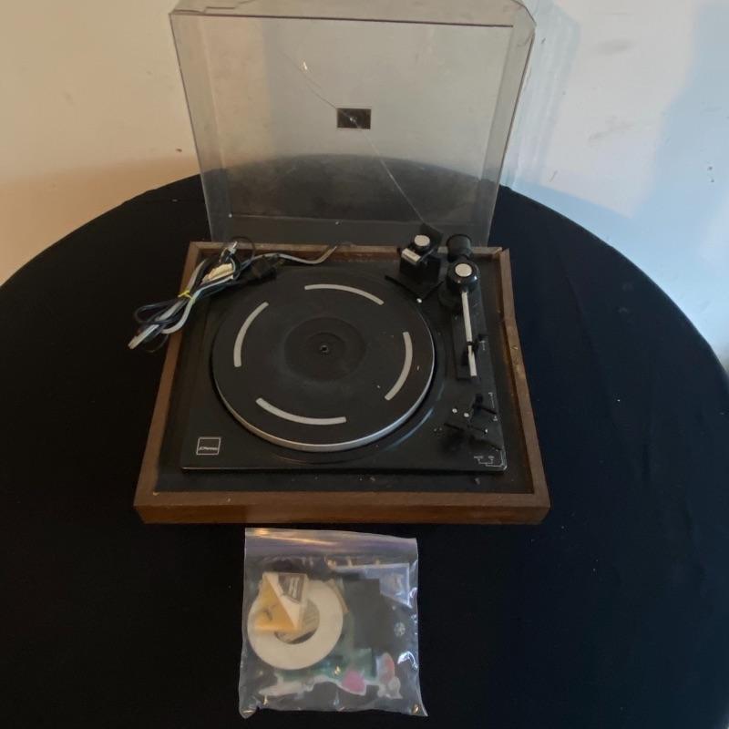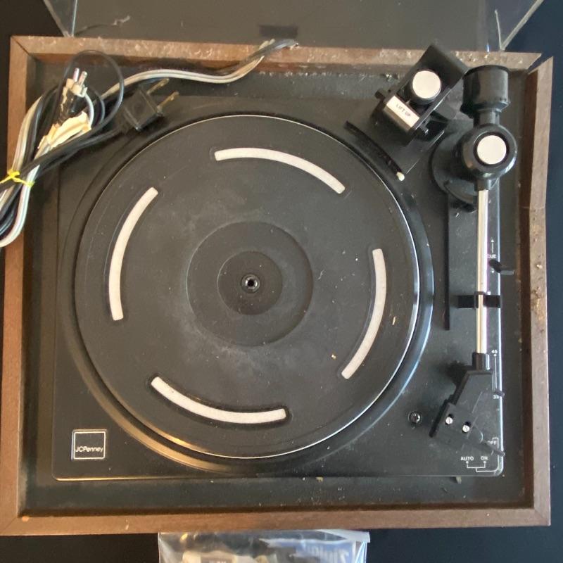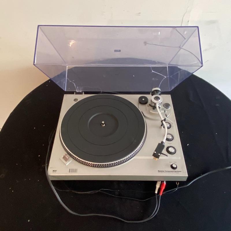 Lot of three turntables. First turntable is a complete unit with a gray base and adjustable legs, clear lid attached by hinges in the back. Modular component systems, MCS household brand for JCPenney. Cords included and working when tested. Second turntable is JCPenney. And would like face with lid placed on top to create full unit. Cords included working when tested. See photos for cracks in lids and broken piece on bases. The third turntable is a standalone vintage Westinghouse. Cord included working when tested. See photos!
