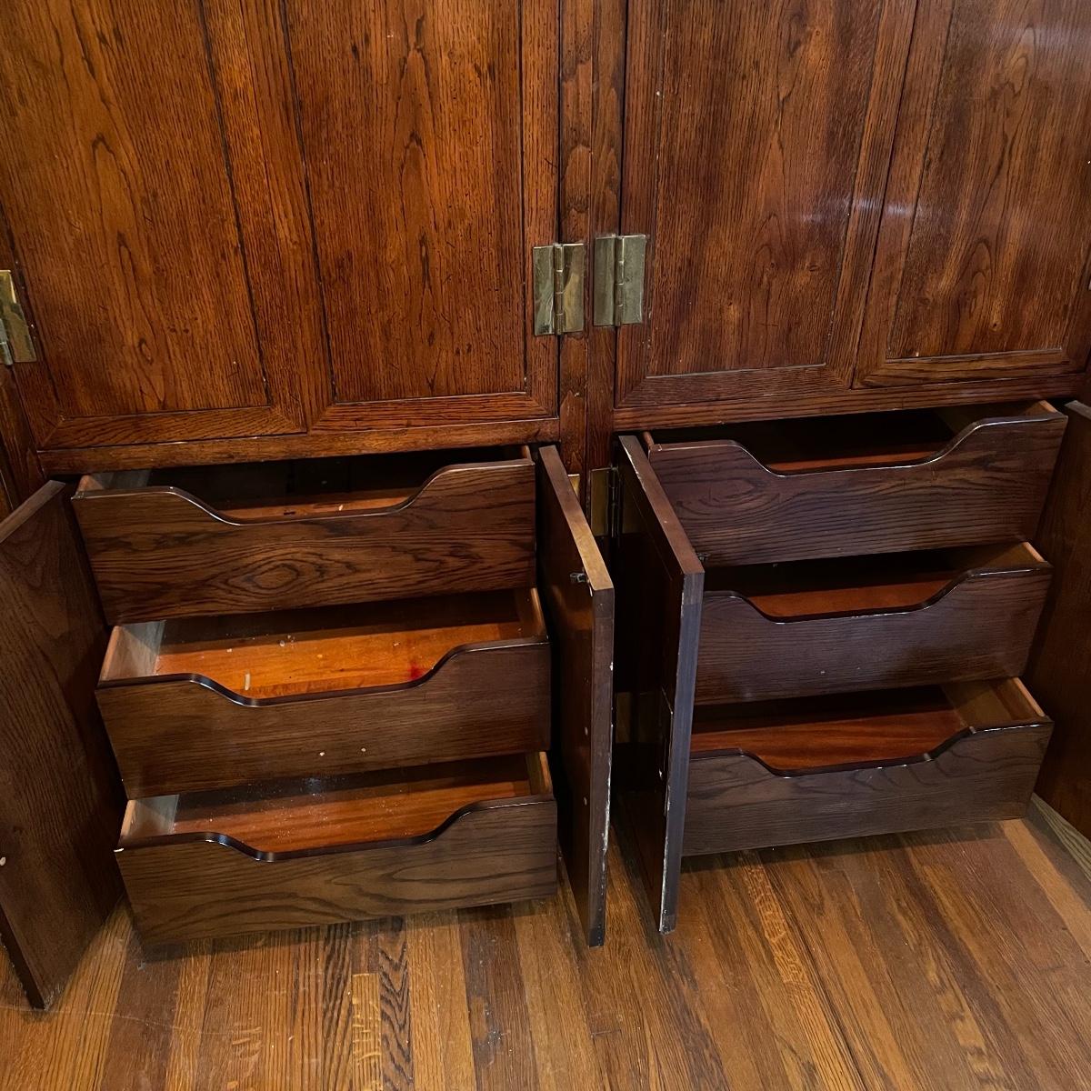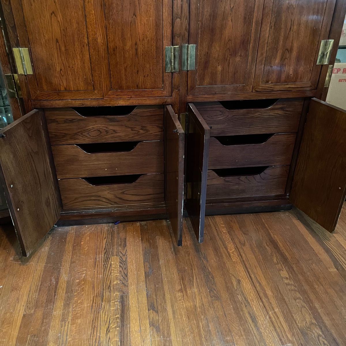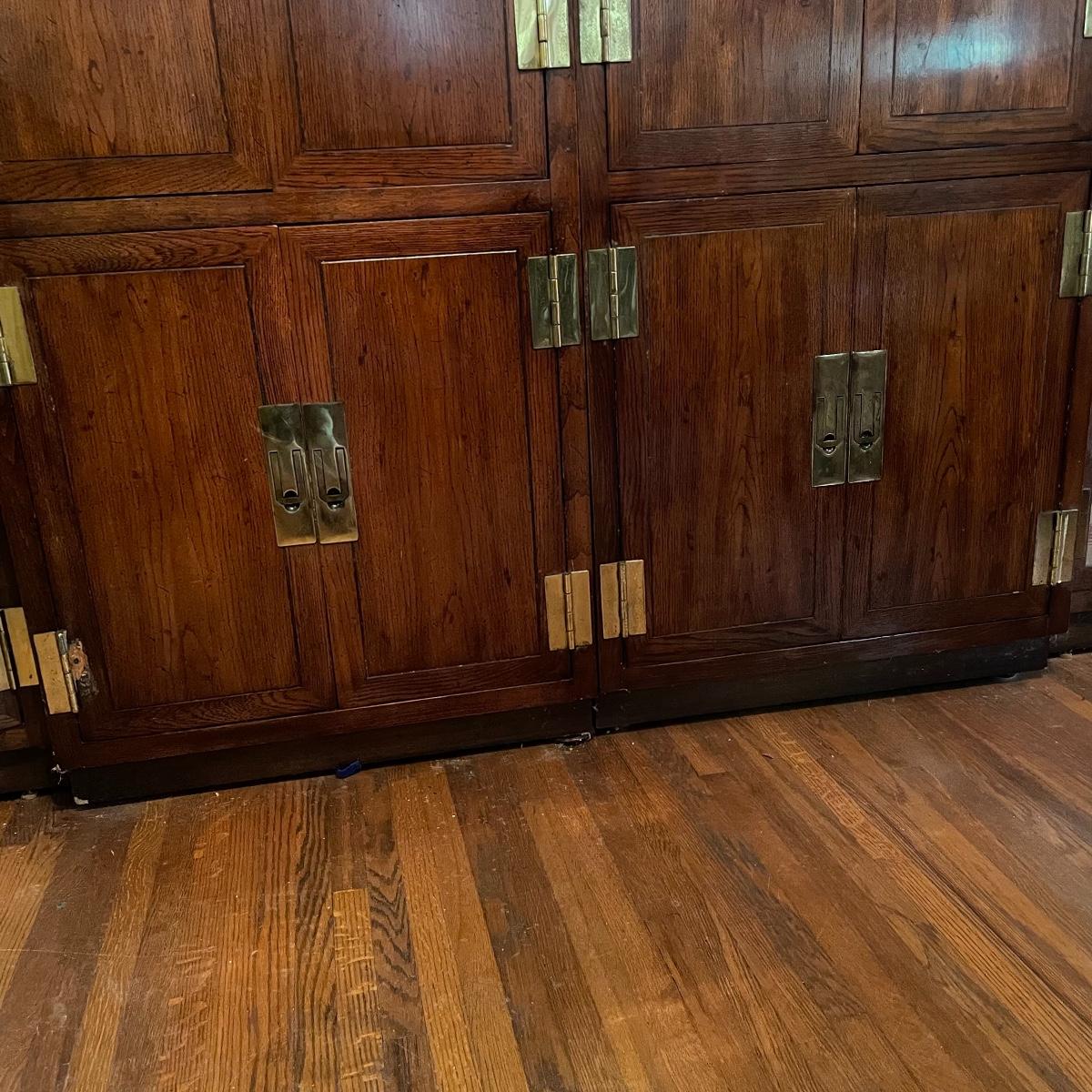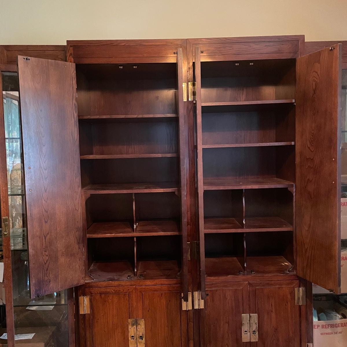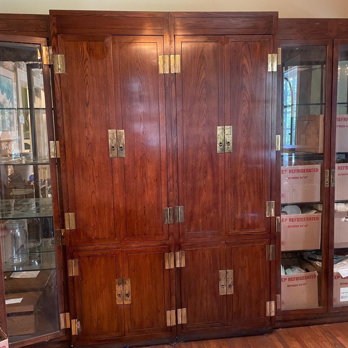 Two Henredon Cabinets with brass hardware and stunning wood grain. They were previously placed together, but would look great at opposite sides of a room. Each cabinet has two adjustable shelves along with one fixed shelf and four compartments at the perfect height for stemware. The lower cabinets each have three drawers hidden by the outer doors. These cabinets do not light up and we didn’t notice the Henredon logo, but they match the lighted cabinets in lot 112 and also the bar cabinet in lot 106. One hinge on the lower left of the left cabinet has broken, but it doesn’t affect the door’s efficiency. Both cabinets show a dust and a little mildew, a quick wipe with your favorite wood cleaner should do the trick. Each piece measures approximately 26” x 18” x 82.5”. The cabinets are one piece each and very heavy, please bring help to load, there are only two steps off the front porch to the driveway. See images. The glass cabinets shown on the sides of these wooden cabinets in photos are not included and can be found in lot 112. Local pick up only.