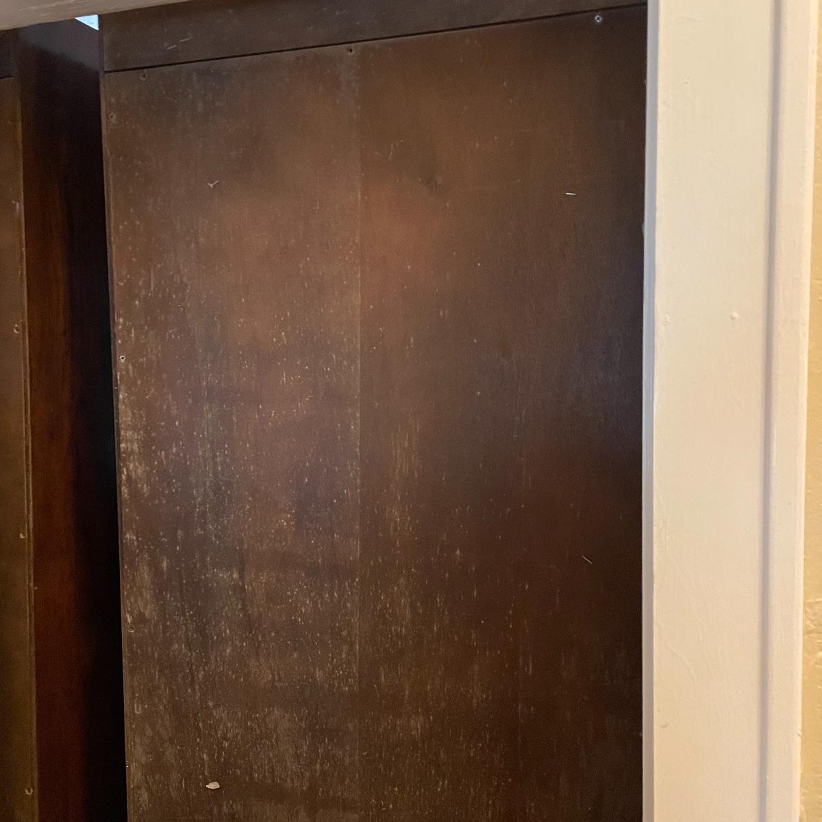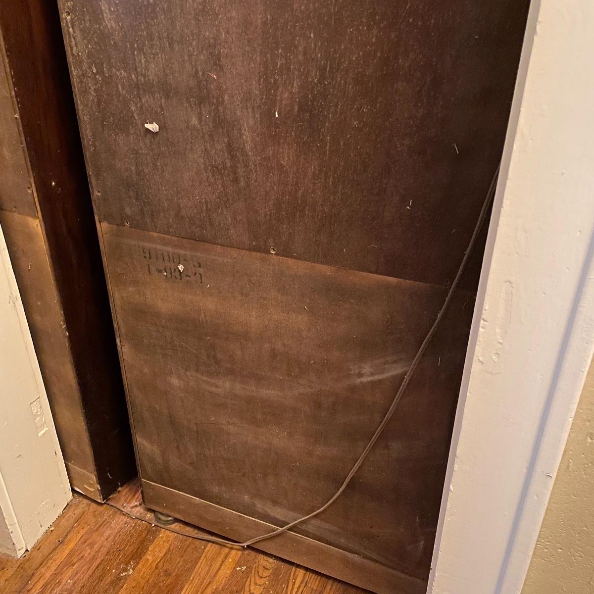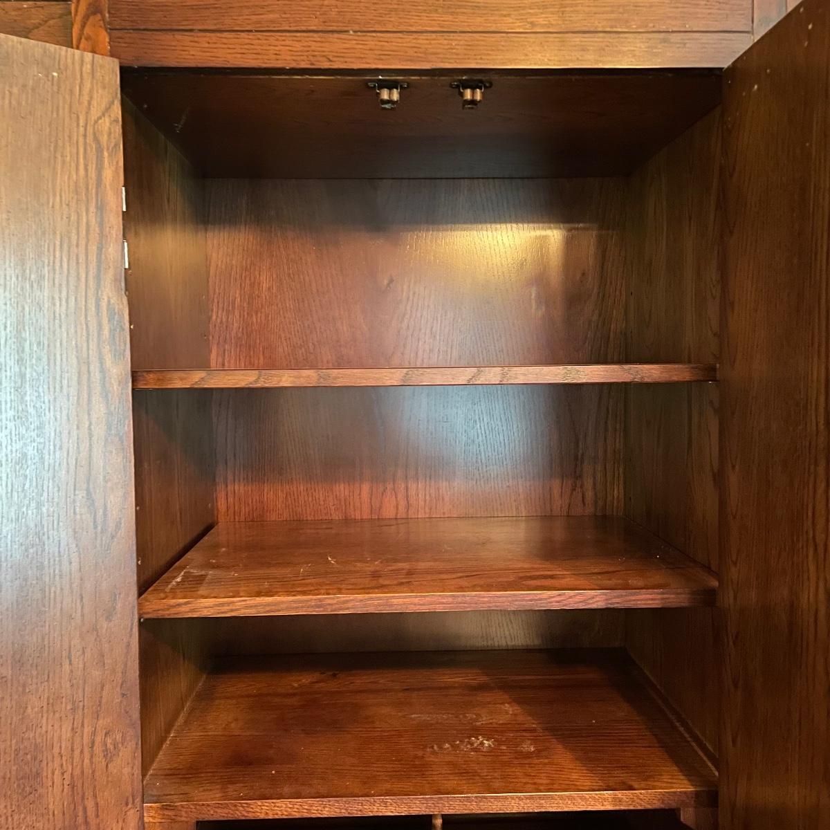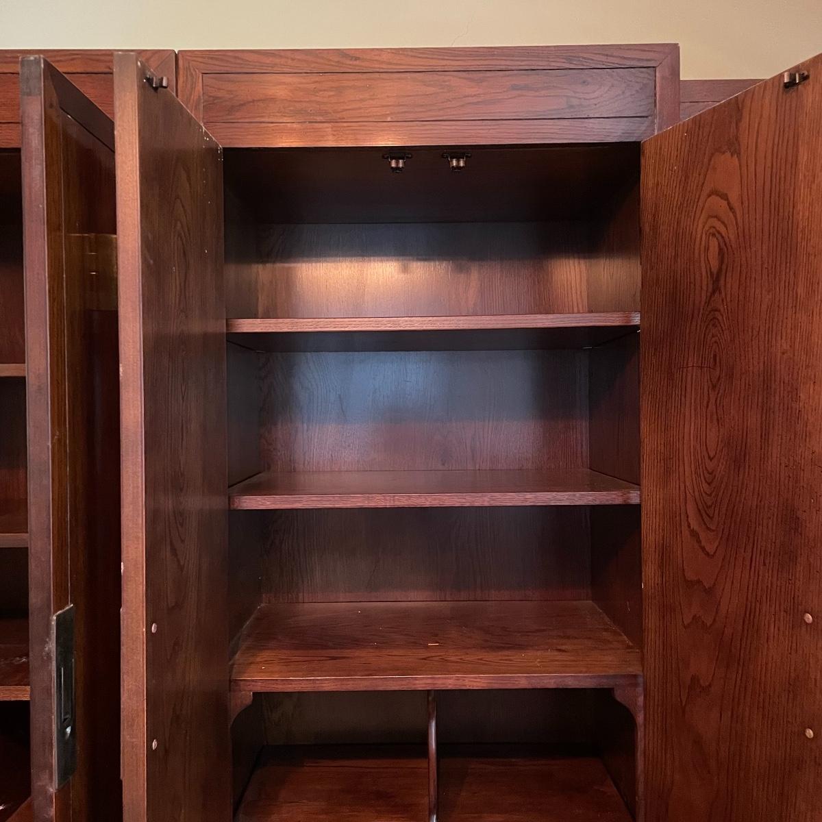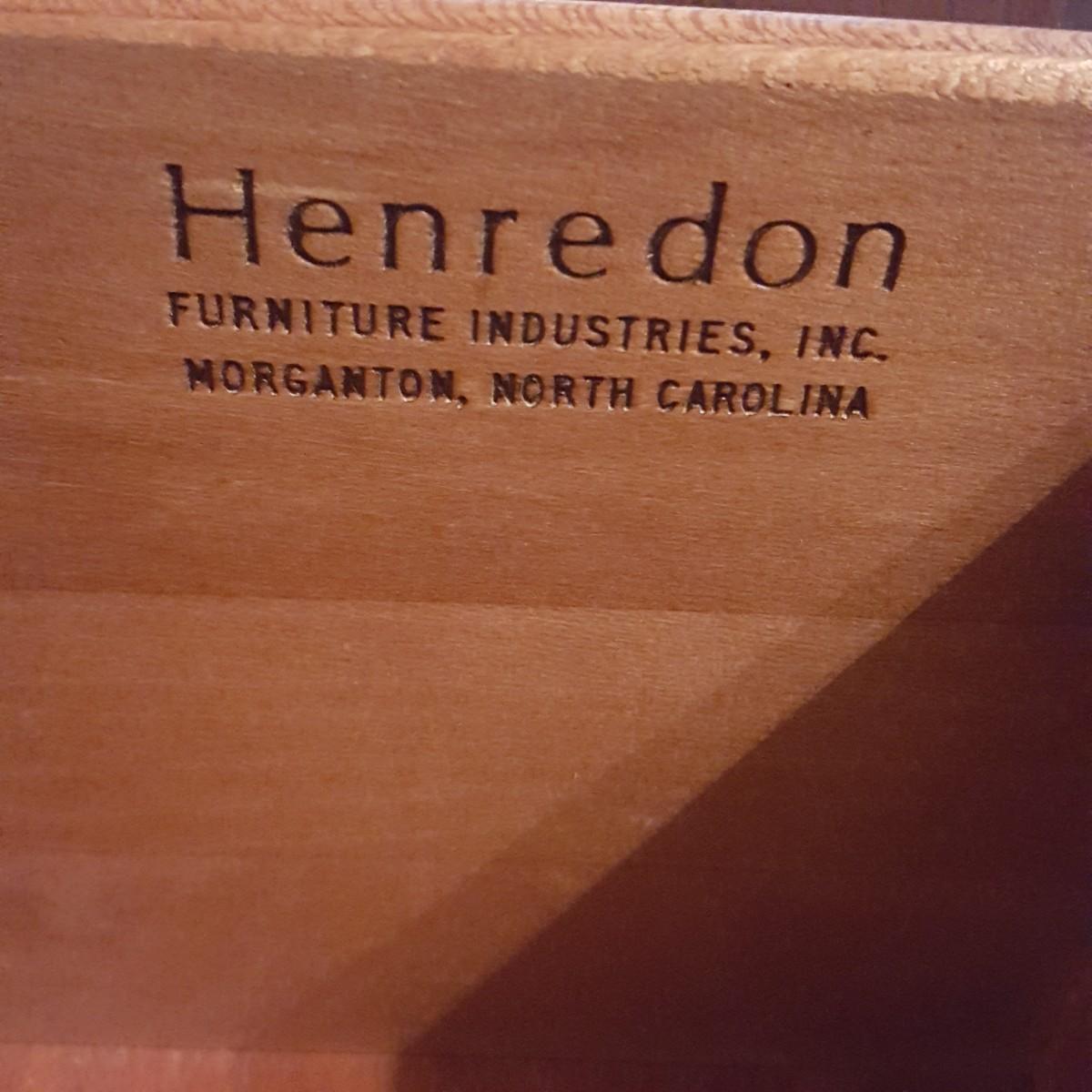 Two Henredon Cabinets with brass hardware and stunning wood grain. They were previously placed together, but would look great at opposite sides of a room. Each cabinet has two adjustable shelves along with one fixed shelf and four compartments at the perfect height for stemware. The lower cabinets each have three drawers hidden by the outer doors. These cabinets do not light up and we didn’t notice the Henredon logo, but they match the lighted cabinets in lot 112 and also the bar cabinet in lot 106. One hinge on the lower left of the left cabinet has broken, but it doesn’t affect the door’s efficiency. Both cabinets show a dust and a little mildew, a quick wipe with your favorite wood cleaner should do the trick. Each piece measures approximately 26” x 18” x 82.5”. The cabinets are one piece each and very heavy, please bring help to load, there are only two steps off the front porch to the driveway. See images. The glass cabinets shown on the sides of these wooden cabinets in photos are not included and can be found in lot 112. Local pick up only.