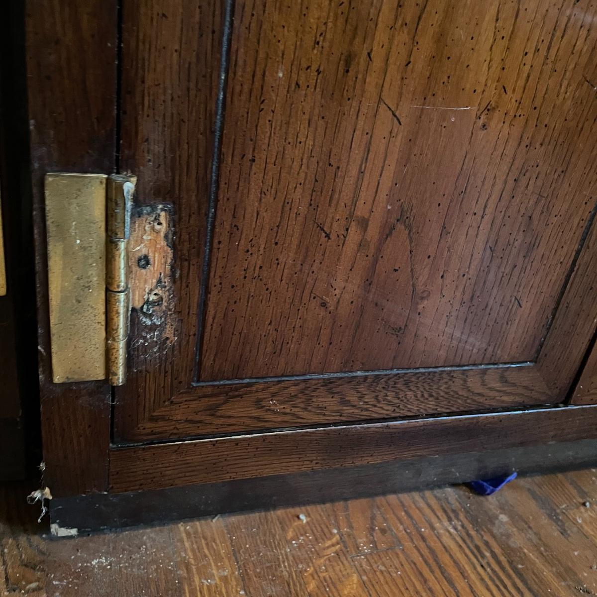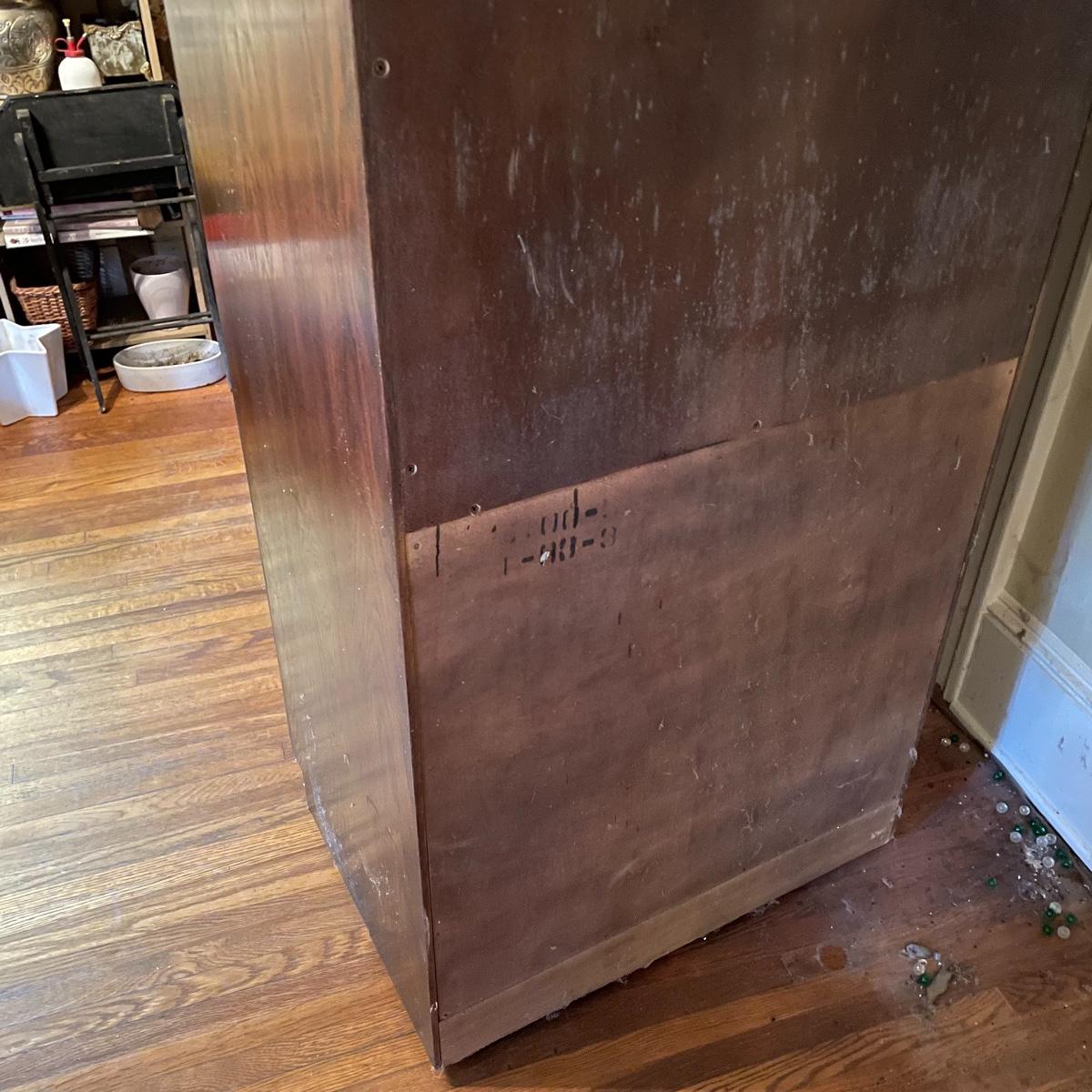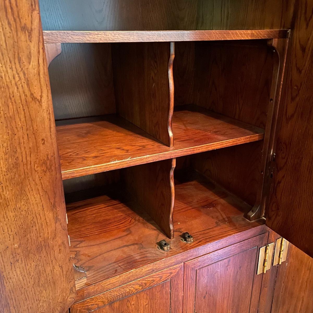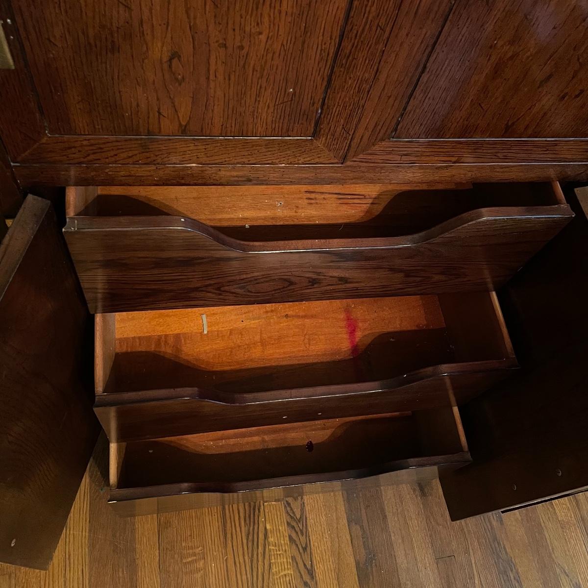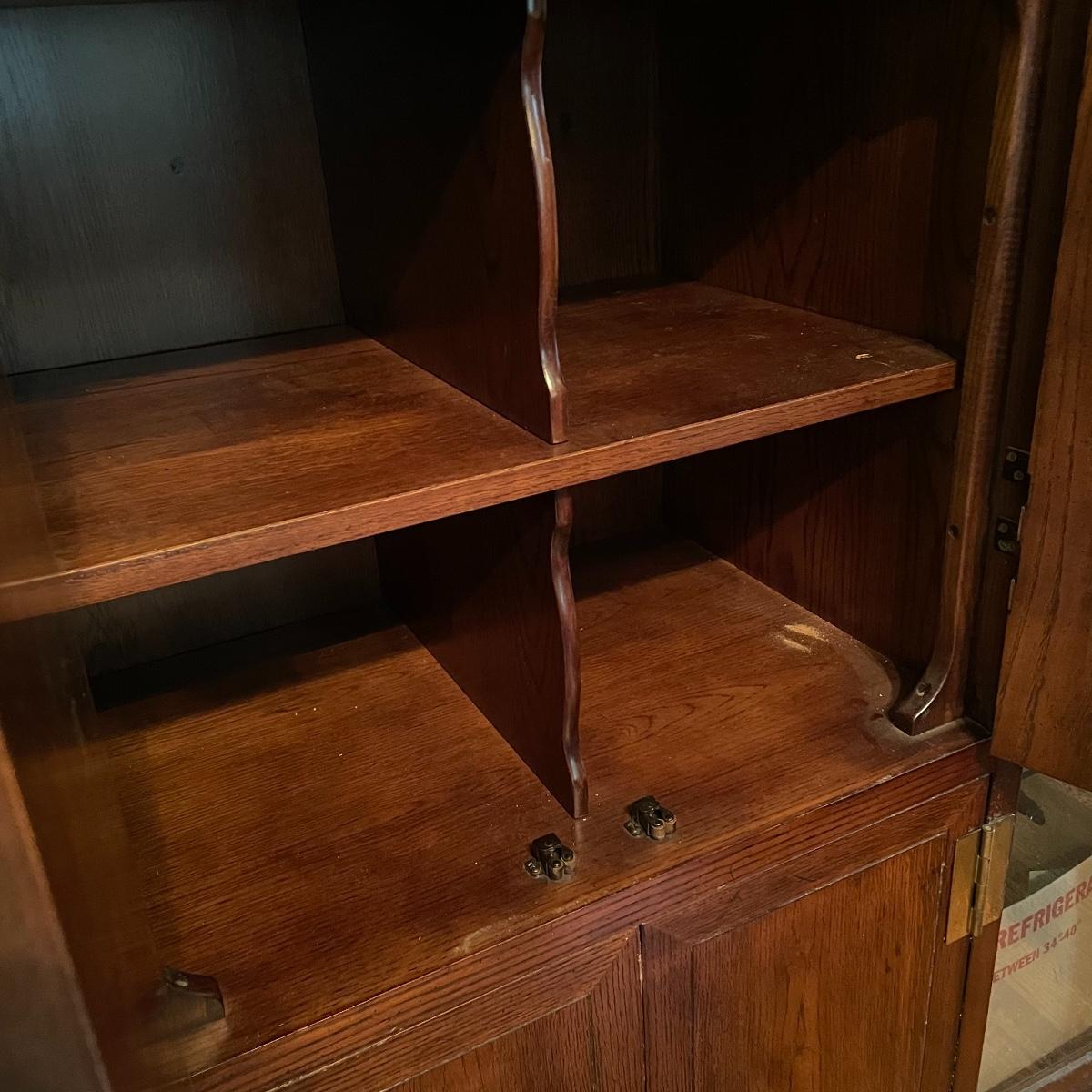 Two Henredon Cabinets with brass hardware and stunning wood grain. They were previously placed together, but would look great at opposite sides of a room. Each cabinet has two adjustable shelves along with one fixed shelf and four compartments at the perfect height for stemware. The lower cabinets each have three drawers hidden by the outer doors. These cabinets do not light up and we didn’t notice the Henredon logo, but they match the lighted cabinets in lot 112 and also the bar cabinet in lot 106. One hinge on the lower left of the left cabinet has broken, but it doesn’t affect the door’s efficiency. Both cabinets show a dust and a little mildew, a quick wipe with your favorite wood cleaner should do the trick. Each piece measures approximately 26” x 18” x 82.5”. The cabinets are one piece each and very heavy, please bring help to load, there are only two steps off the front porch to the driveway. See images. The glass cabinets shown on the sides of these wooden cabinets in photos are not included and can be found in lot 112. Local pick up only.