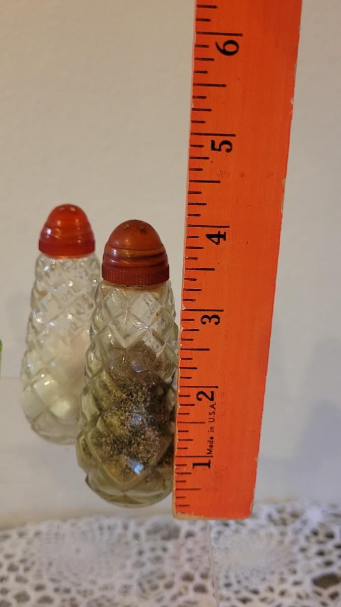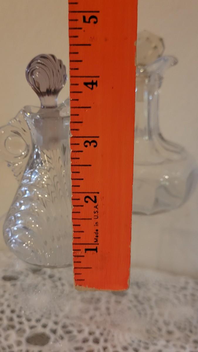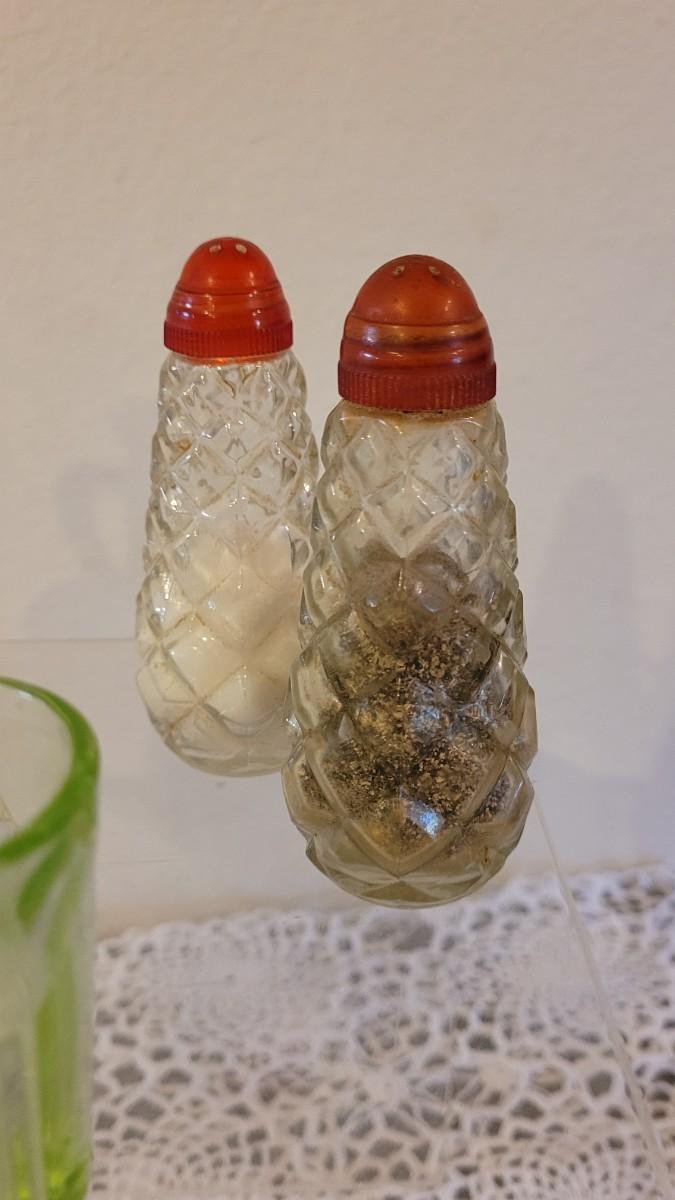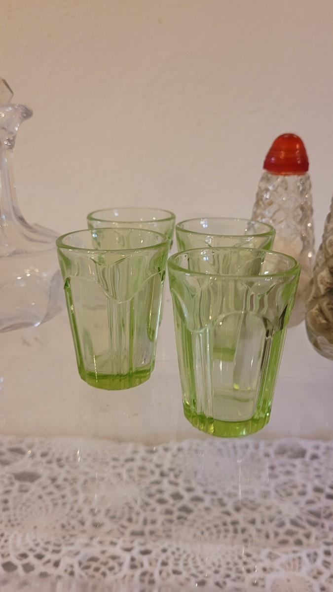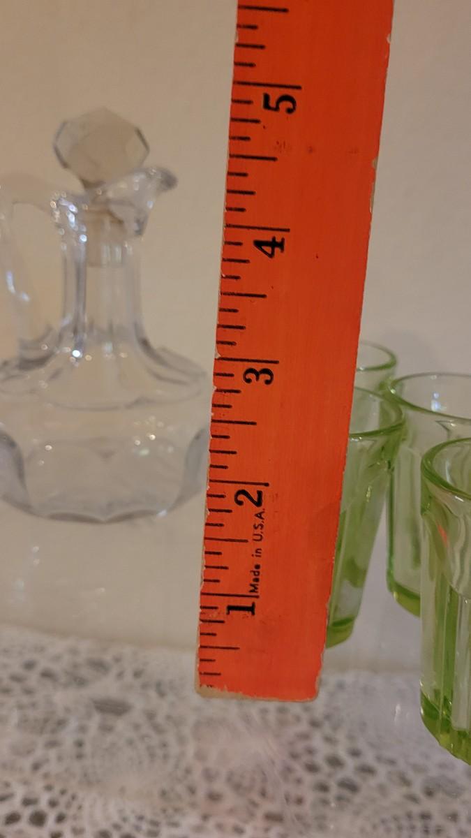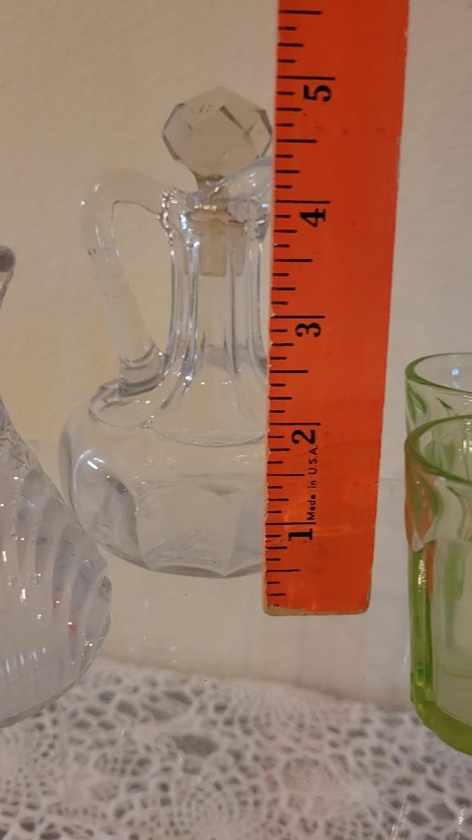 Lot 119: Antique/Vintage Cut Glass Cruet Bottles, Salt & Pepper Shakers and Green Depression Glass Shot Glasses (4)