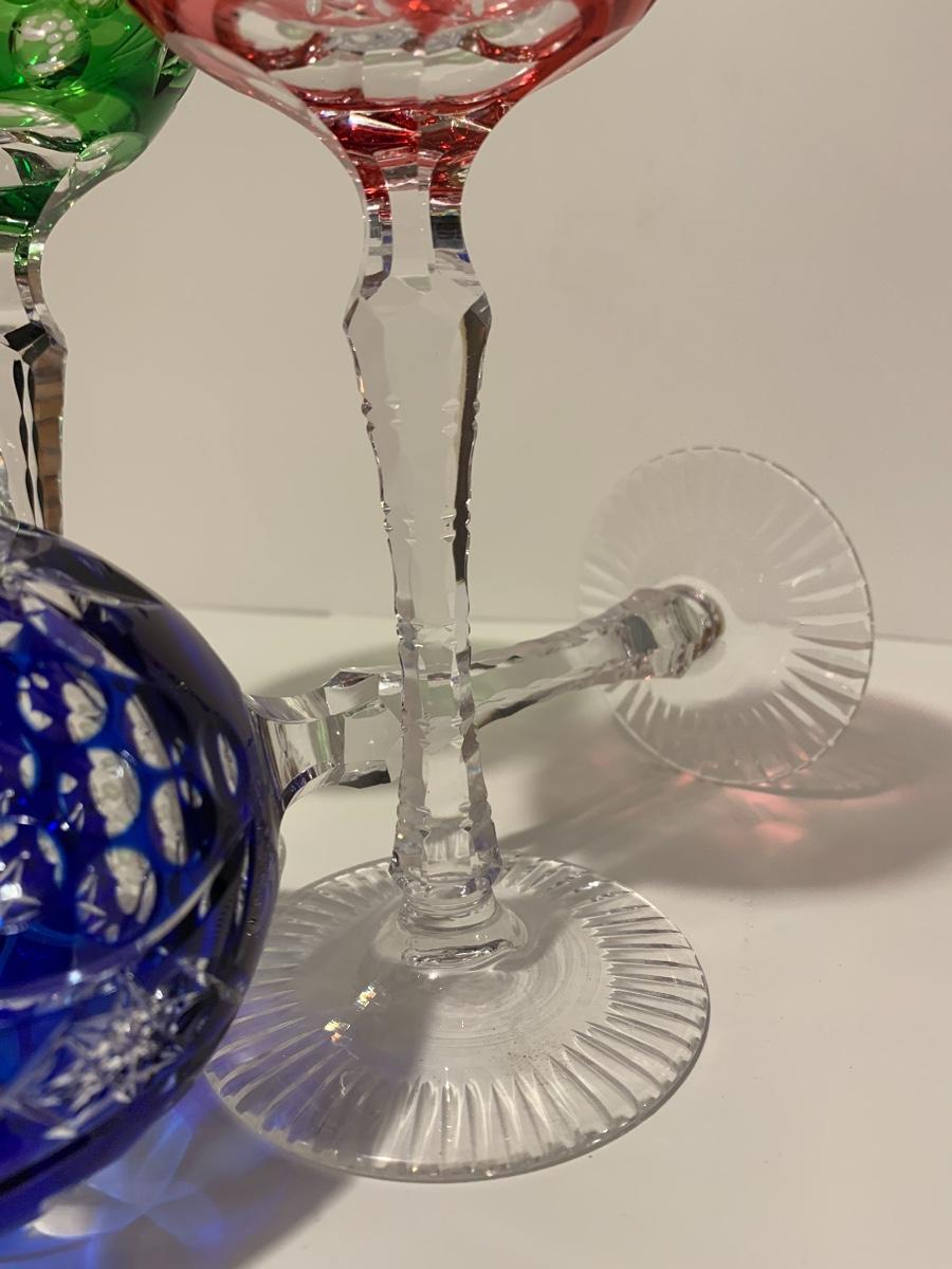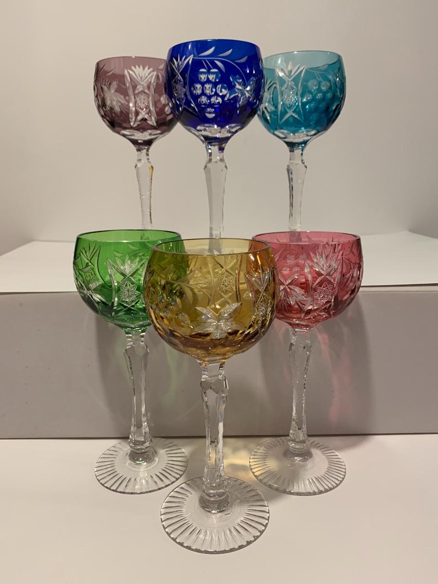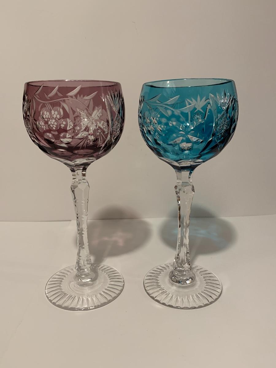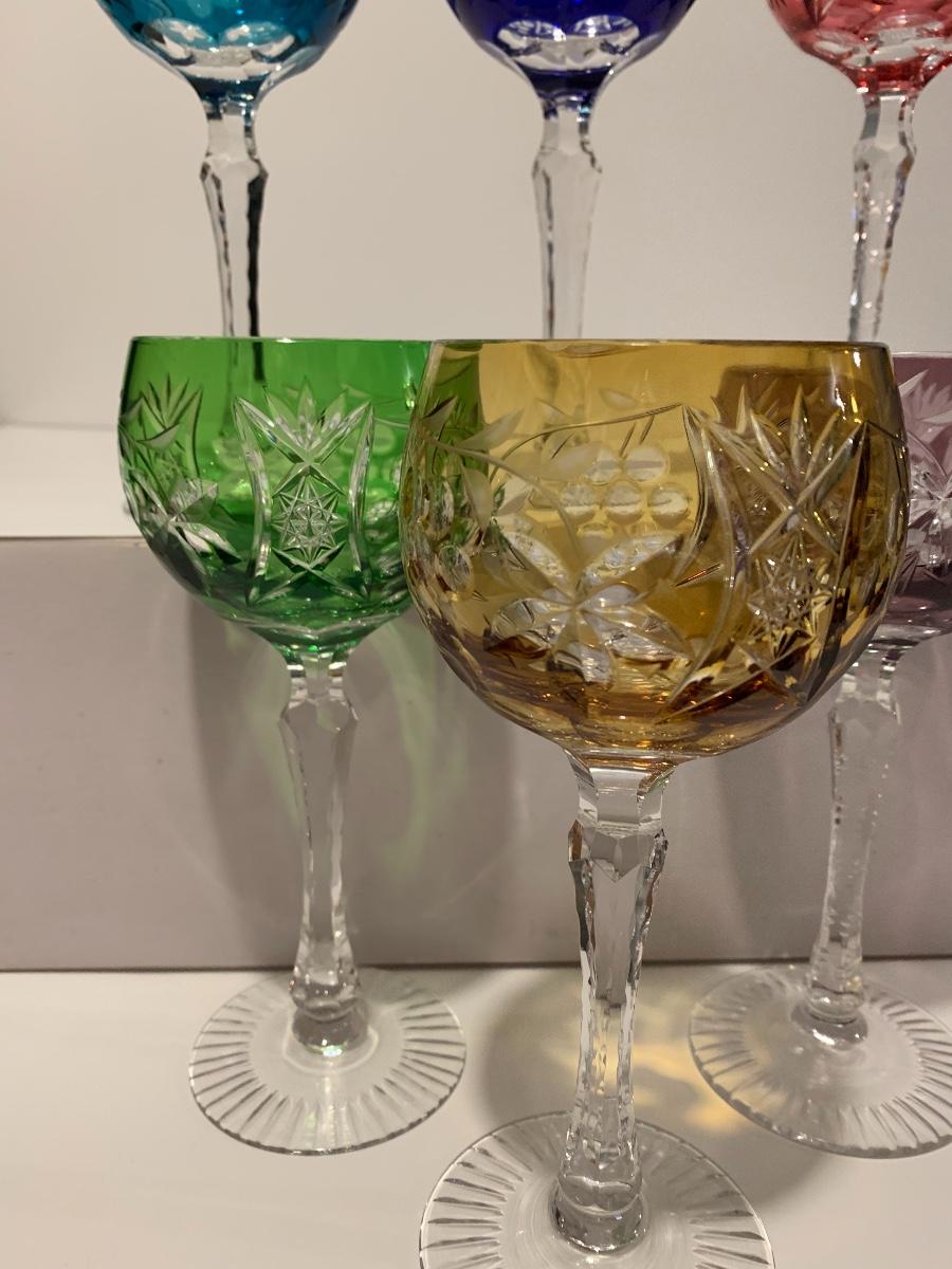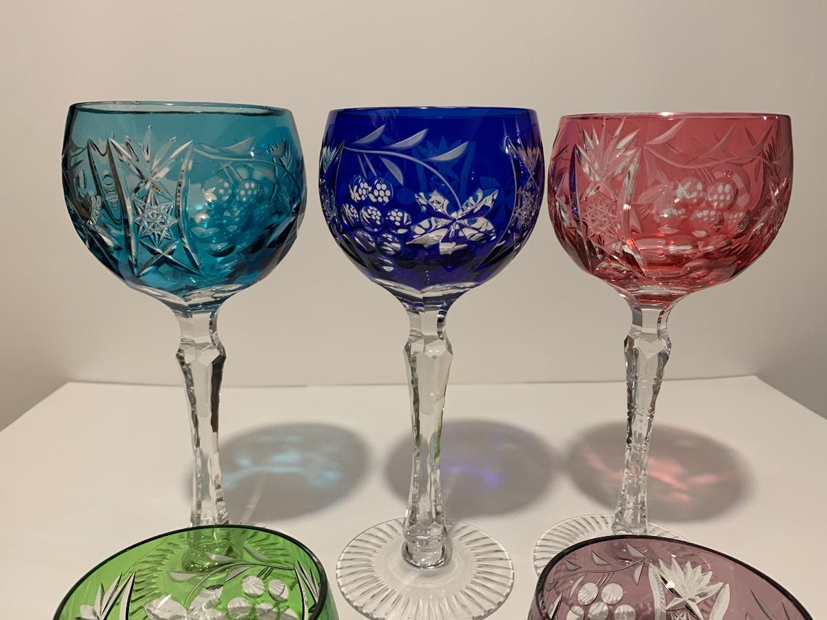 Beautiful set of 6 multicolored cut to clear stemware with notched stems from Germany. Pretty grape and leaves pattern with a crystal-clear base. Just stunning. They have had minimal use if any. The crystal is nice and clear without any residue.