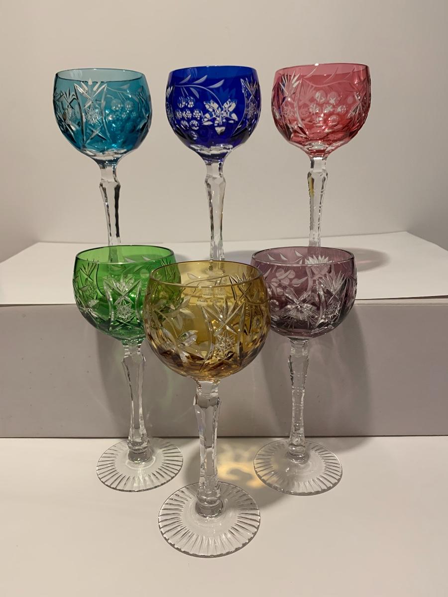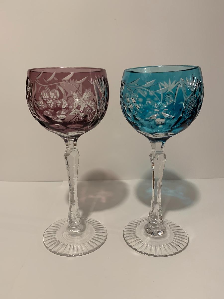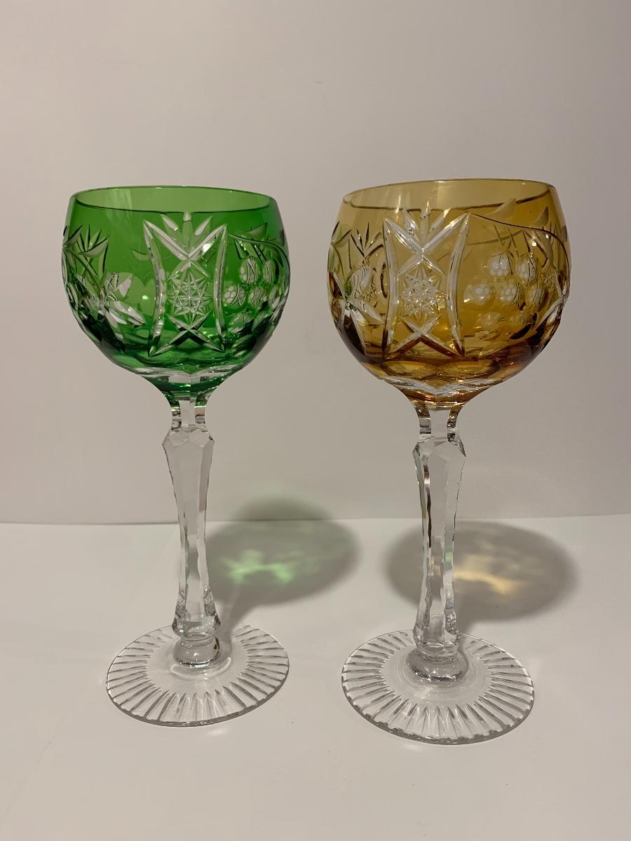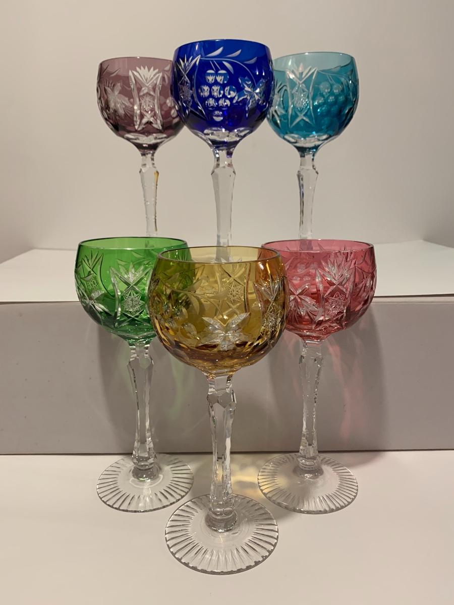 Beautiful set of 6 multicolored cut to clear stemware with notched stems from Germany. Pretty grape and leaves pattern with a crystal-clear base. Just stunning. They have had minimal use if any. The crystal is nice and clear without any residue.