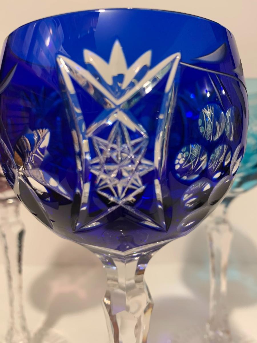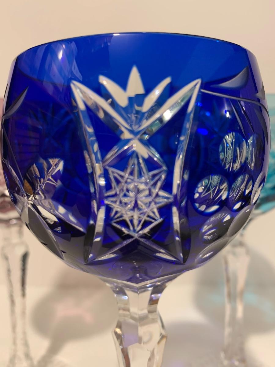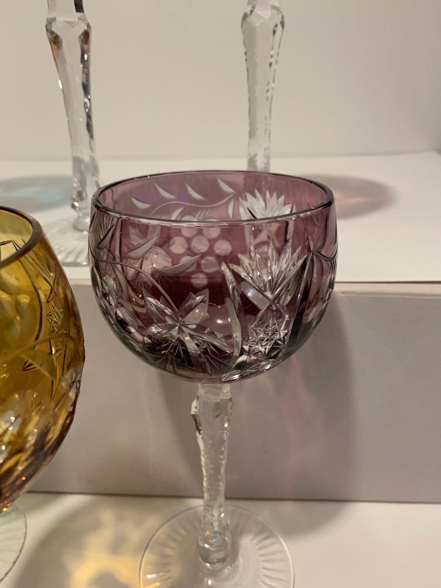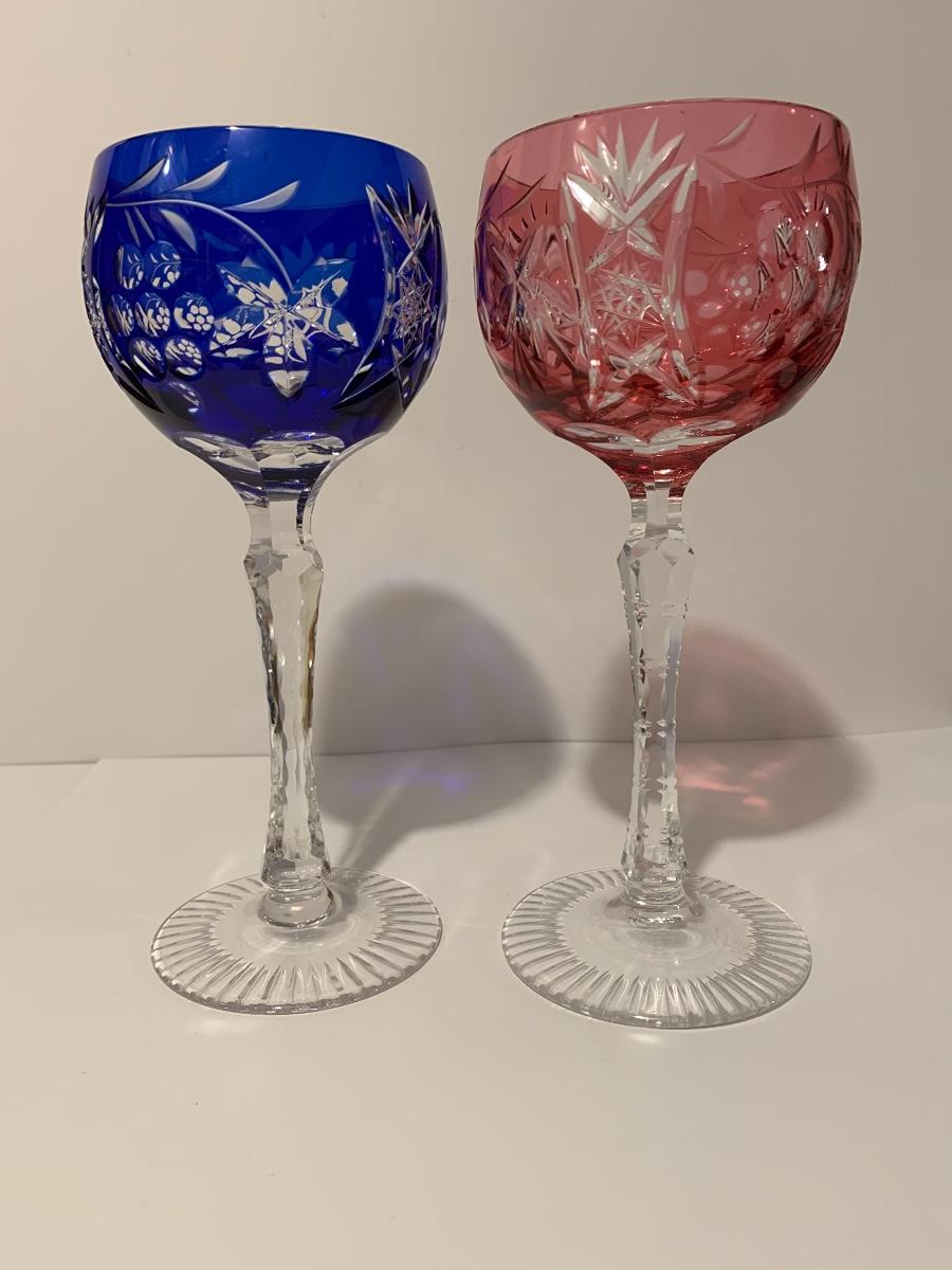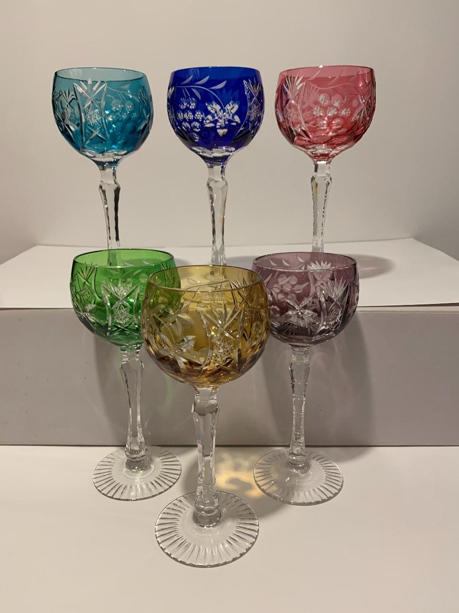 Beautiful set of 6 multicolored cut to clear stemware with notched stems from Germany. Pretty grape and leaves pattern with a crystal-clear base. Just stunning. They have had minimal use if any. The crystal is nice and clear without any residue.