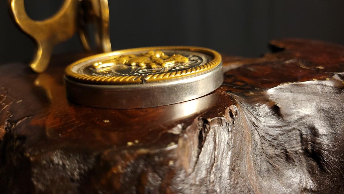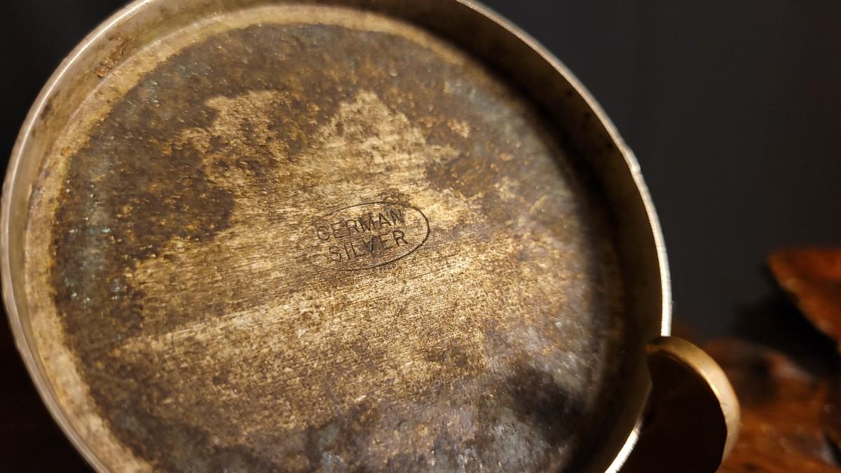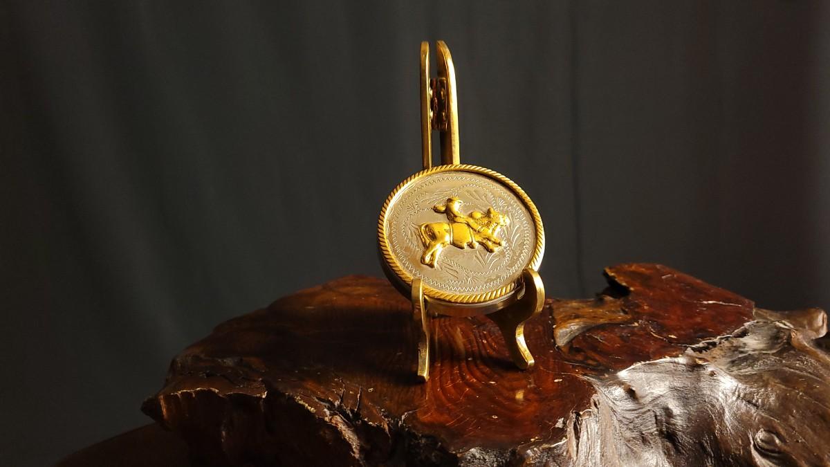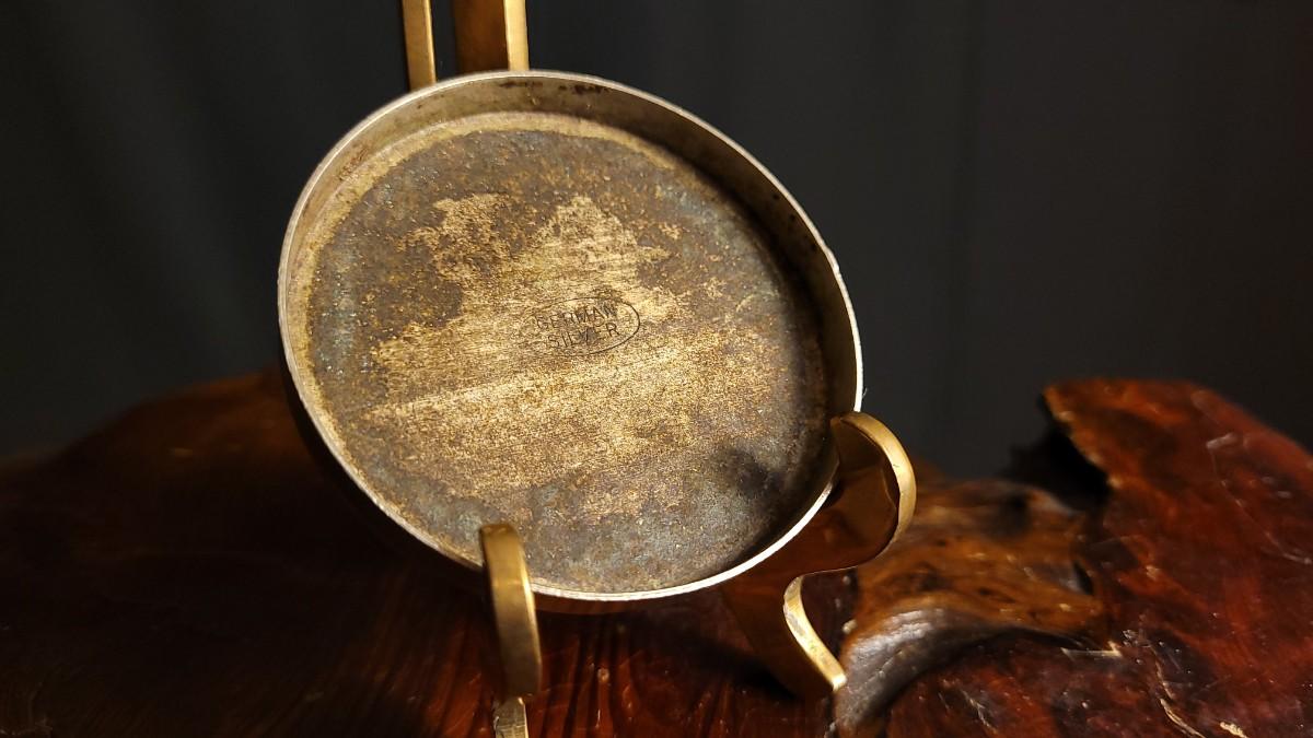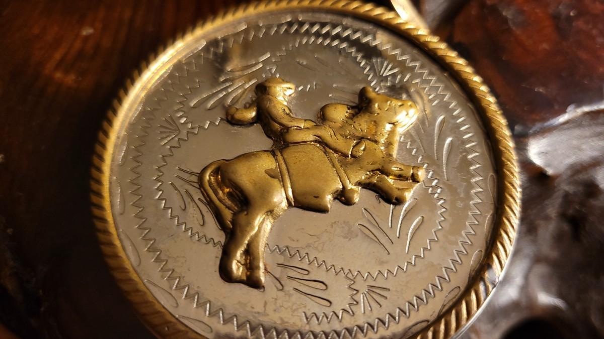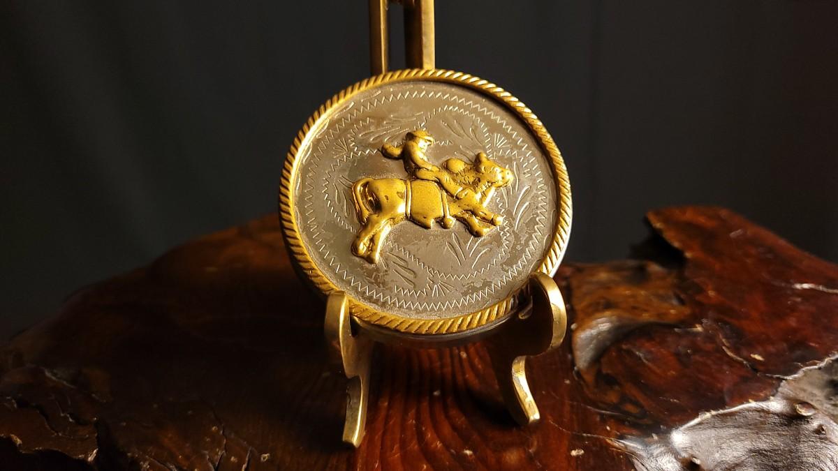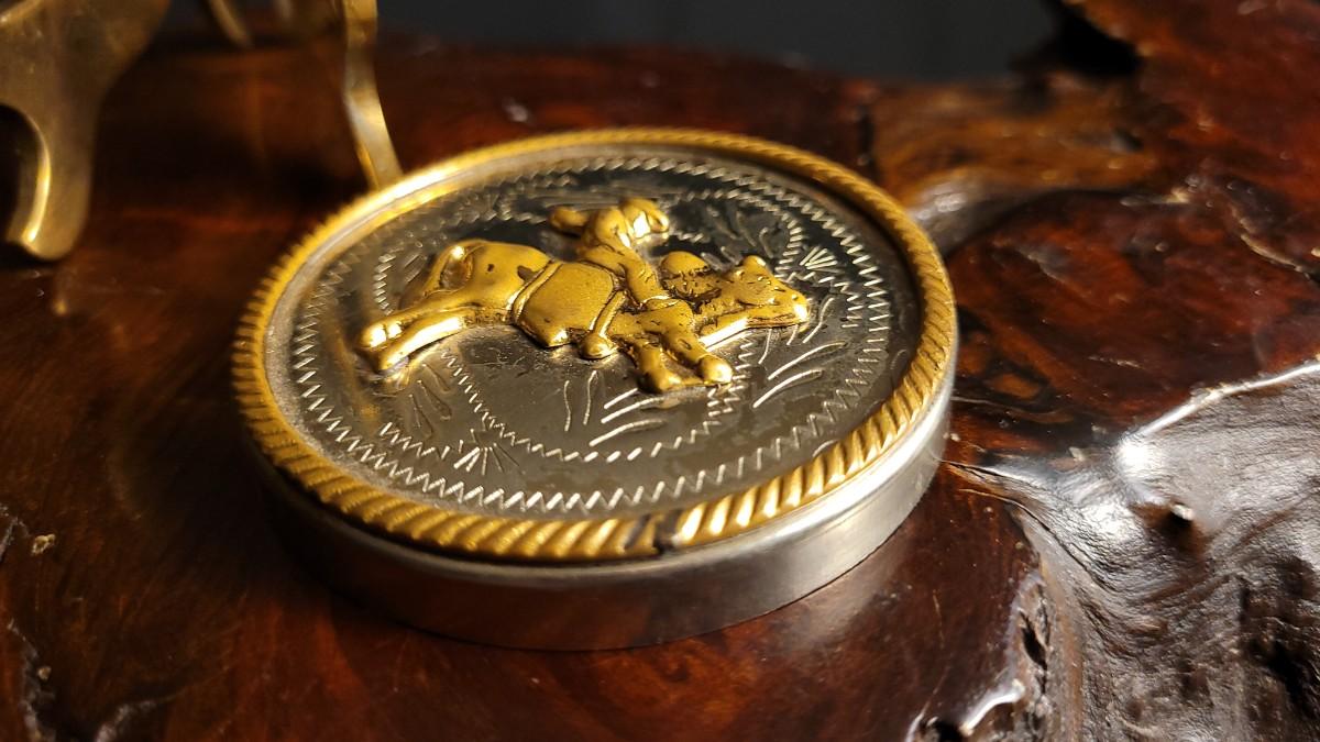 This lot features a fun Vintage German Silver Bullrider Artifact. Measures about 2.5" Wide. Unsure if this was originally the top to a Trinket Box or something else but would serve as a Collectible that has many different uses regardless of buyer. Unsure of the composition of the gold-tone center/outer sections.
