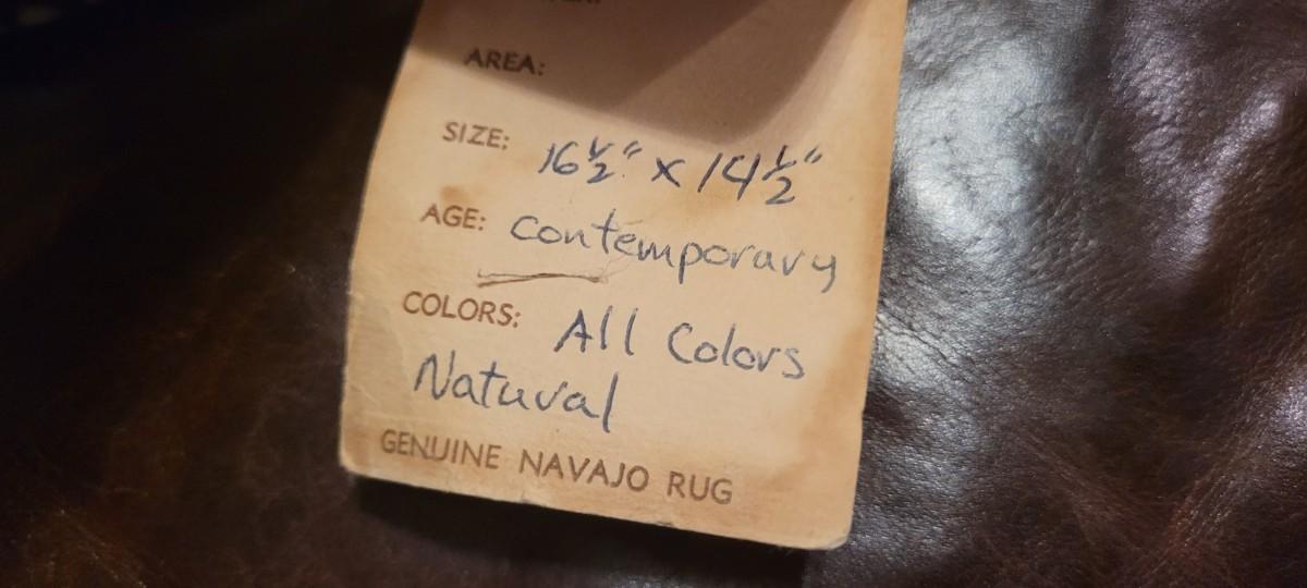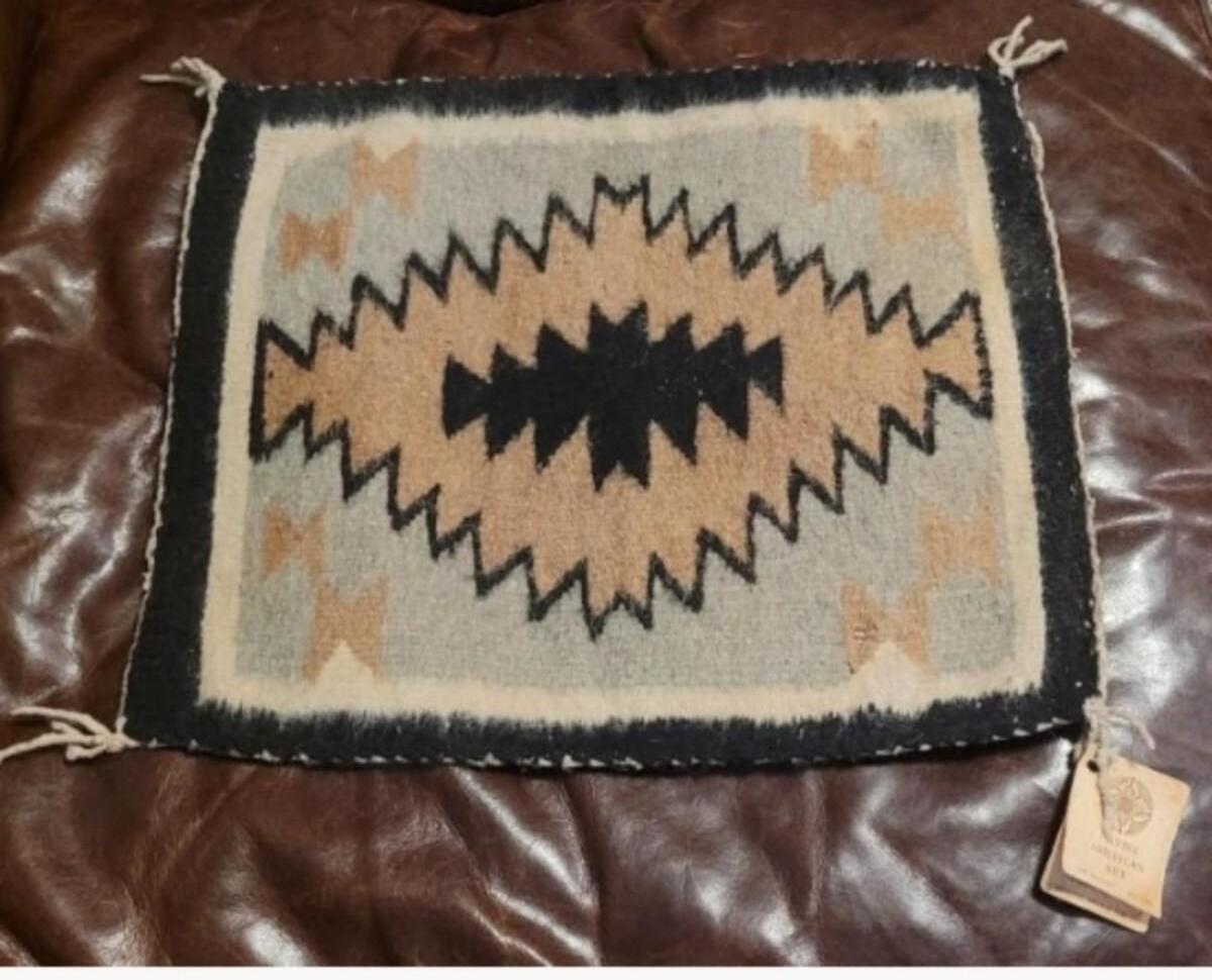 Colorful Vintage Navajo rug with Original authentication tag attached. All (4) tassels are intact. 16.5" x 14.5".