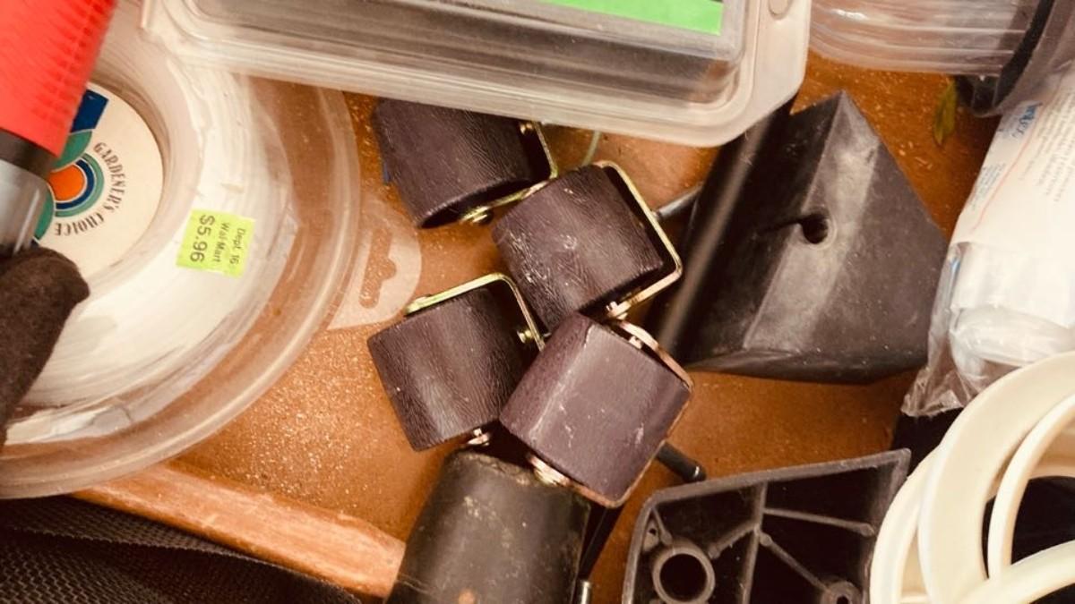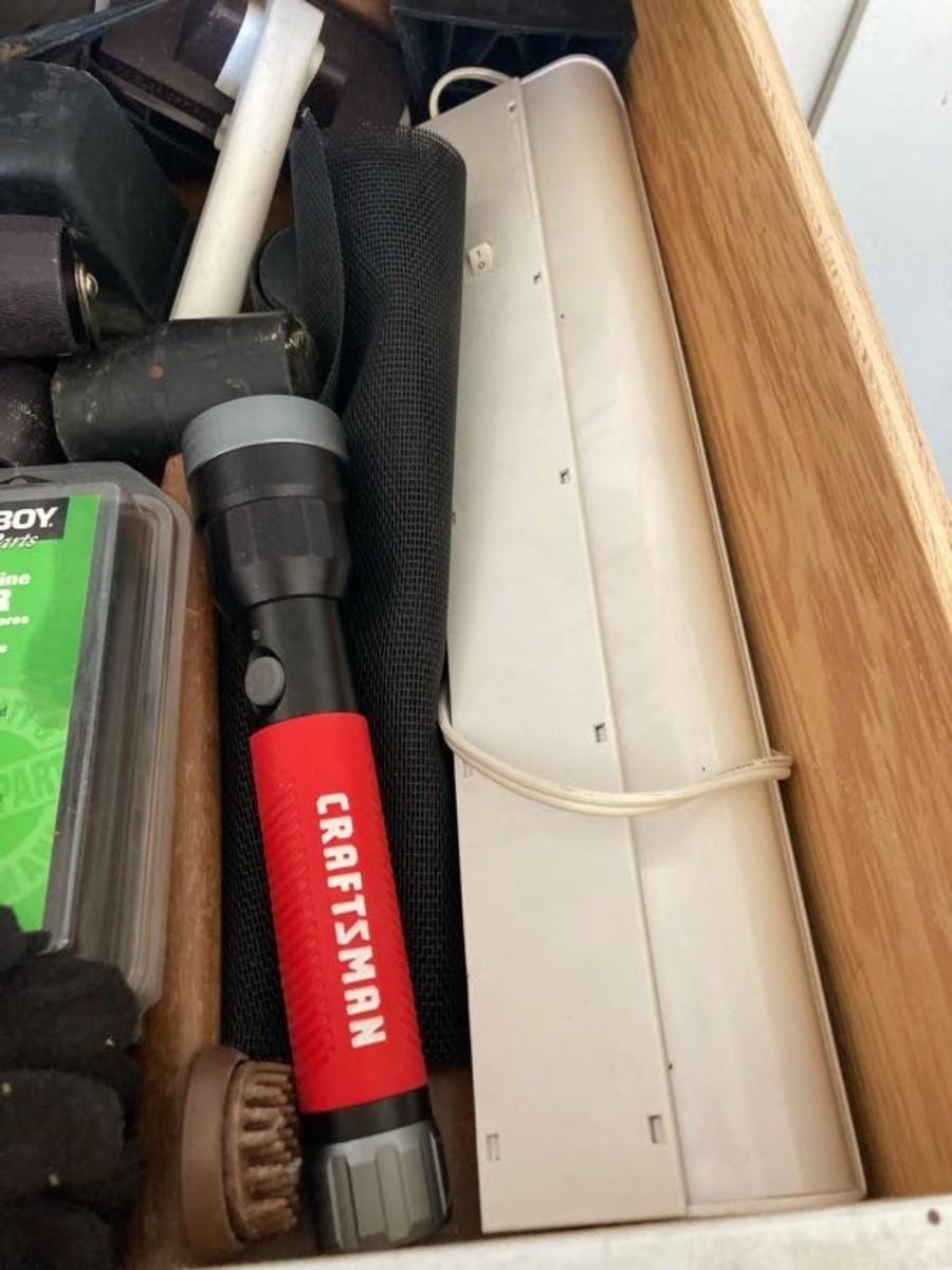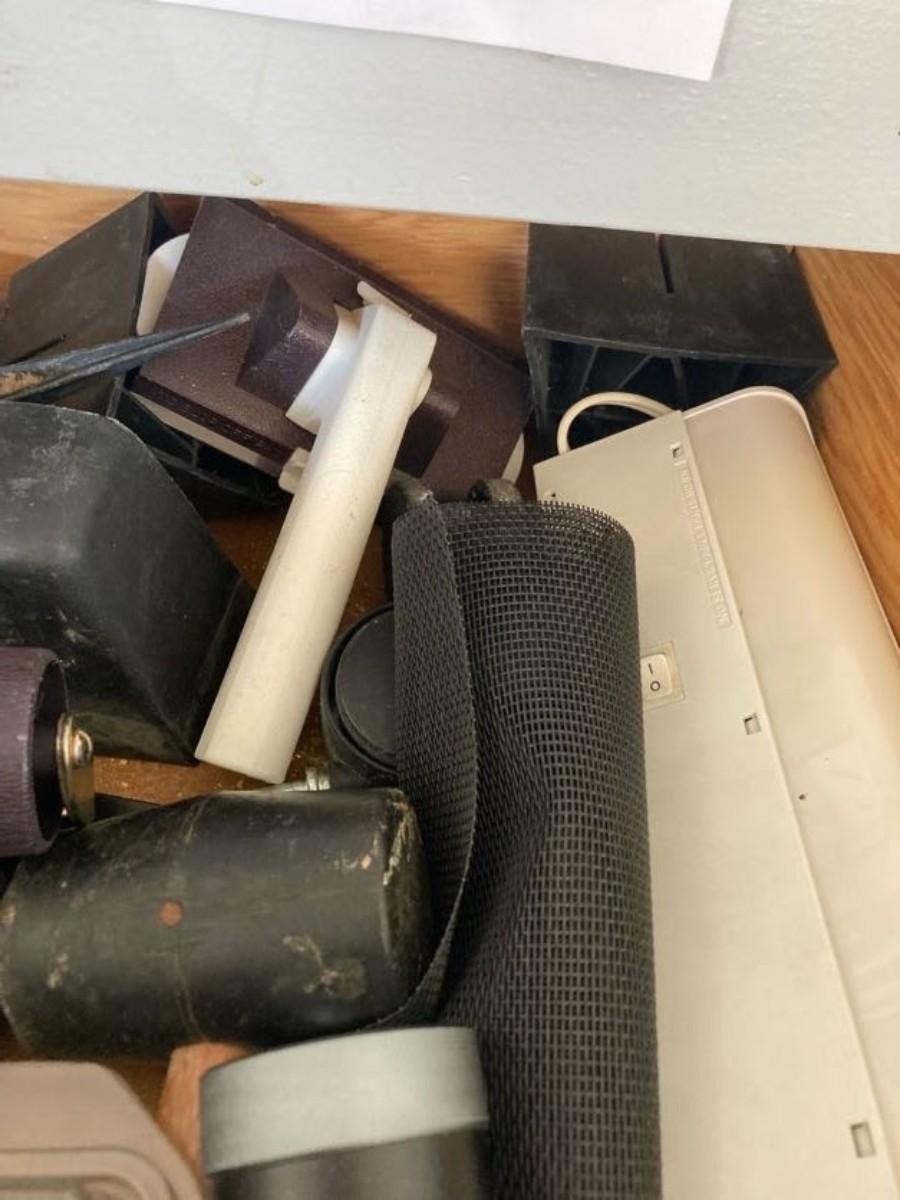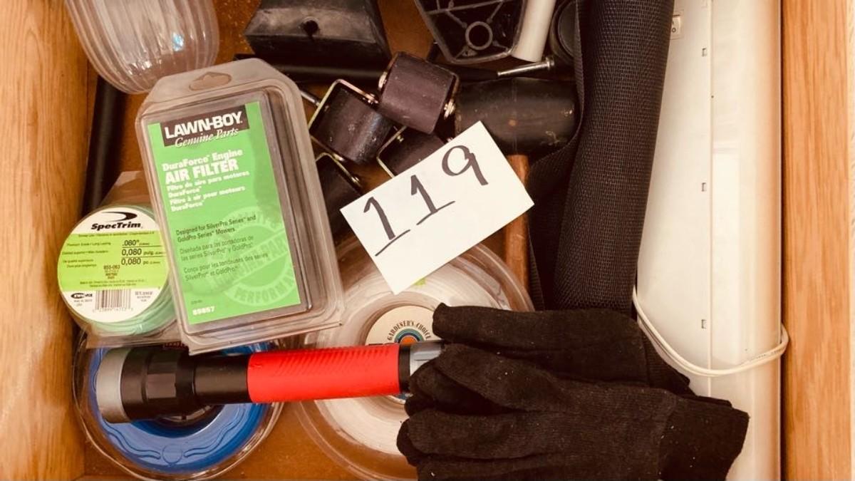 LOT 119  WEED WACKER LINE, FLASHLIGHT, DROP CLOTH, CASTERS AND MORE