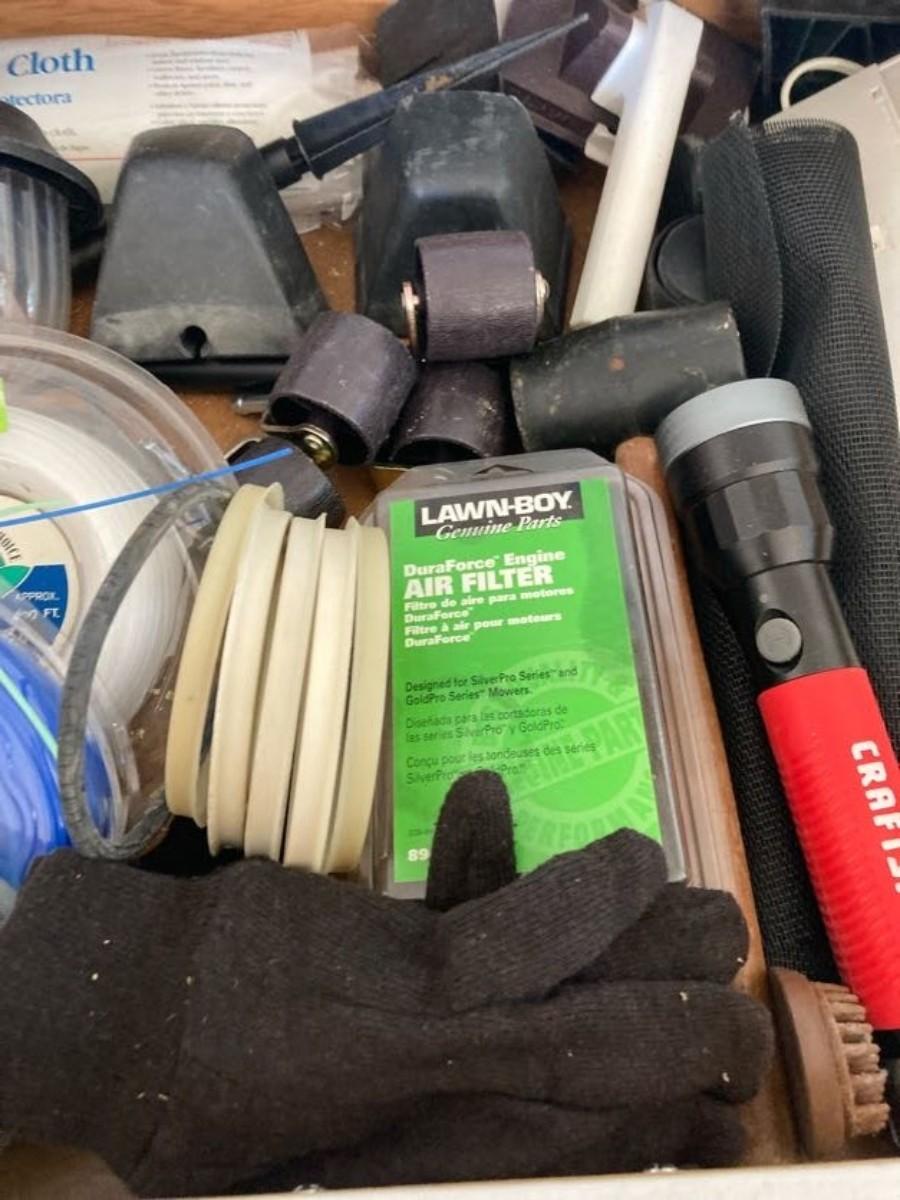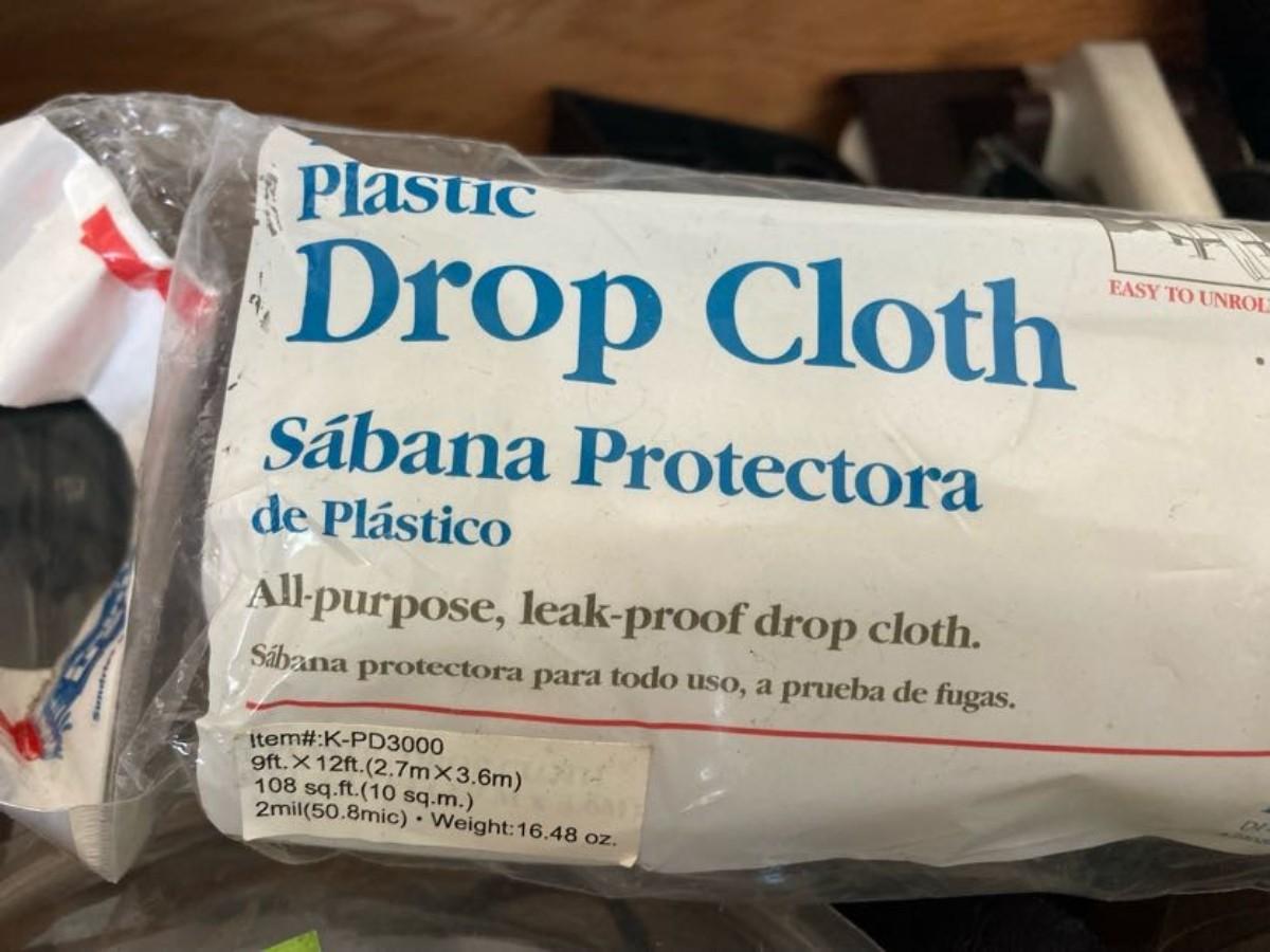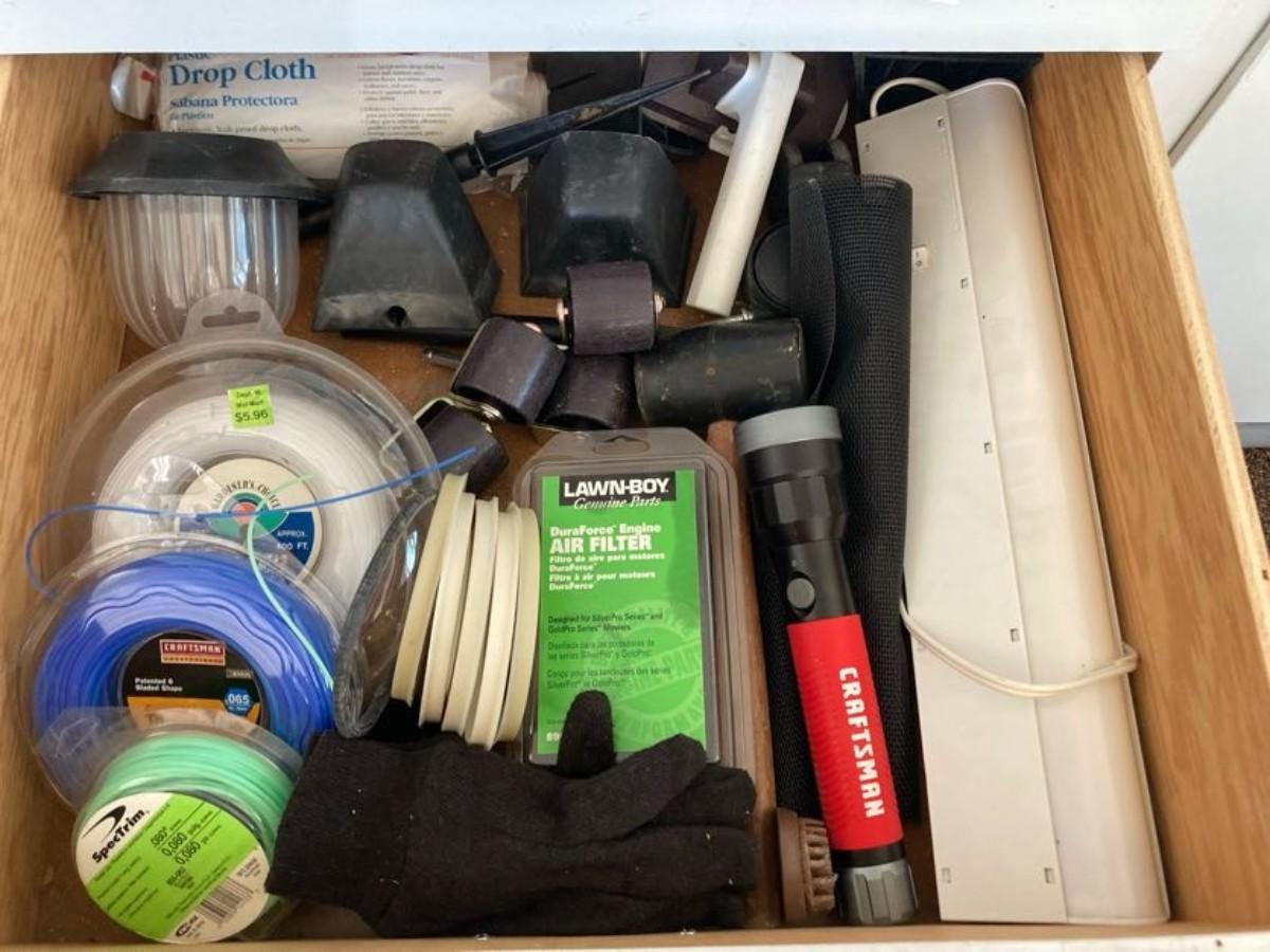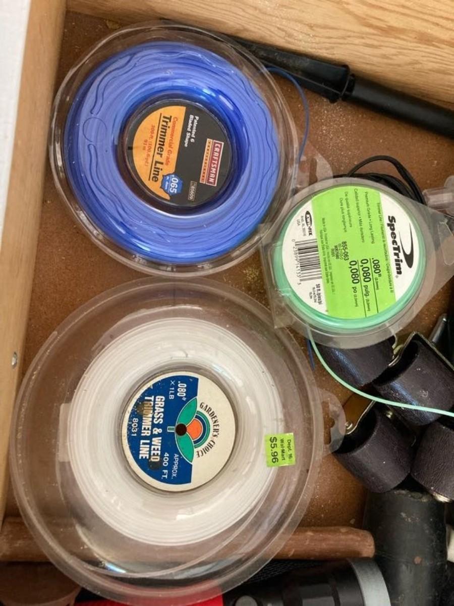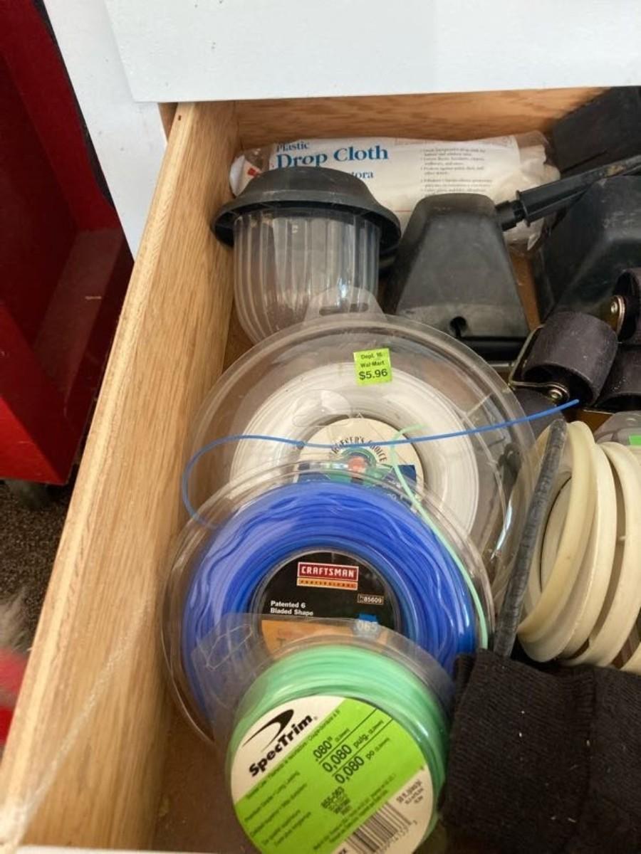 LOT 119 WEED WACKER LINE, FLASHLIGHT, DROP CLOTH, CASTERS AND MORE
