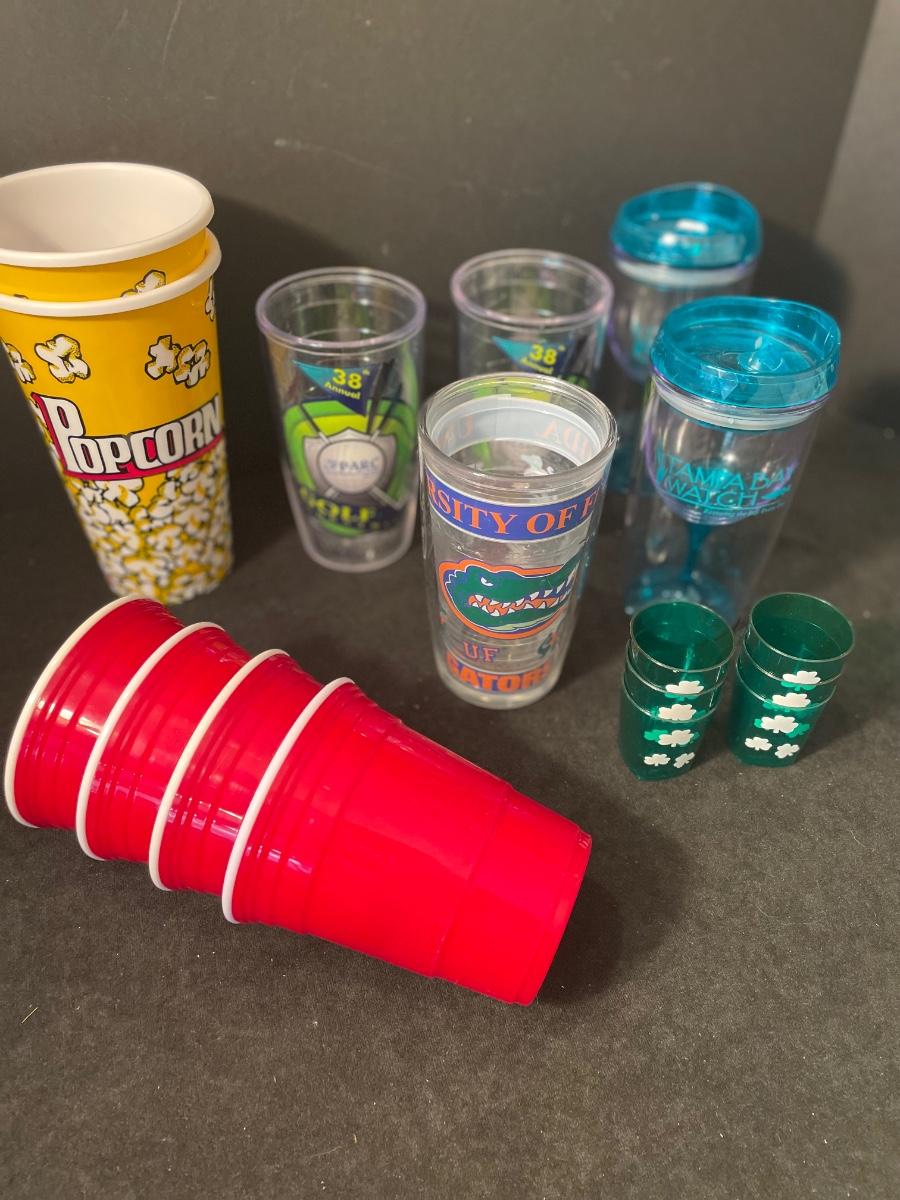Includes 6 shot glasses, 4 heavy duty "solo" type cups, 2 popcorn cups and 5 "Tervis" type cups.