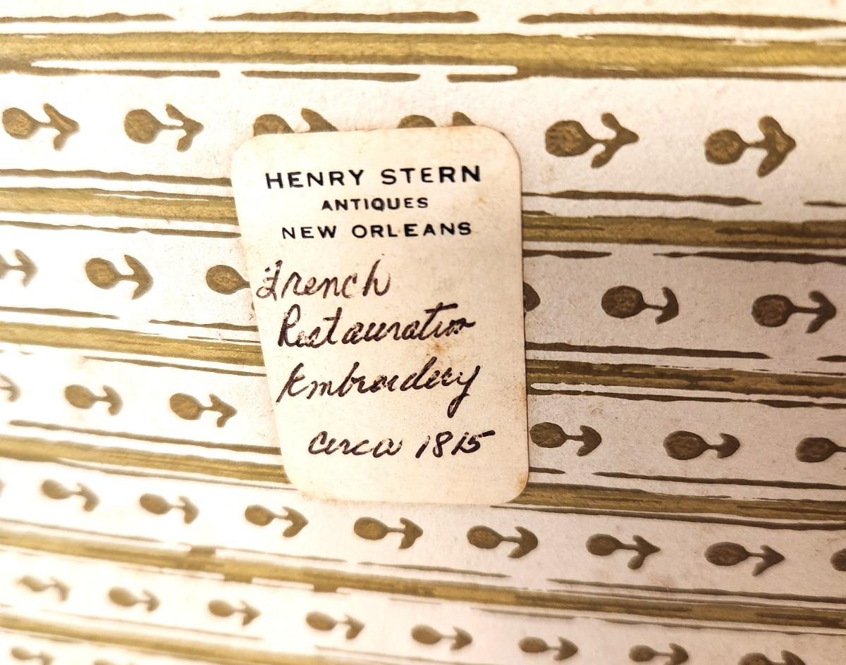 Signed piece of antique French embroidery/needlework - dated 3 March 1846, made by Charlotte Gebraud for her father, Charles Gebraud. Likely an image of his name-said, Saint Charles Borromeo. According to label on reverse, this was purchased at Henry Stern Antiques on Royal Street (closed in 1993) - in its day considered one of the top French Quarter antique shops. Measures 28" across, 22" tall. Antique condition - some browning/foxing at the bottom.